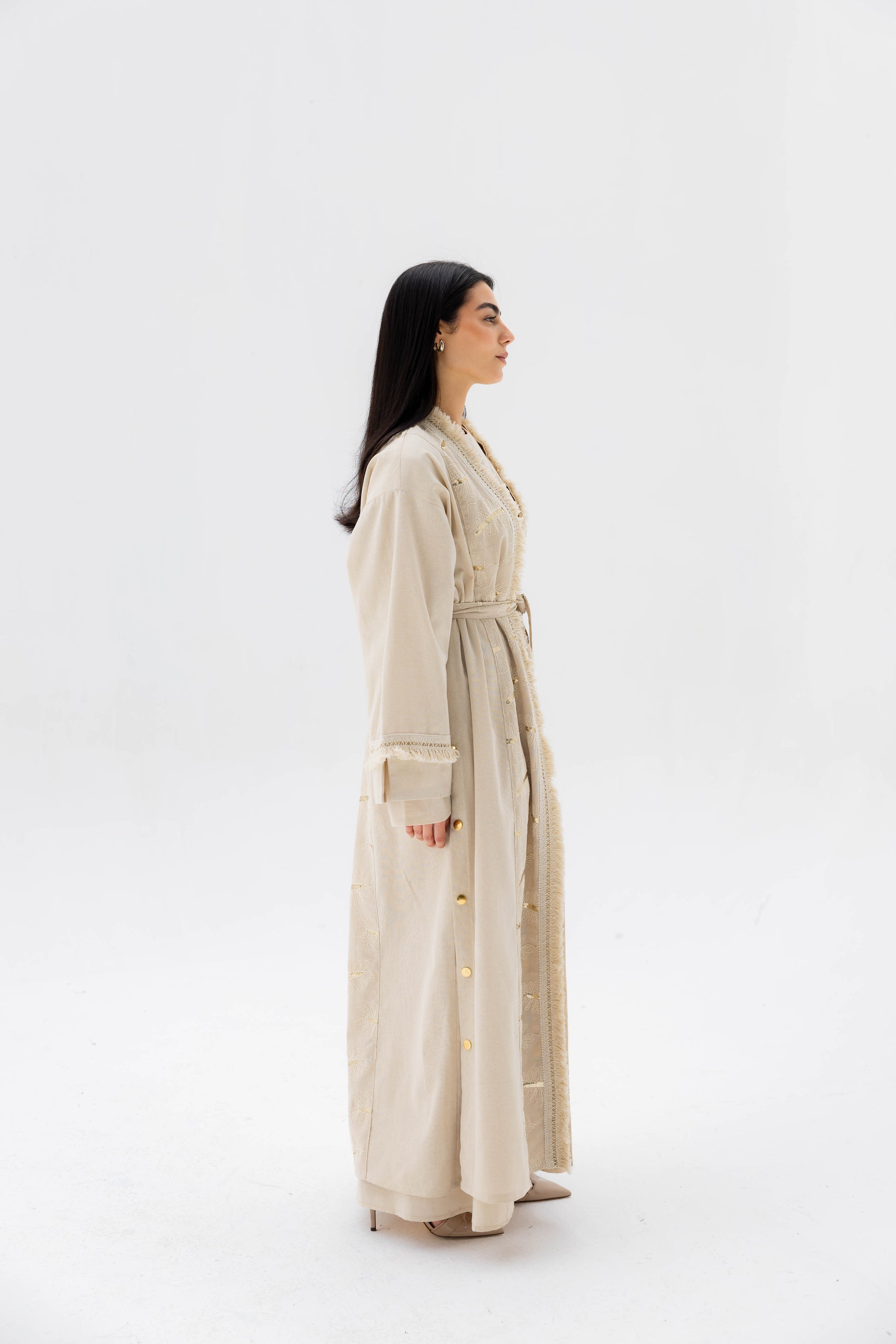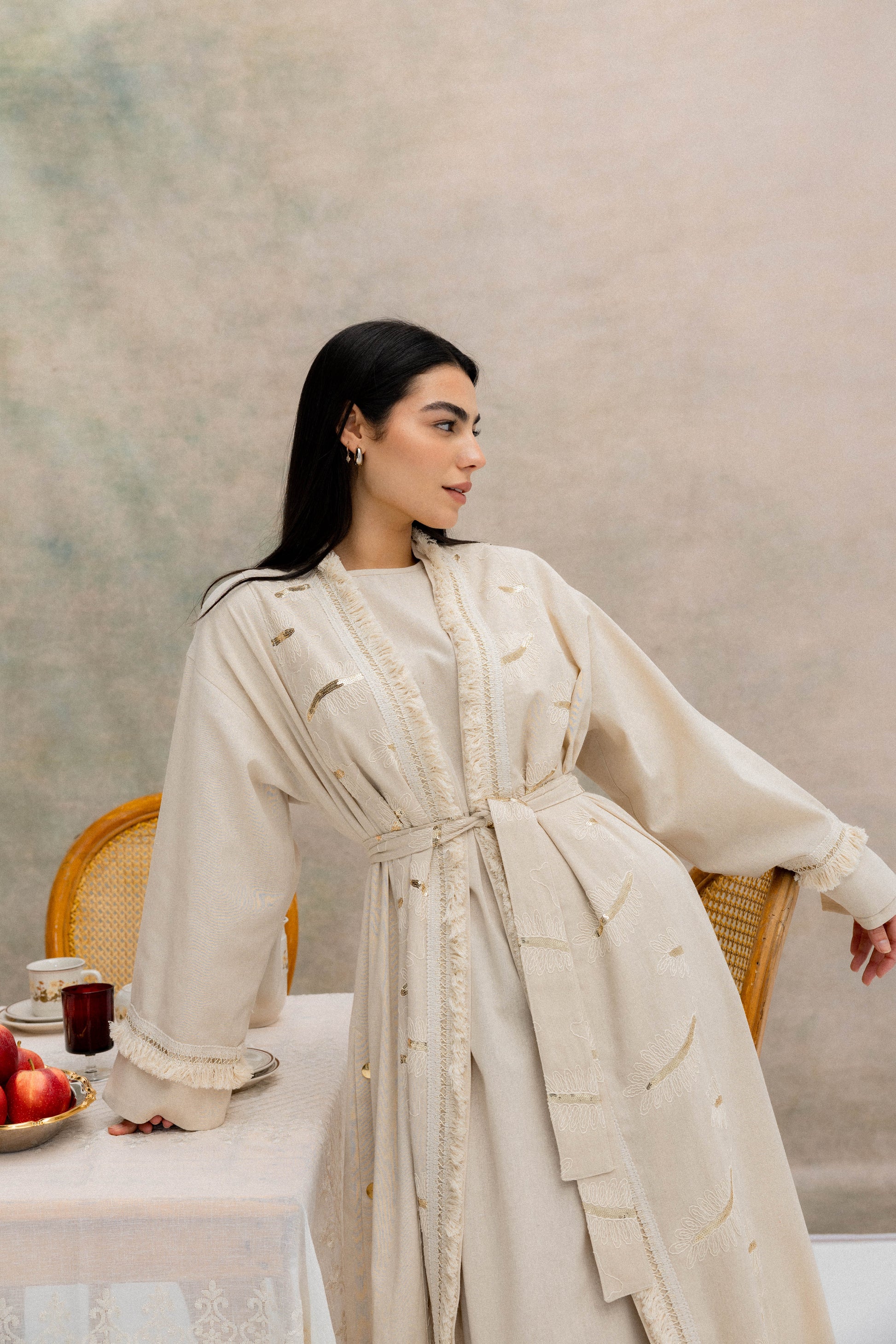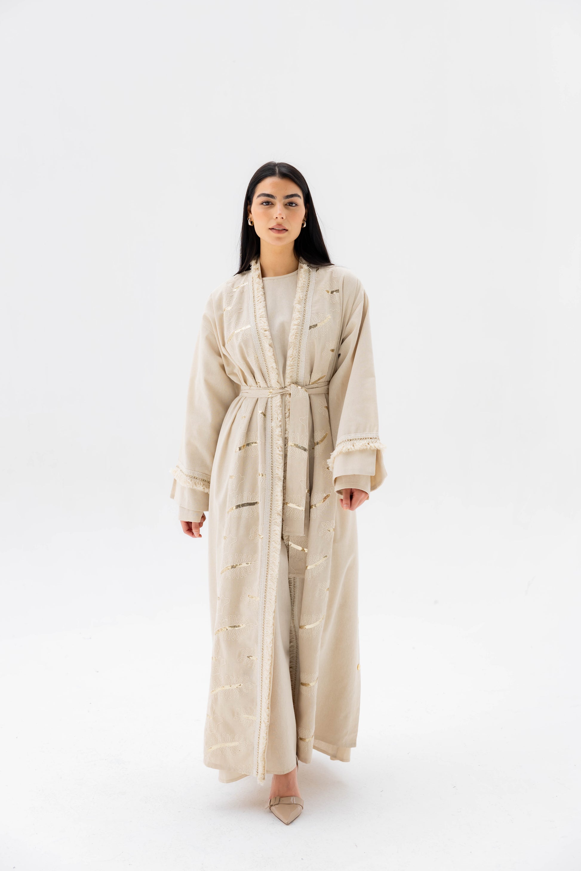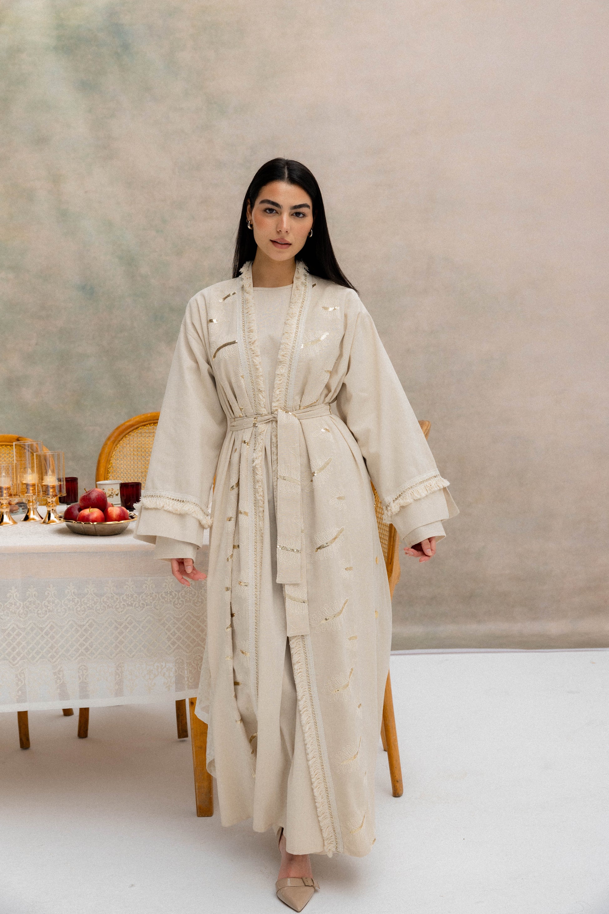 A graceful expression of understated luxury. The Rimāl Shine Kaftan features a long, flowing silhouette crafted from a soft, lightweight fabric with delicate subtle sheen details that catch the light beautifully. Designed with an open-front style and a waist tie for adjustable shaping, it drapes effortlessly while maintaining comfort and elegance. Perfect for special occasions or refined everyday wear.