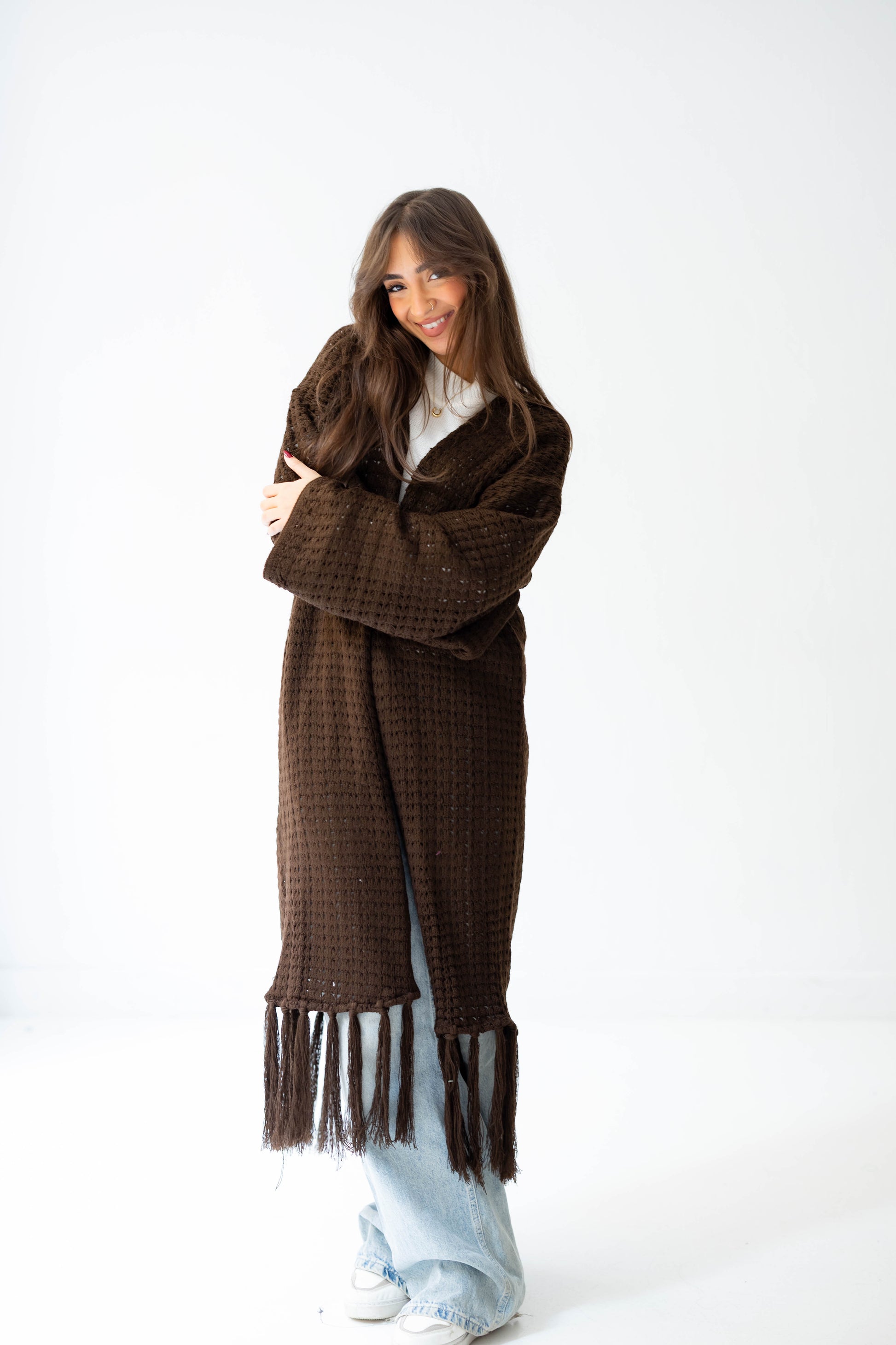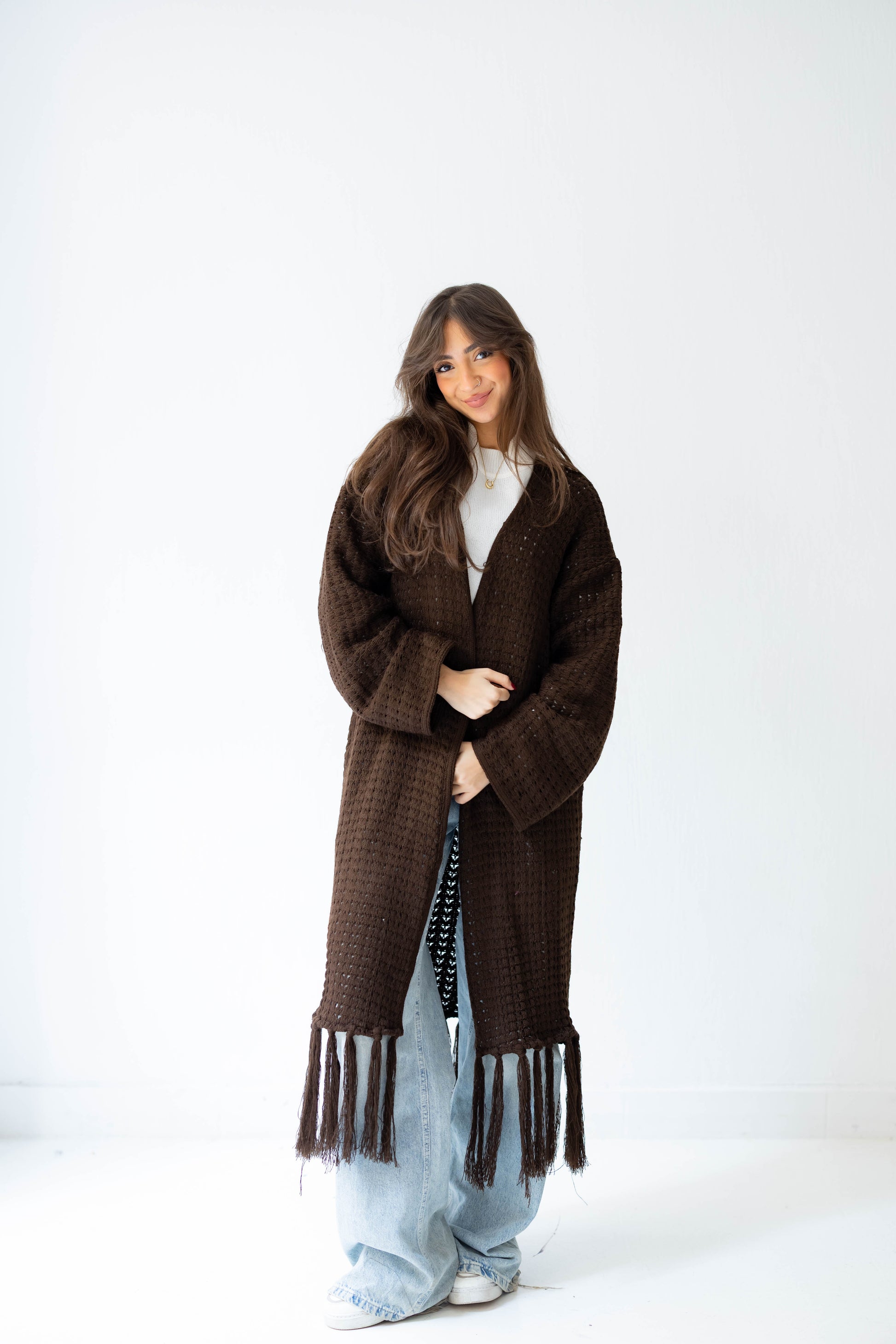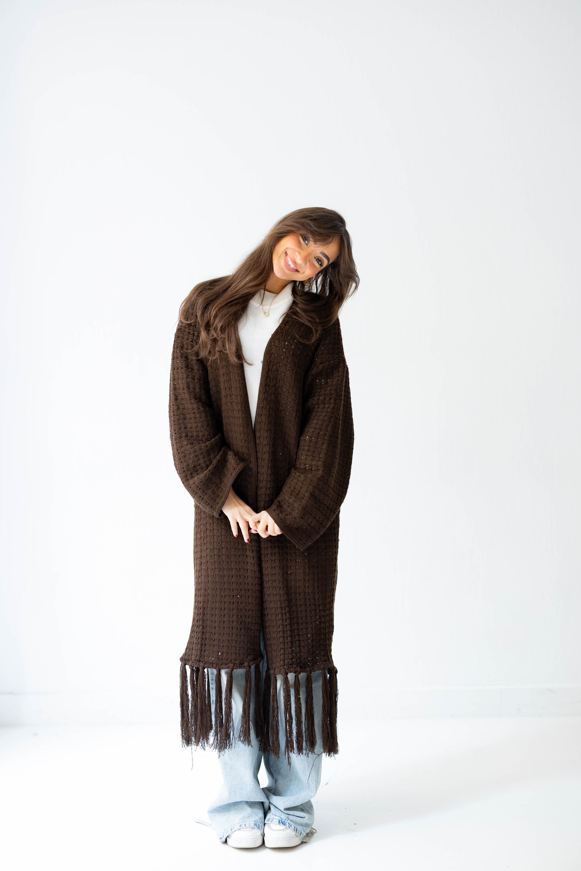 Layer up in effortless boho style with the Boho Fringed Cardigan – a long, soft knitted piece with playful fringes cascading down, adding movement and charm to any outfit