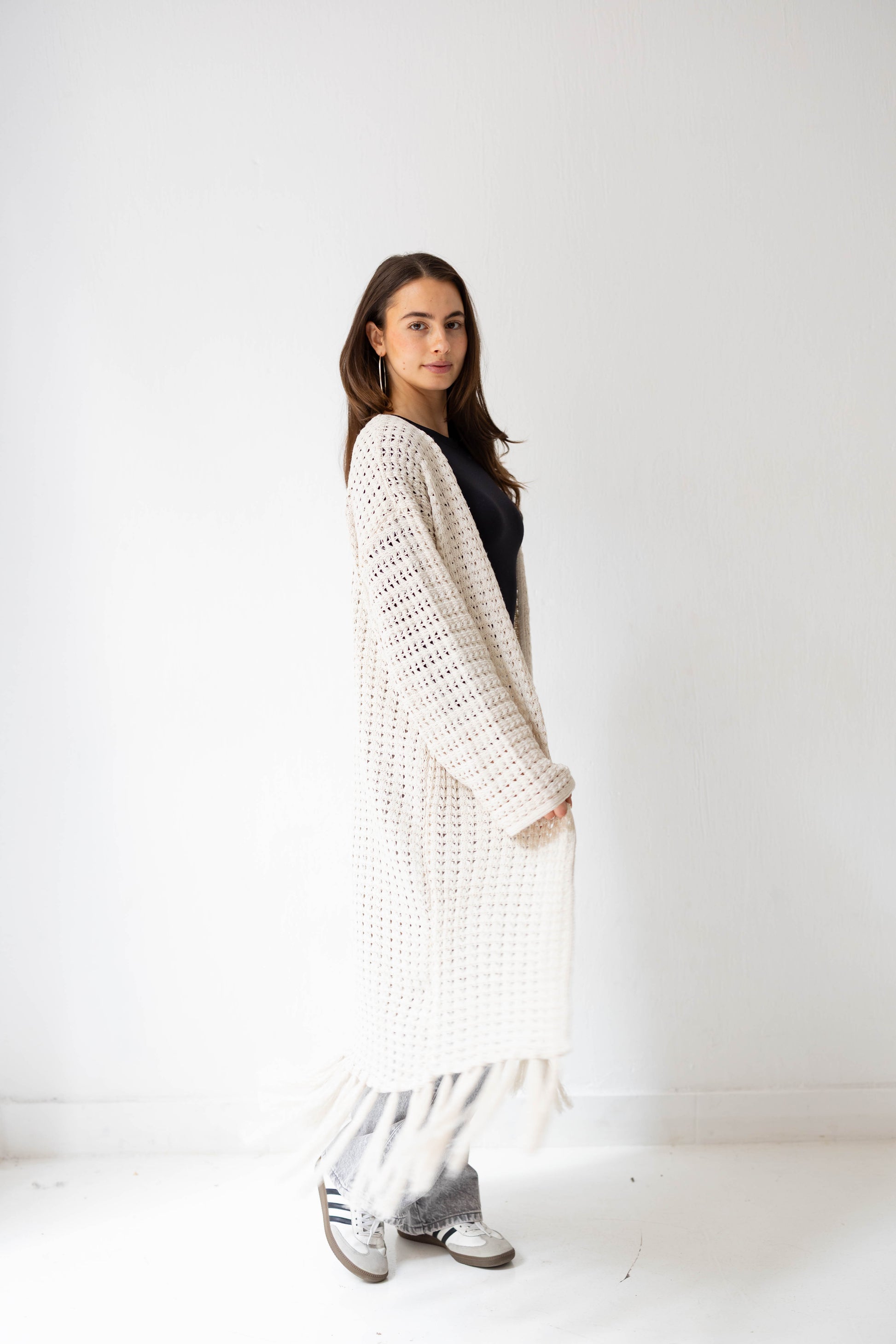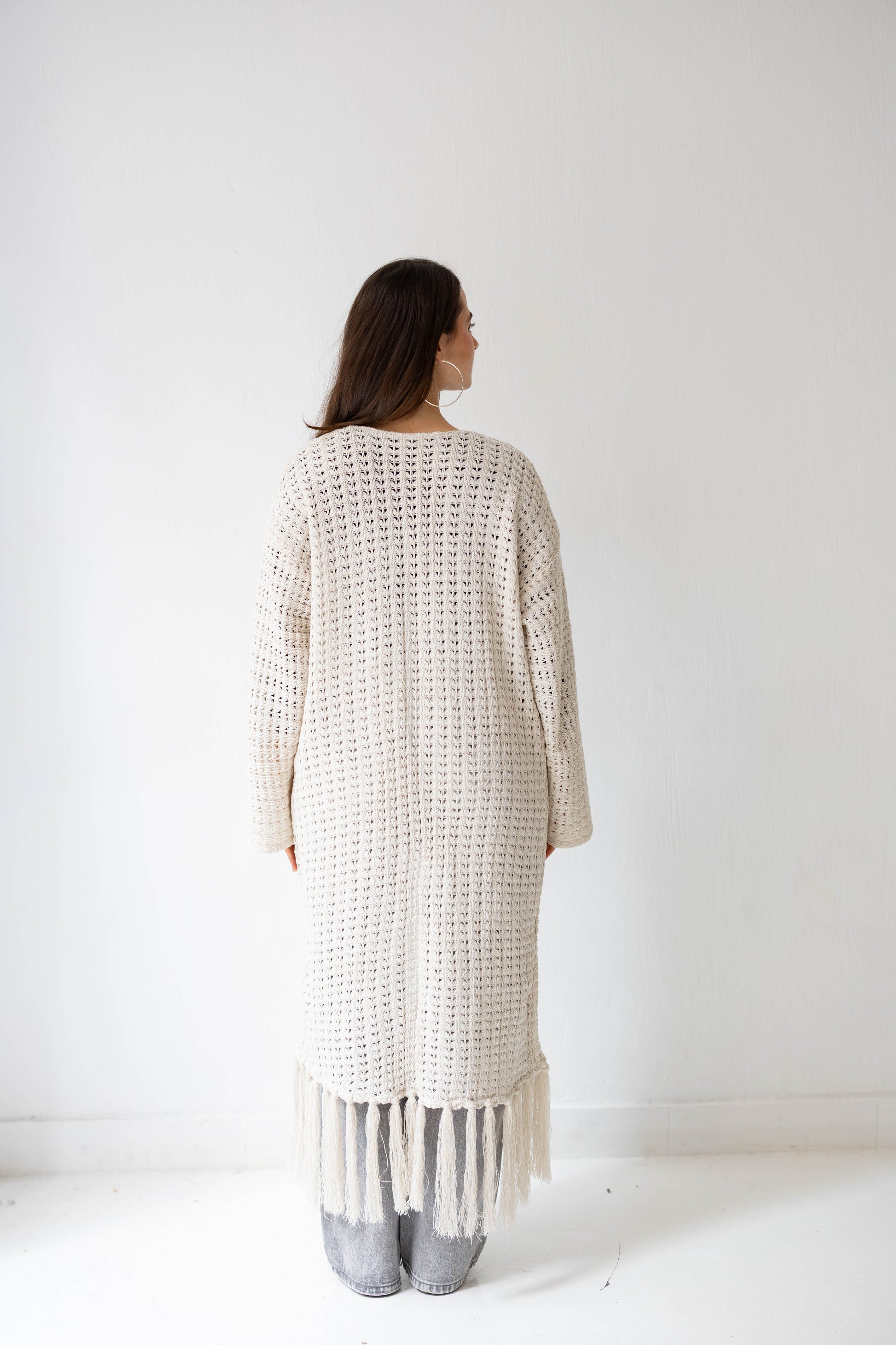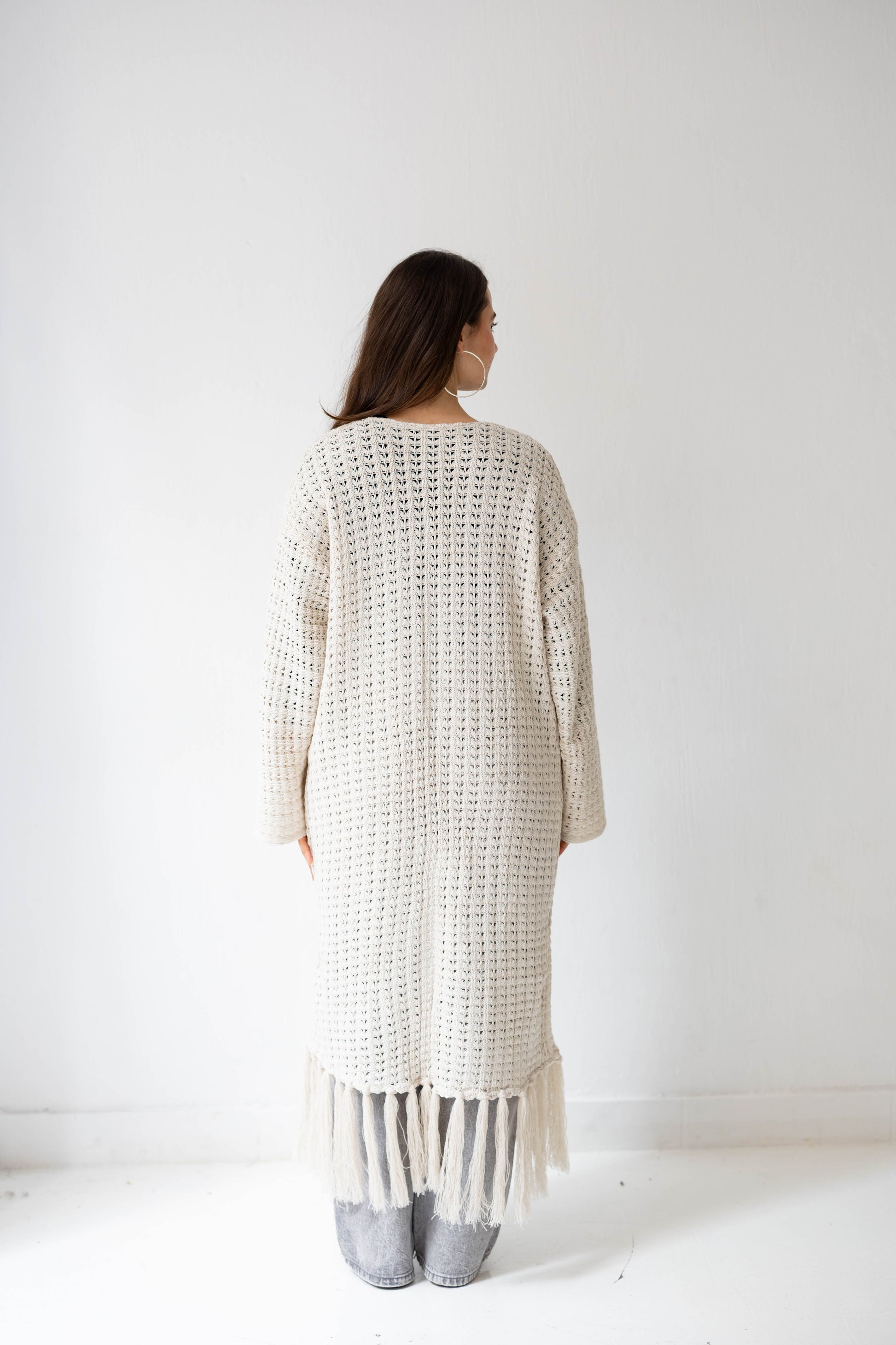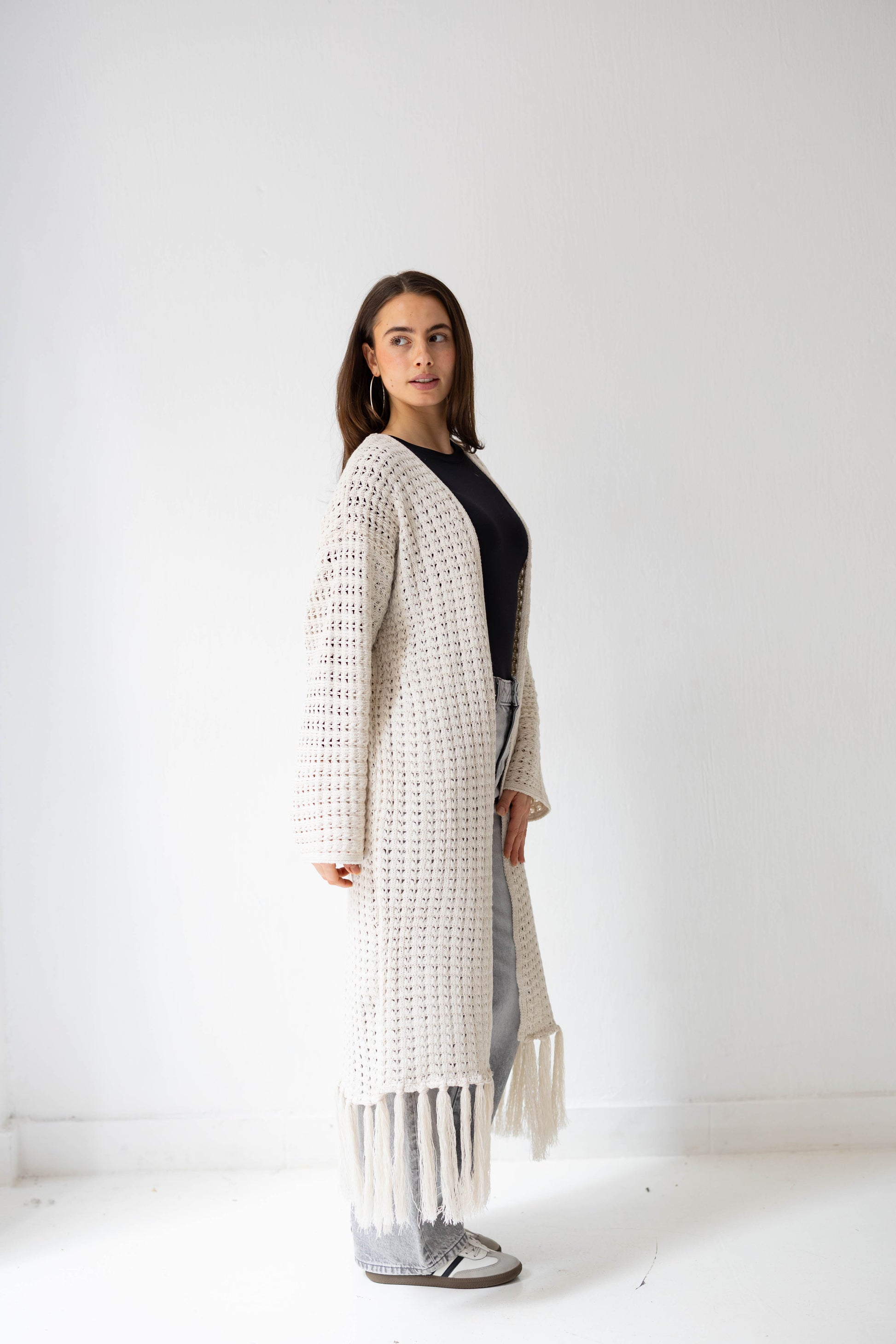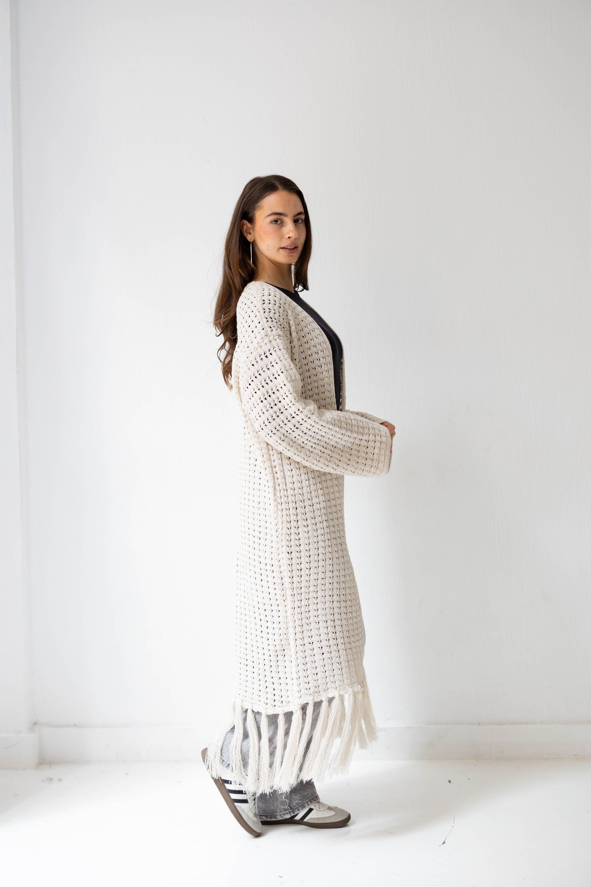 Layer up in effortless boho style with the Boho Fringed Cardigan – a long, soft knitted piece with playful fringes cascading down, adding movement and charm to any outfit