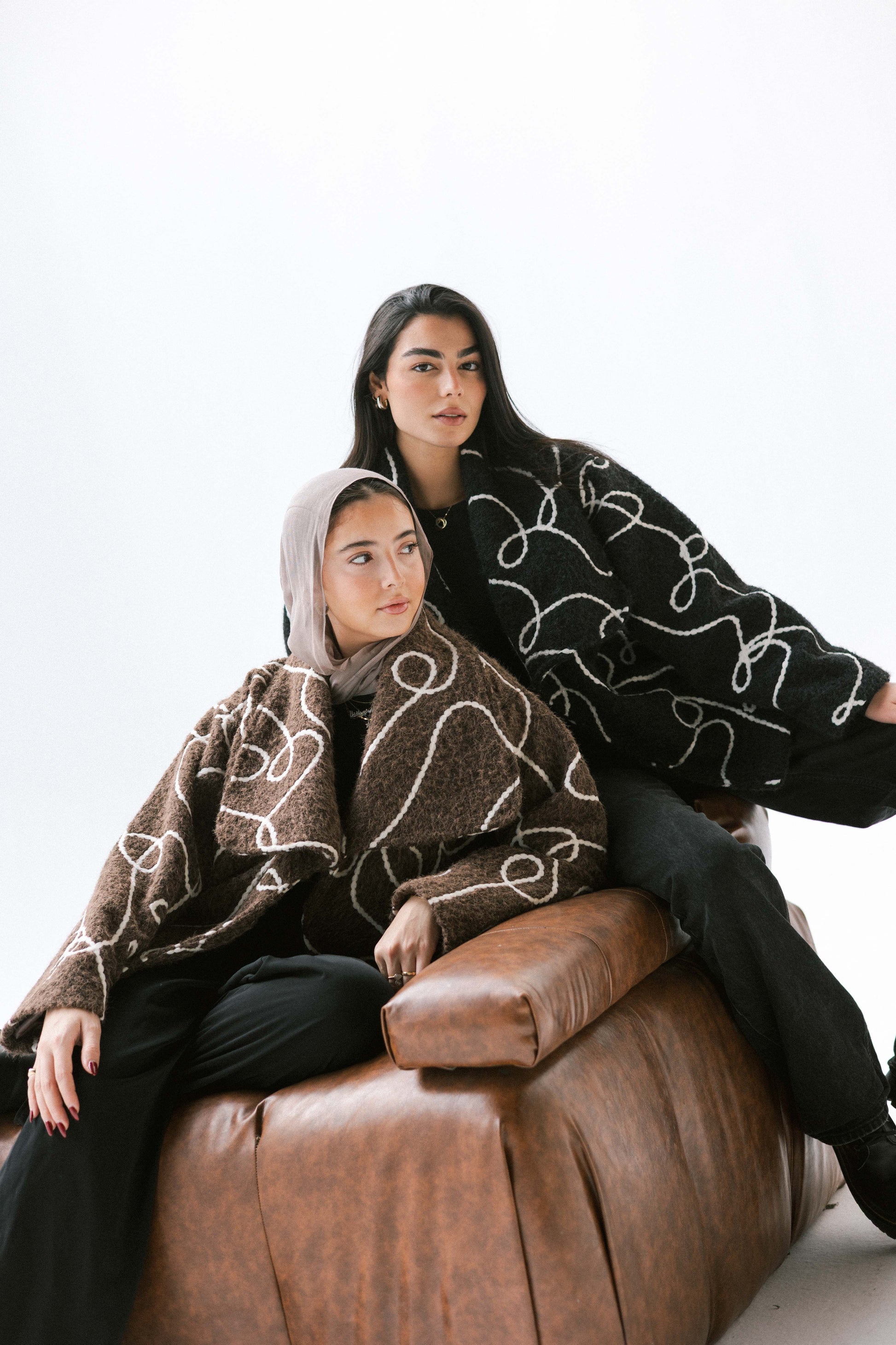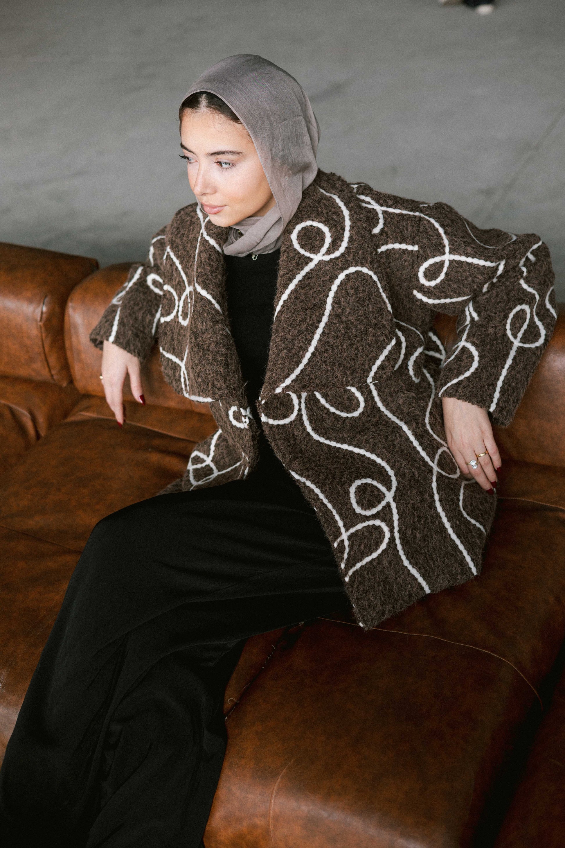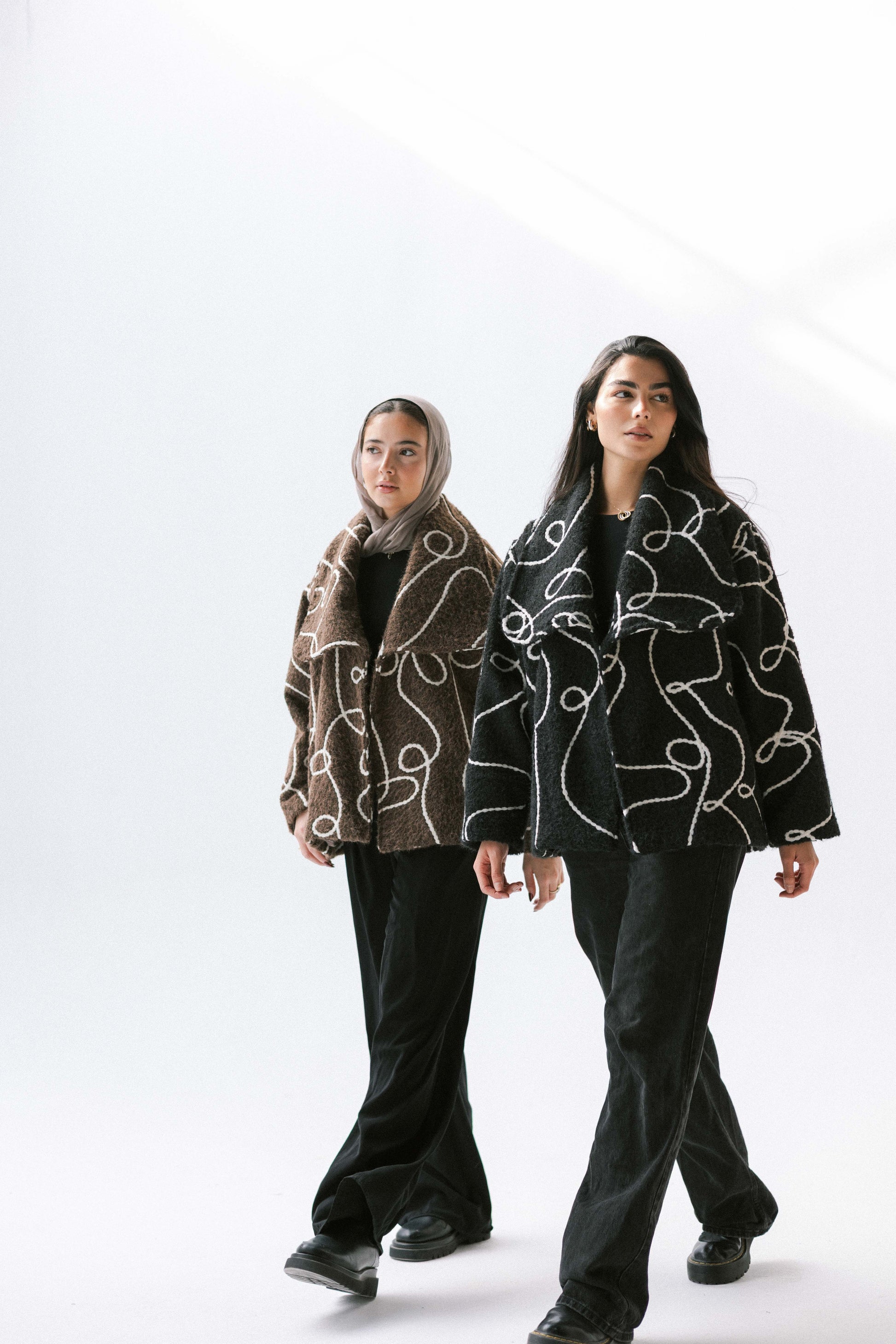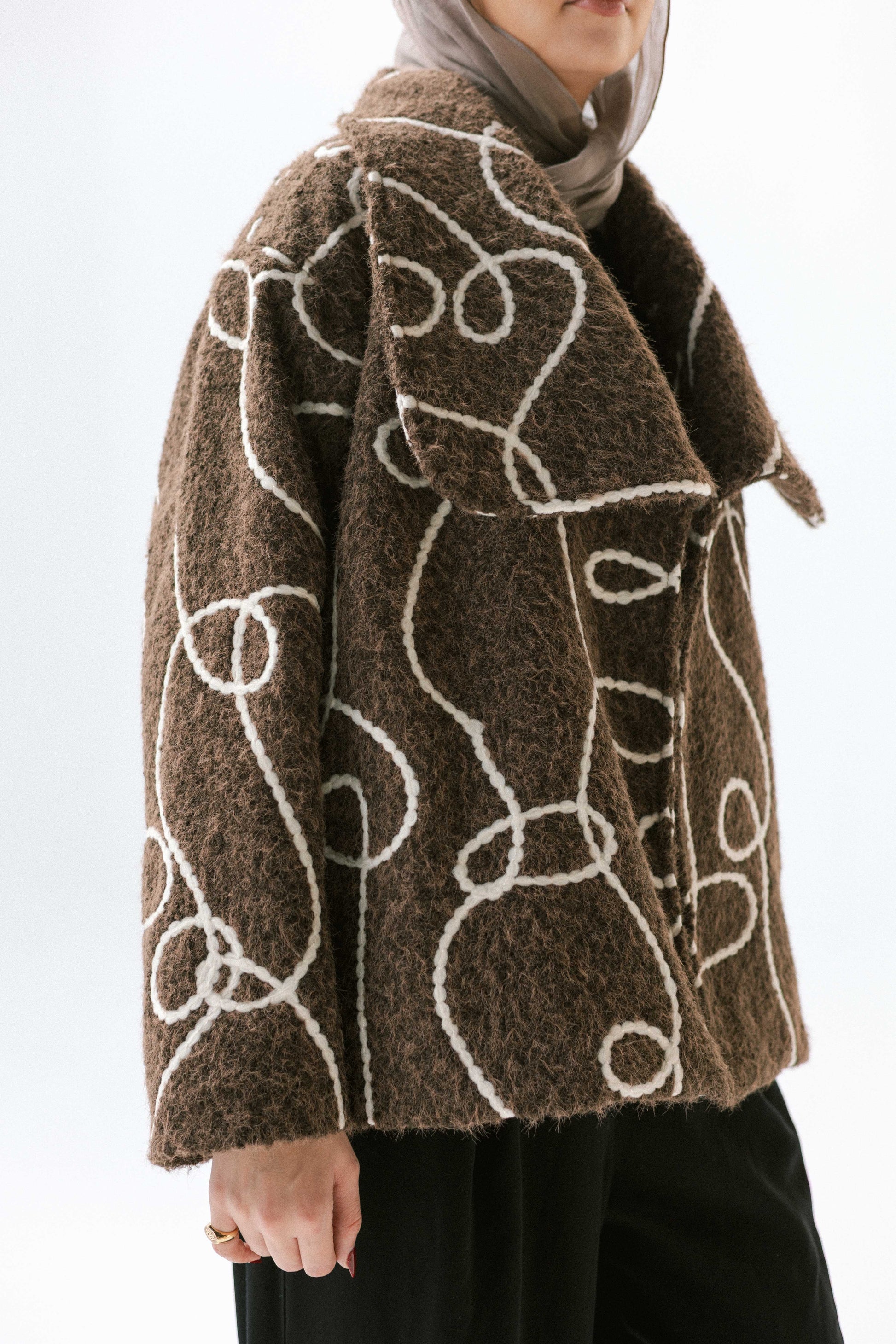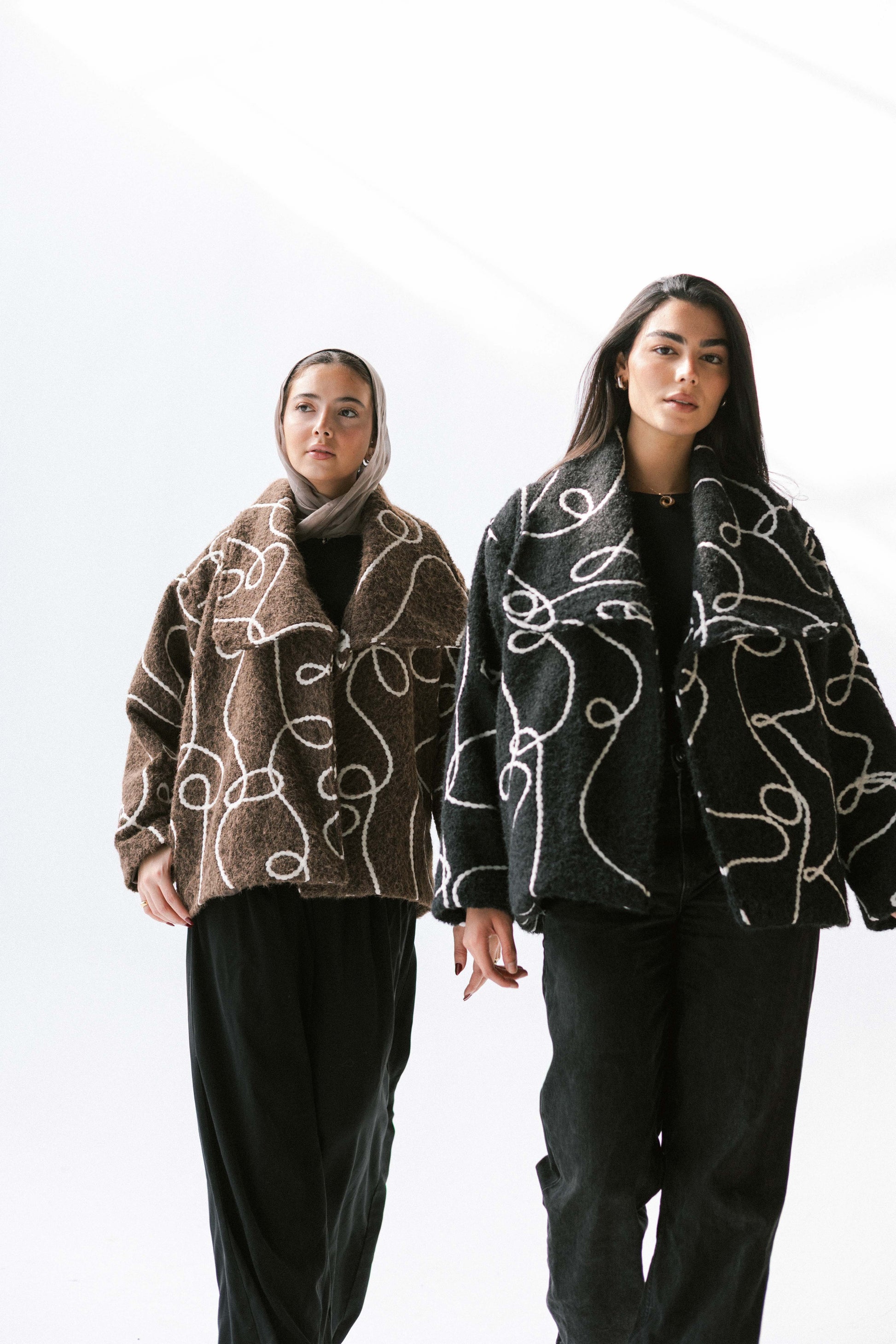 A statement winter jacket crafted from textured wool, featuring abstract embroidered lines that add an artistic, modern touch. Designed with soft contrast detailing, Celeste combines comfort, elegance, and effortless sophistication. Perfect for layering and elevating everyday winter looks.