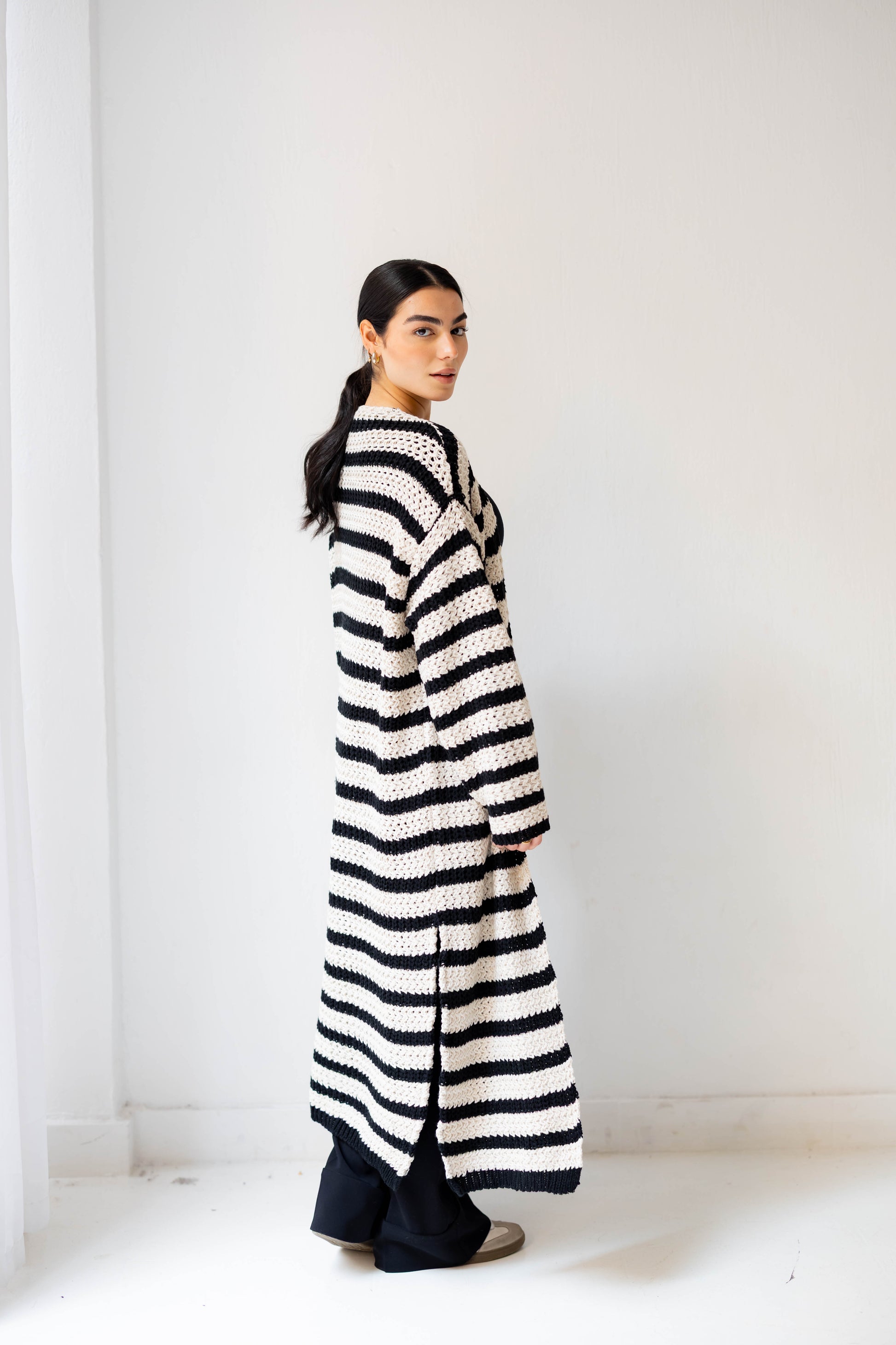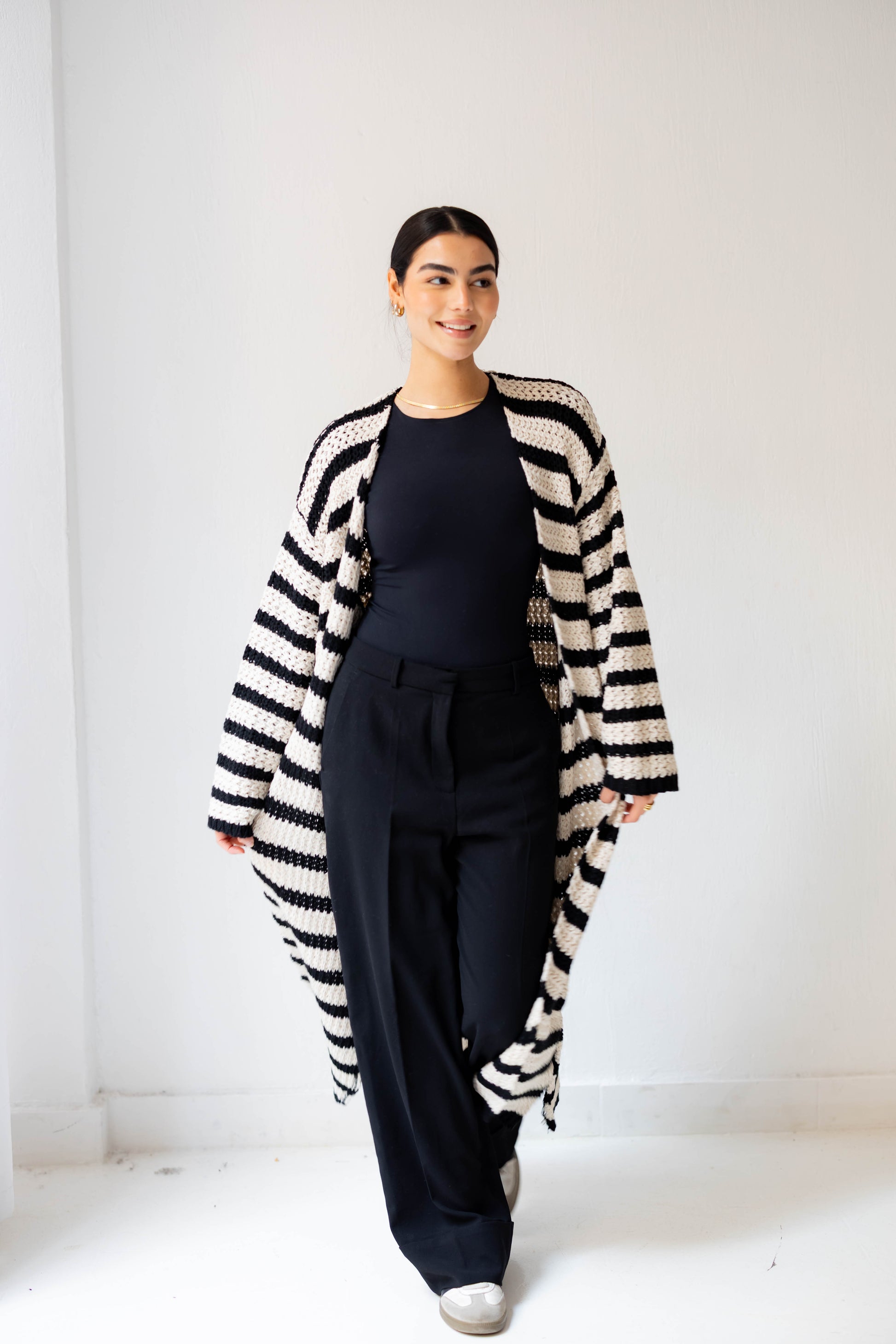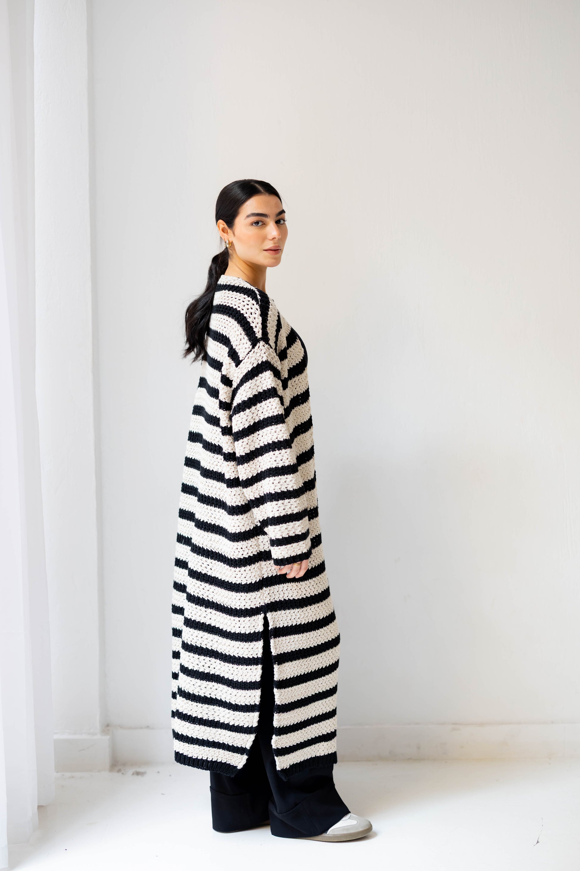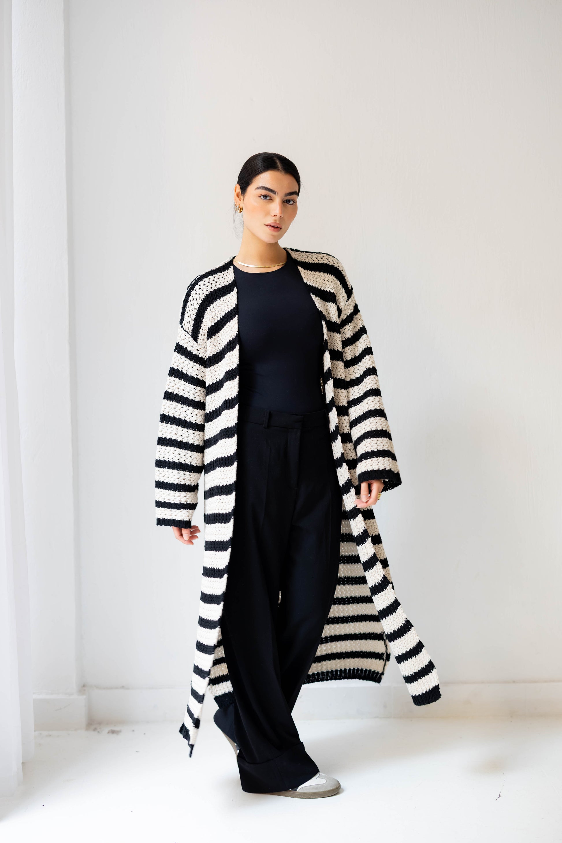 A soft, flowing long knit designed with subtle wave-like stripes and two effortless side slits for natural movement. Lightweight, cozy, and perfect for layering, this cardigan brings a relaxed, modern elegance to any outfit. Easy to style, beautifully breathable, and made to elevate your everyday look with calm, fluid charm. 💫