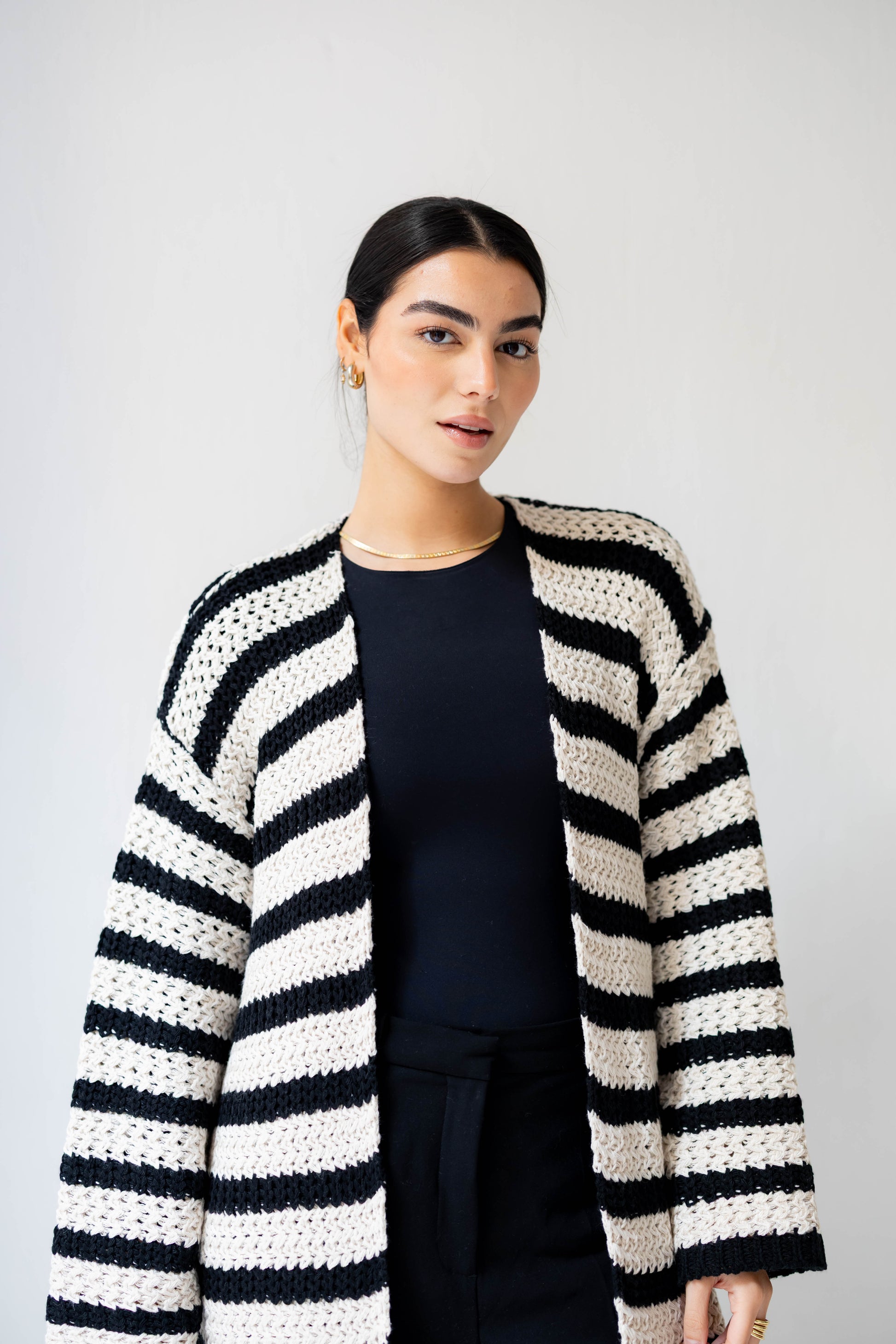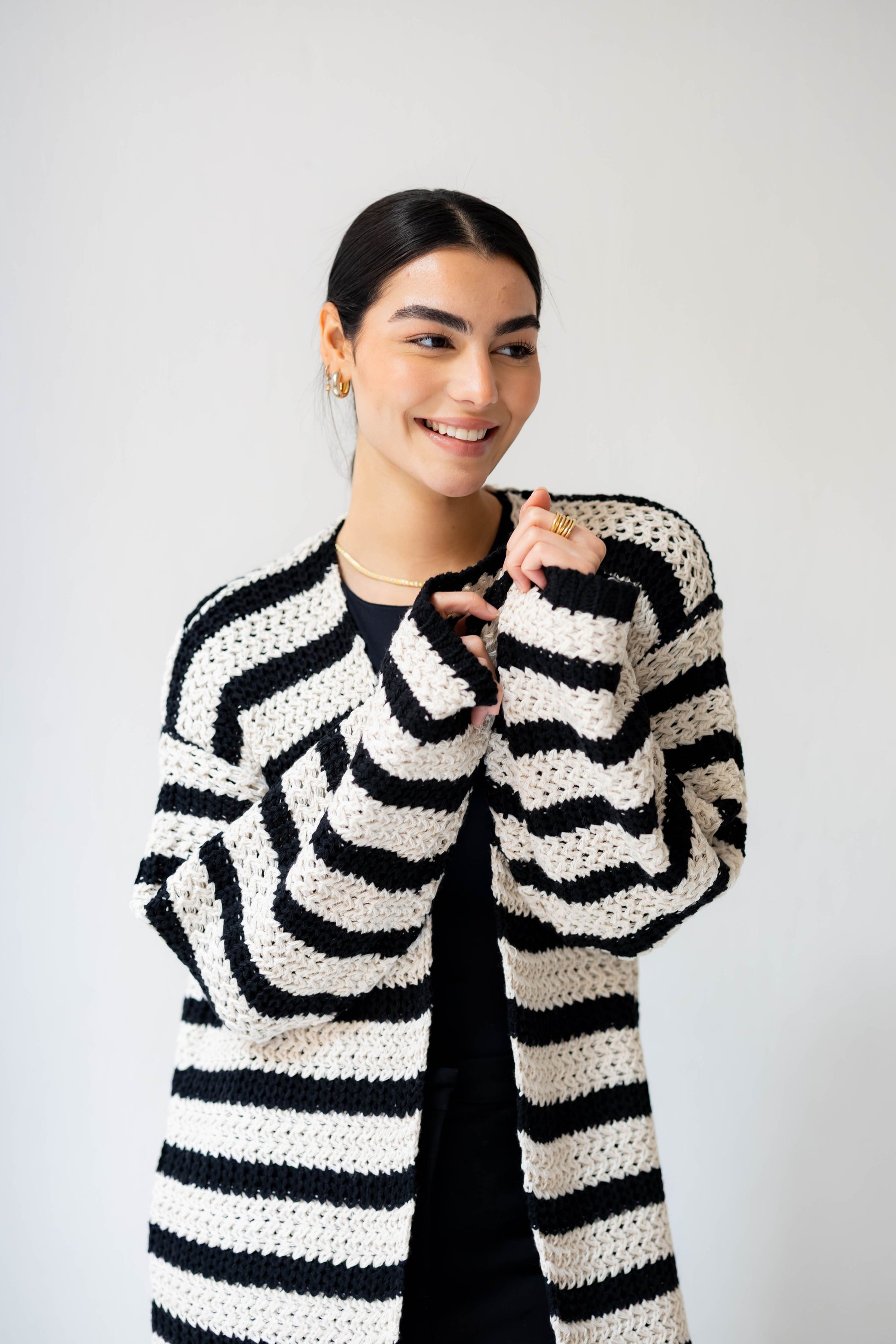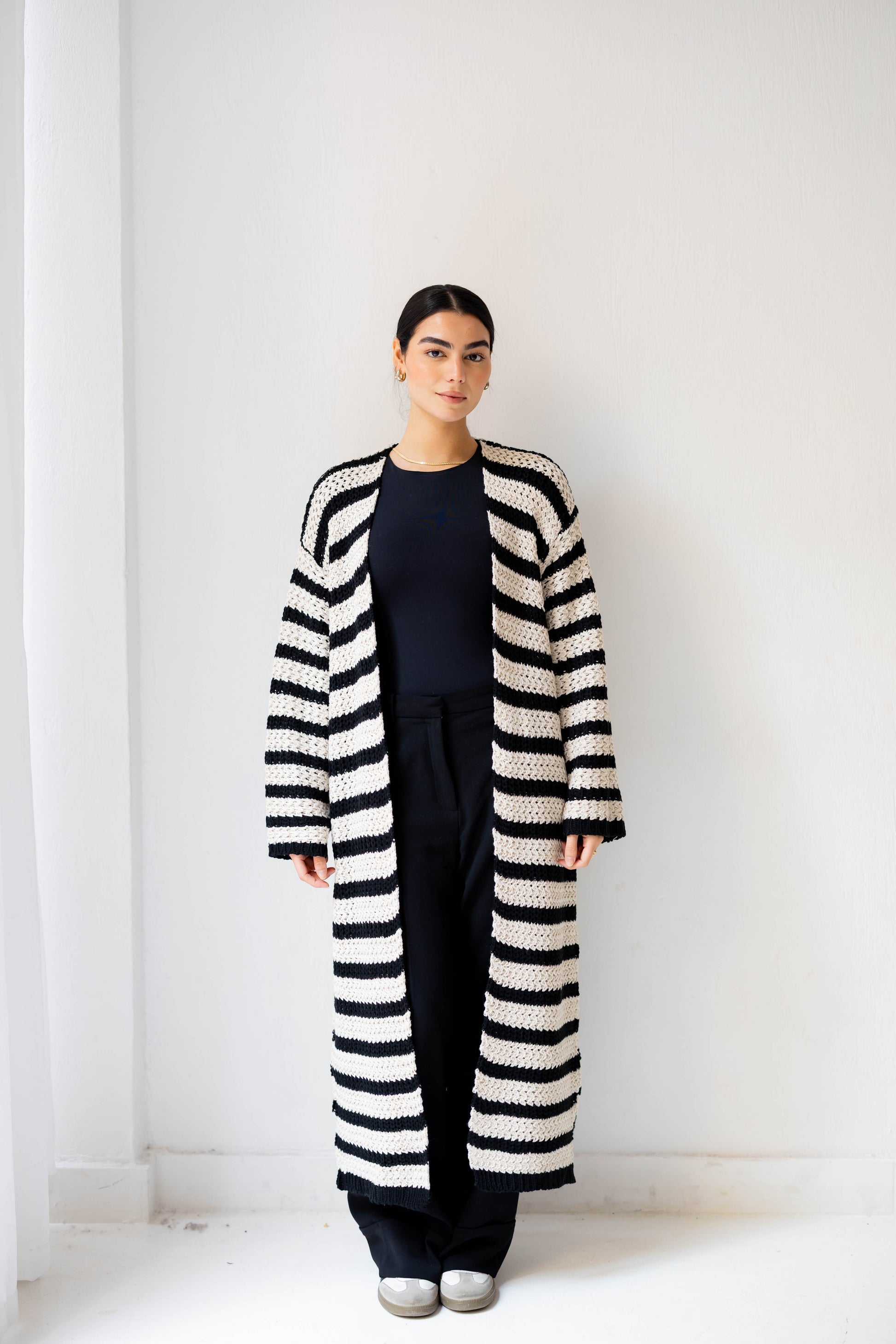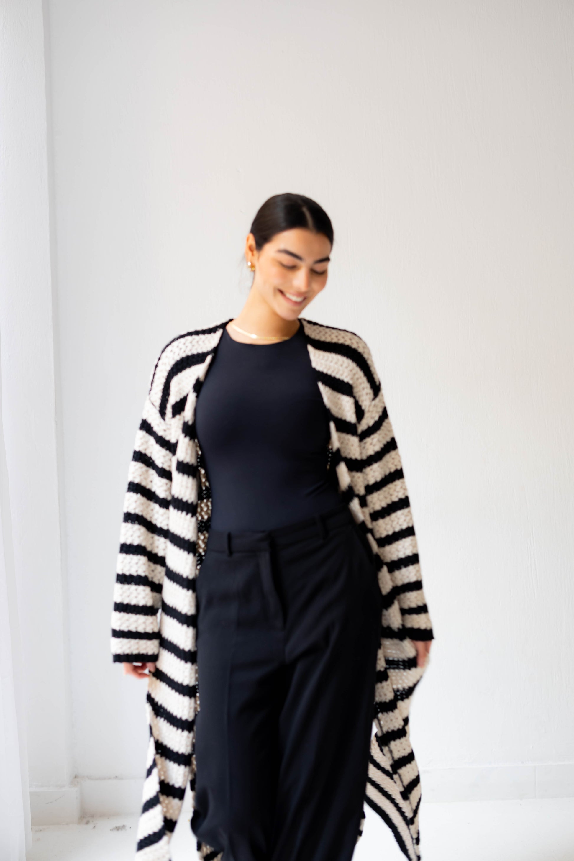 A soft, flowing long knit designed with subtle wave-like stripes and two effortless side slits for natural movement. Lightweight, cozy, and perfect for layering, this cardigan brings a relaxed, modern elegance to any outfit. Easy to style, beautifully breathable, and made to elevate your everyday look with calm, fluid charm. 💫