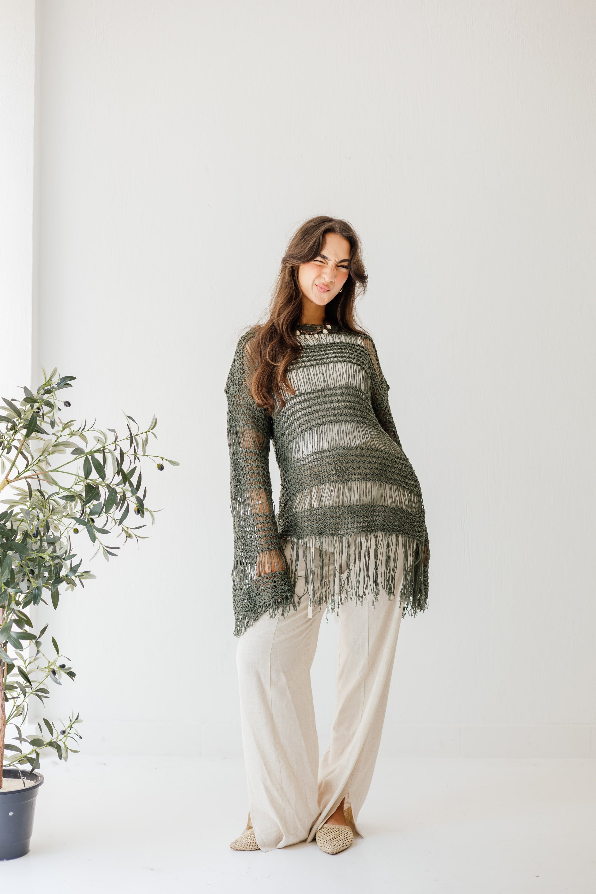 Handcrafted-style crochet with an airy weave and statement fringe—The Top is designed to layer beautifully over your favorite basics. The relaxed fit, flared sleeves, and soft texture make it perfect for breezy days, beachy vibes, or city strolls with a twist of edge.