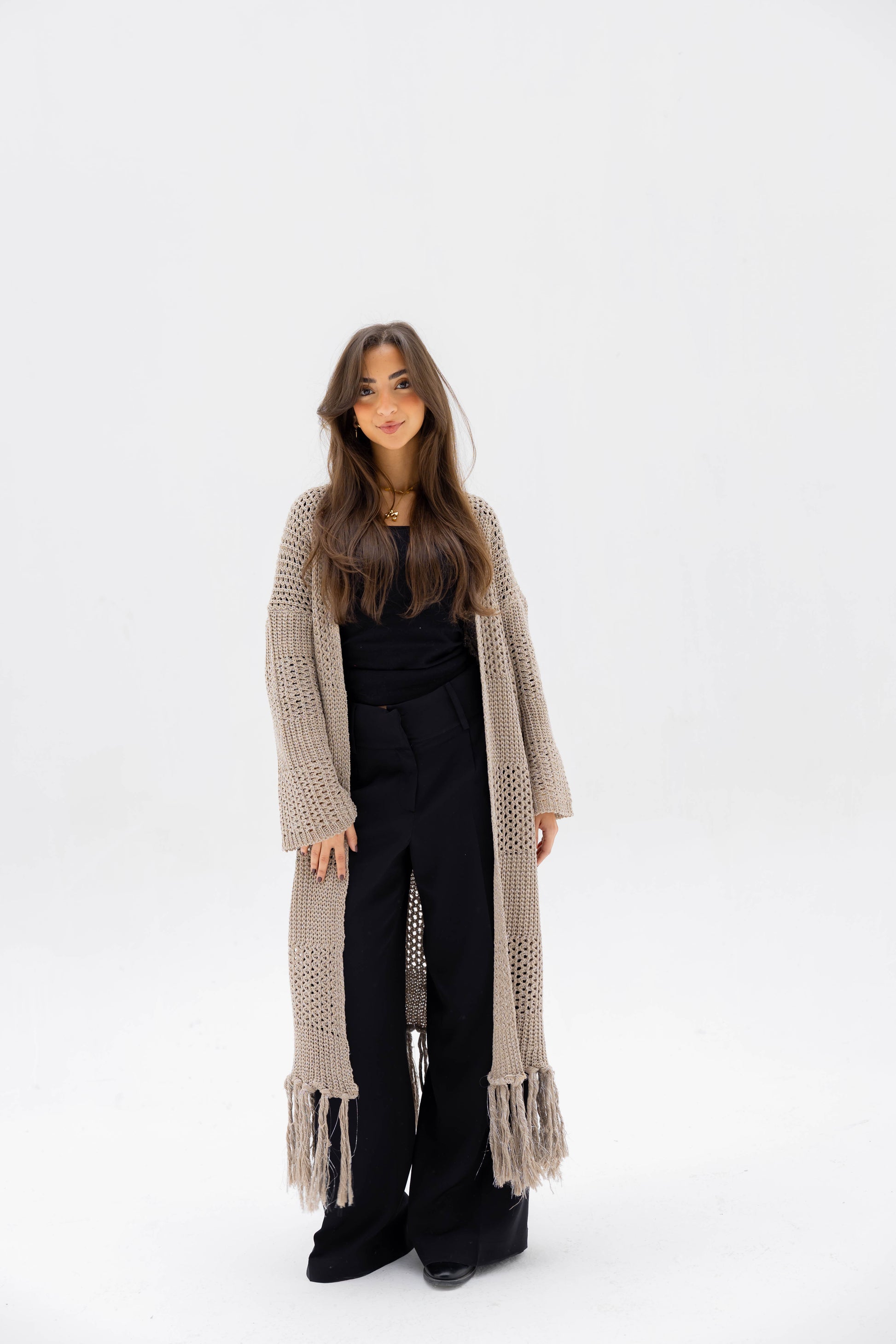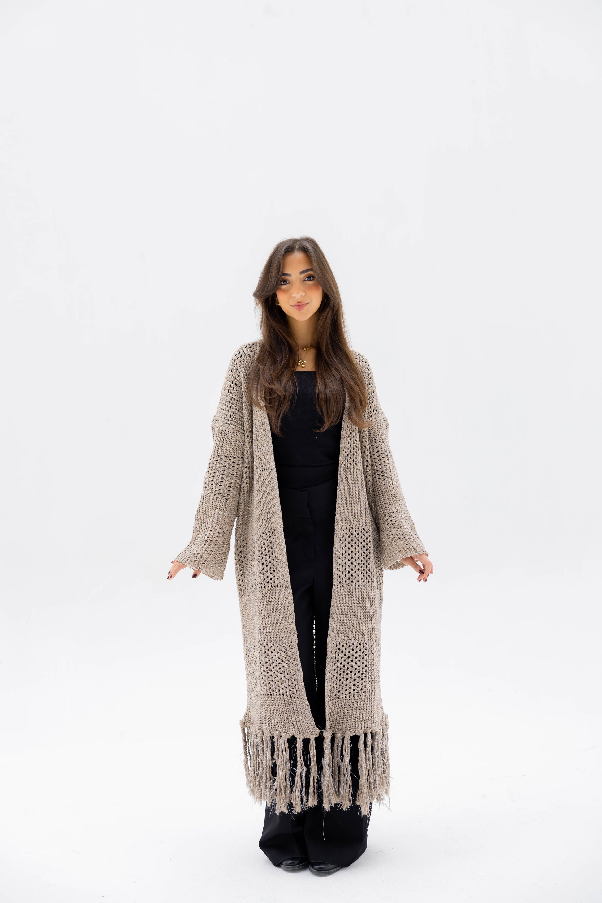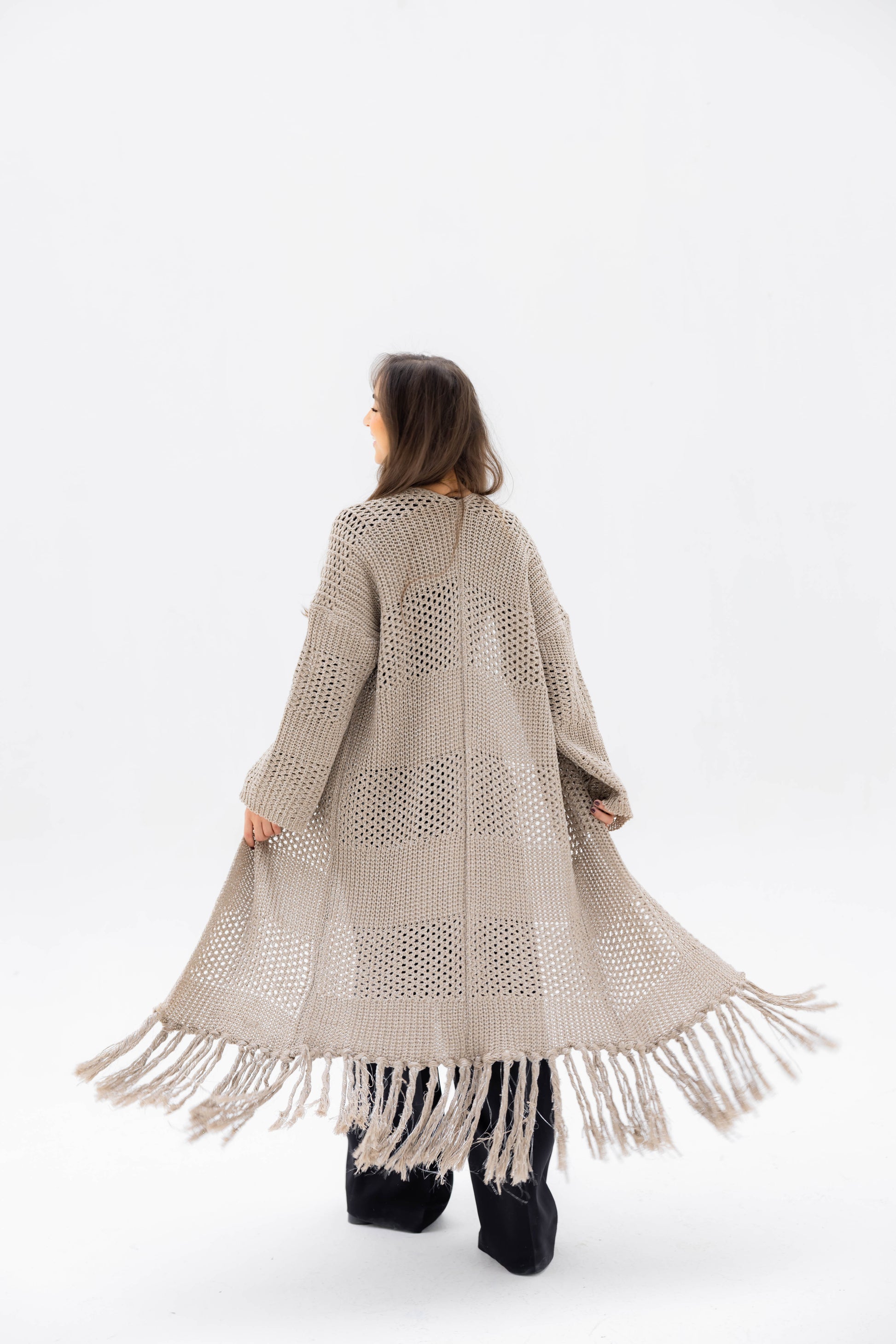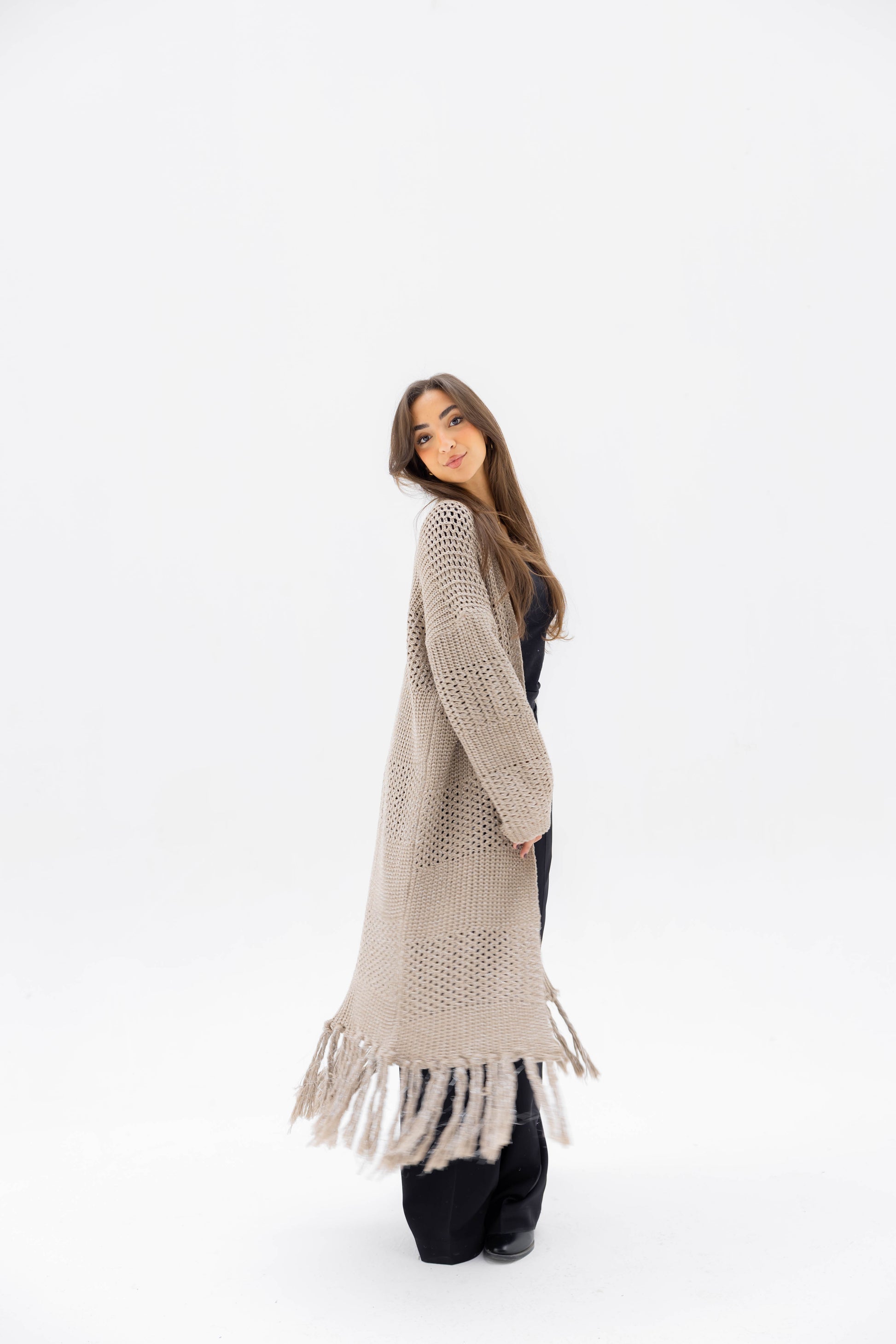 Wrap yourself in the bohemian spirit with this Fringed Breeze Cardigan. This beautifully knitted cardigan features a relaxed, easy fit, perfect for layering. The eye-catching detail is the playful fringe that dances along the hem and cuffs, adding a touch of movement and texture. Crafted from a soft and comfortable knit, this cardigan is ideal for adding a touch of effortless style to any outfit, from casual days to breezy evenings.