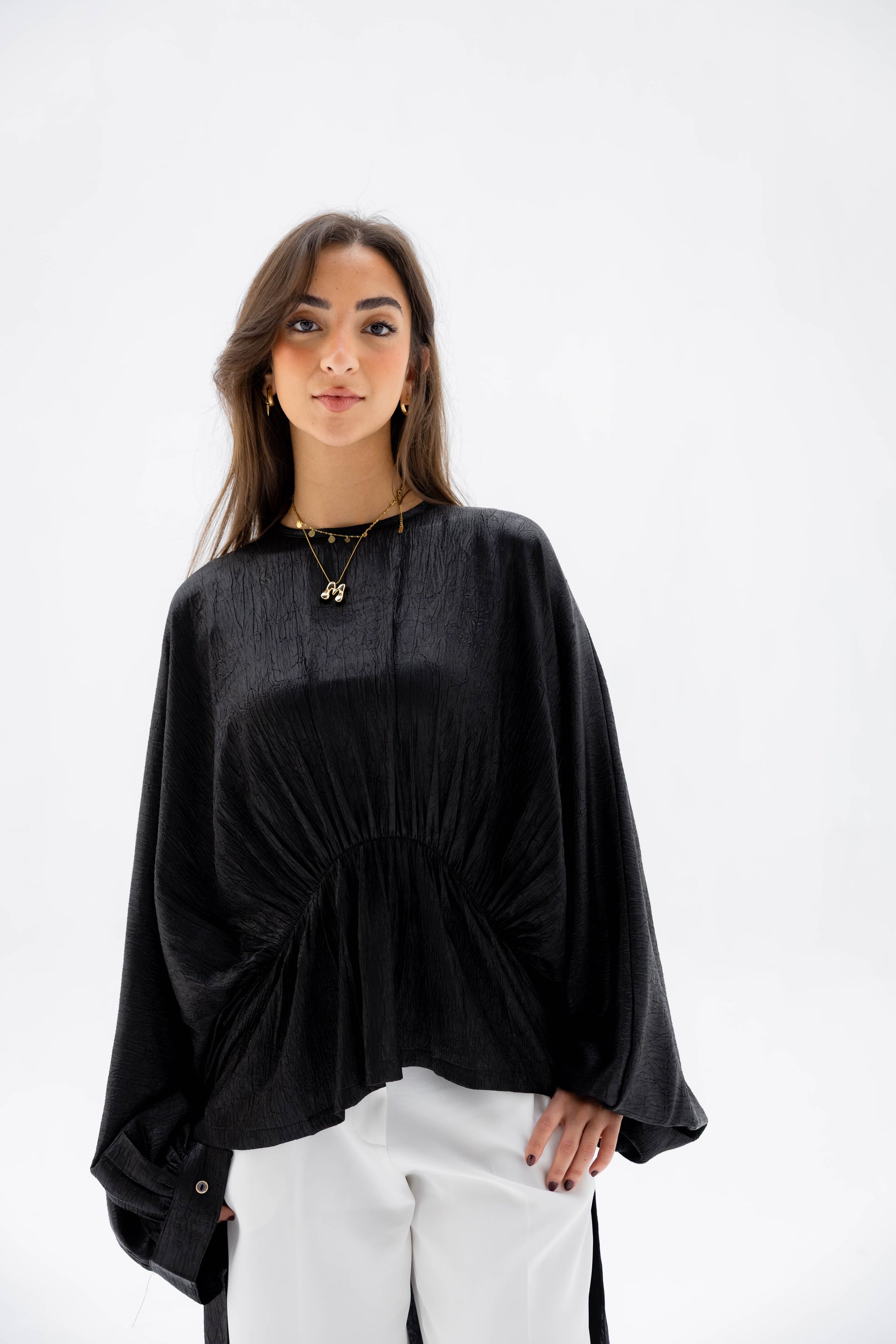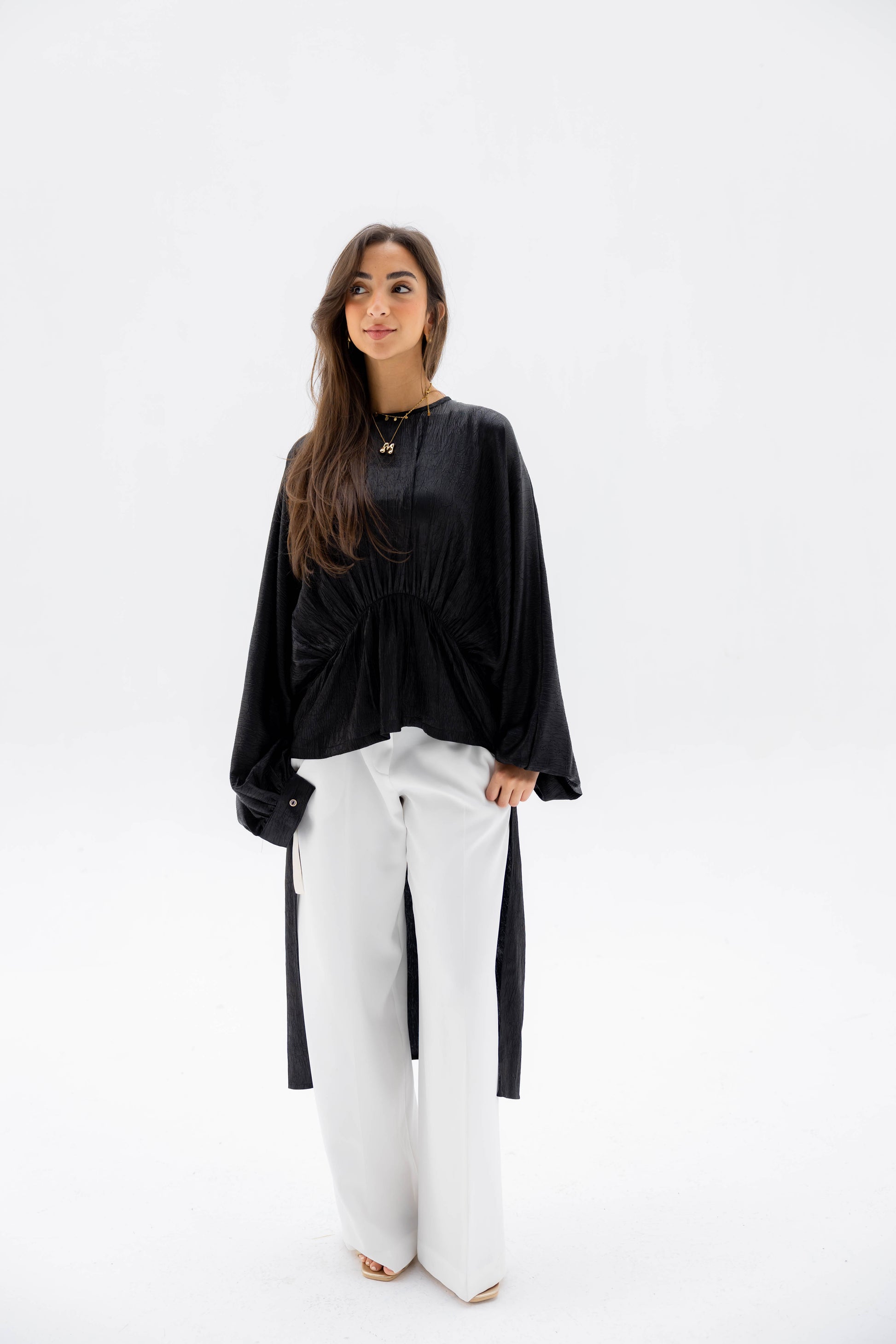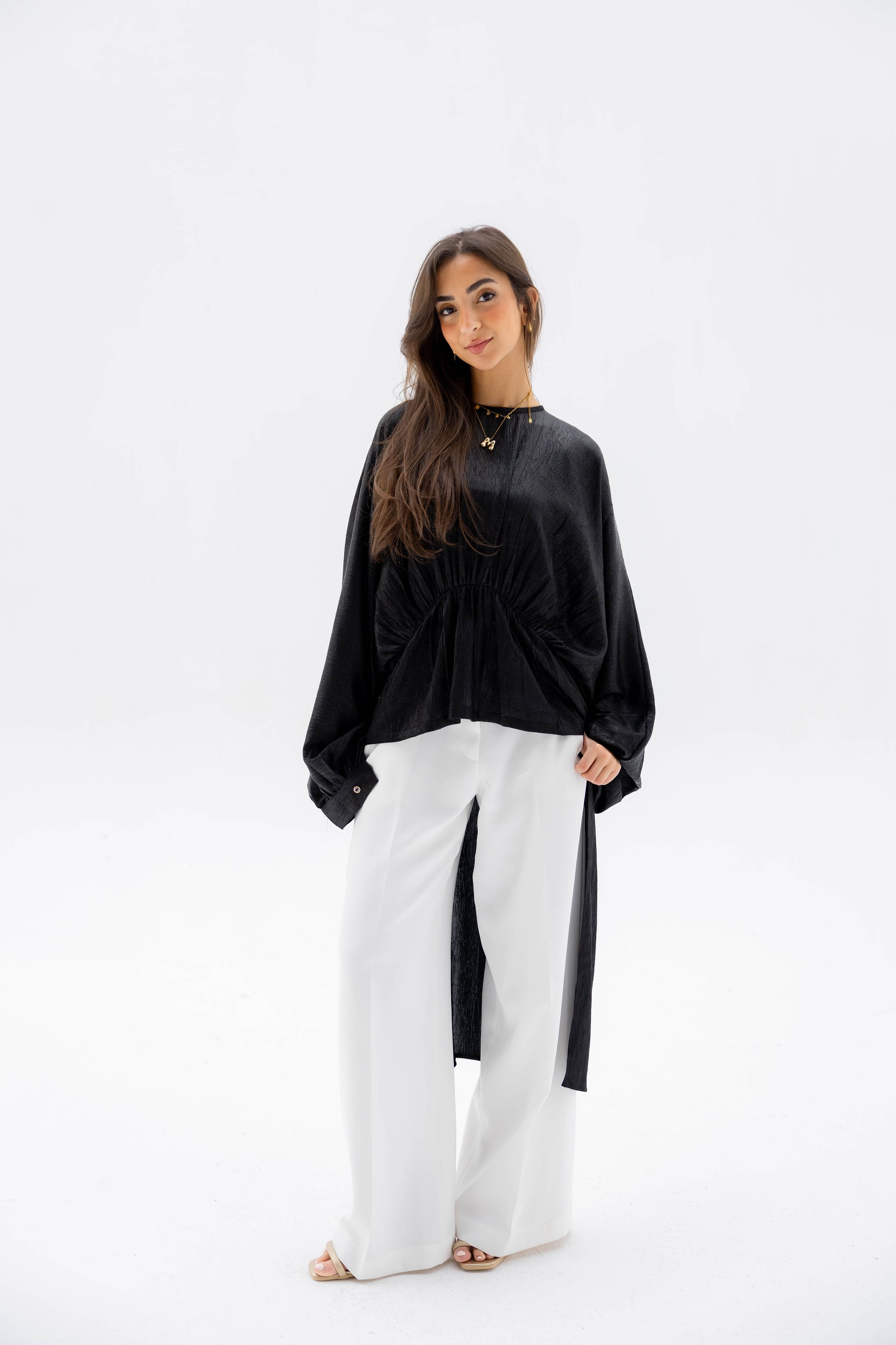 Layali Blouse is where elegance meets subtle glow. Designed in a fluid high-low silhouette with a delicate shimmer finish, it moves beautifully with every step. Feminine, graceful, and perfect for evenings that linger.