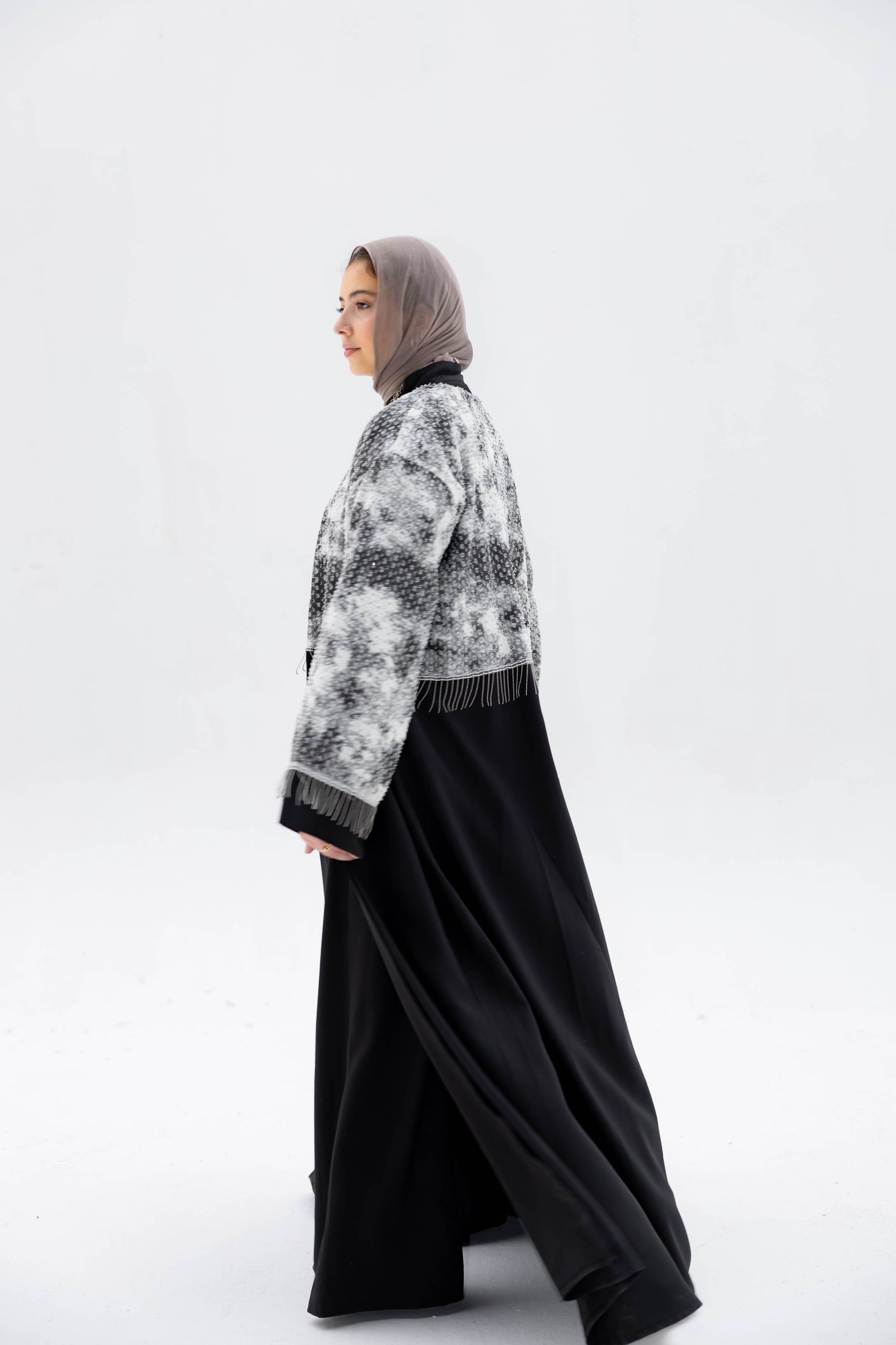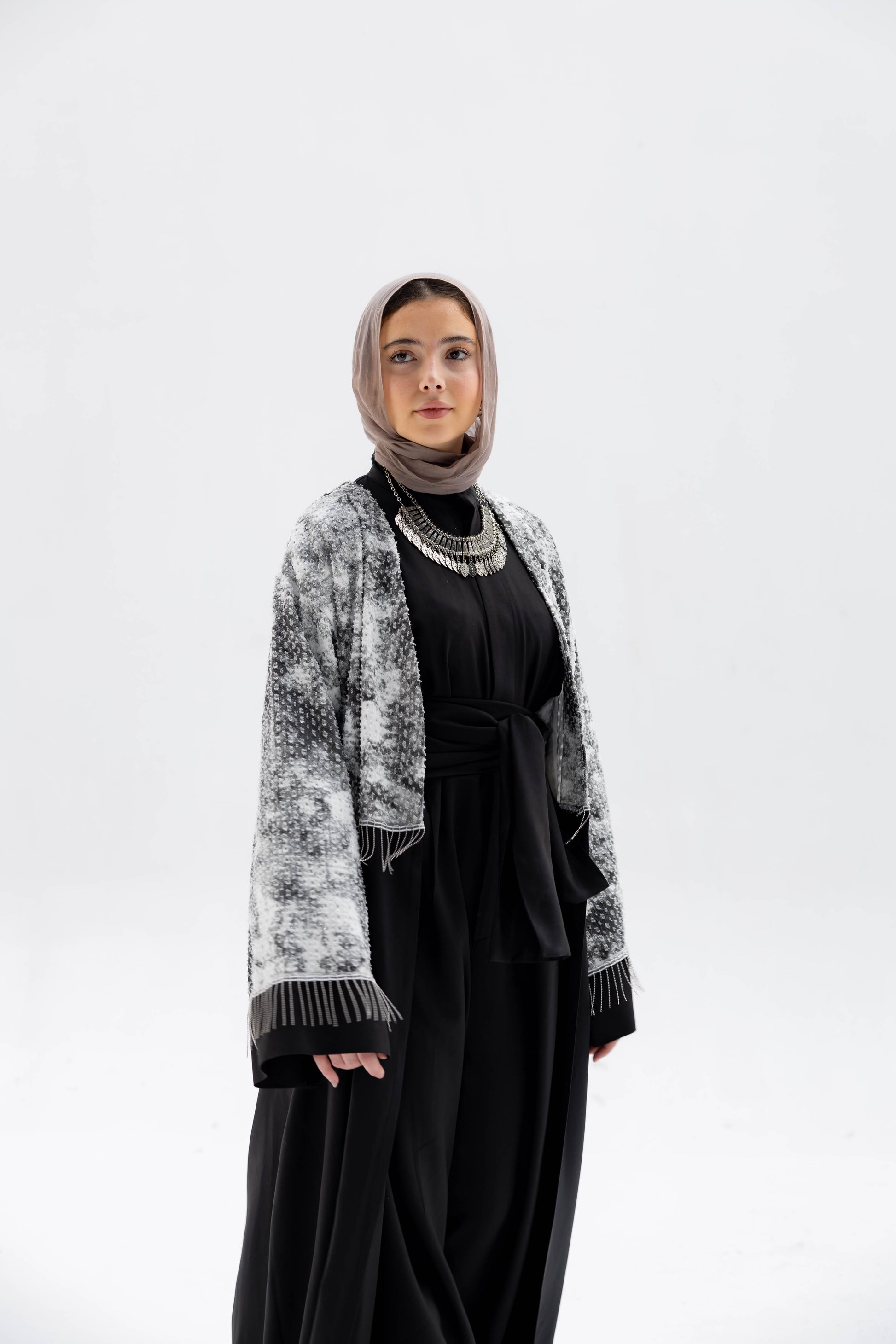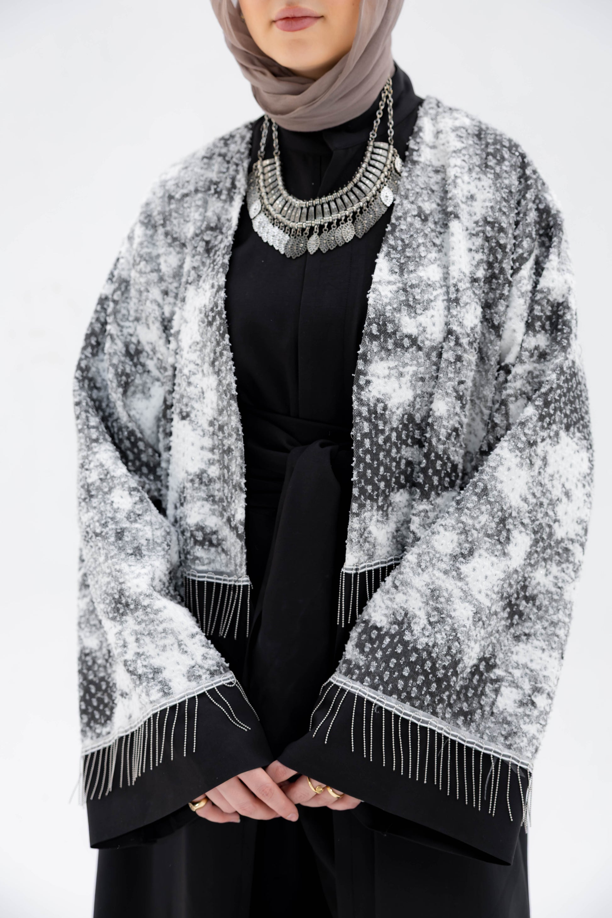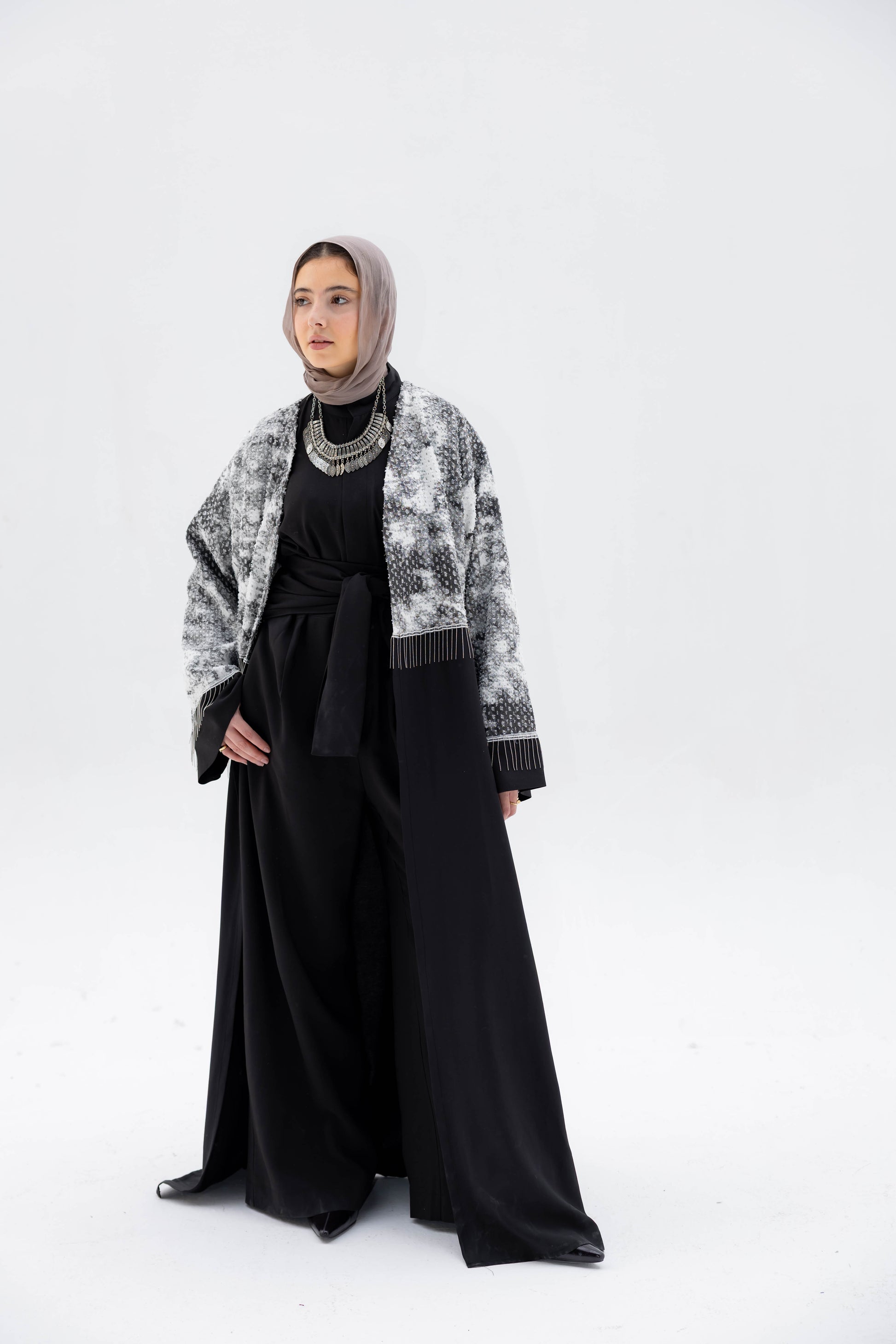 Inspired by moonlight against the night sky, the Luna Noir Kaftan pairs a luminous black-and-white shimmer top with a sleek black base. A statement of quiet elegance and modern modesty.