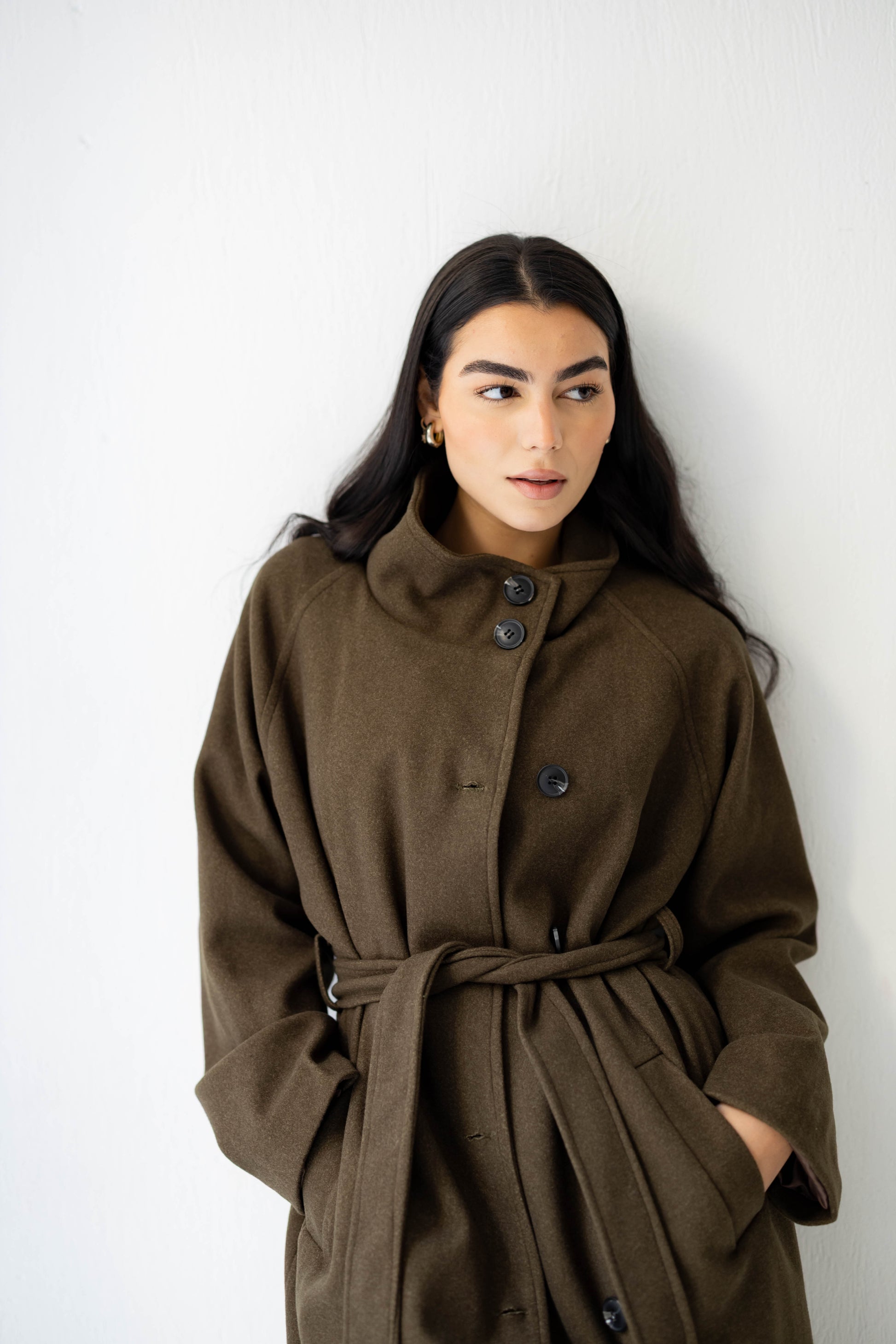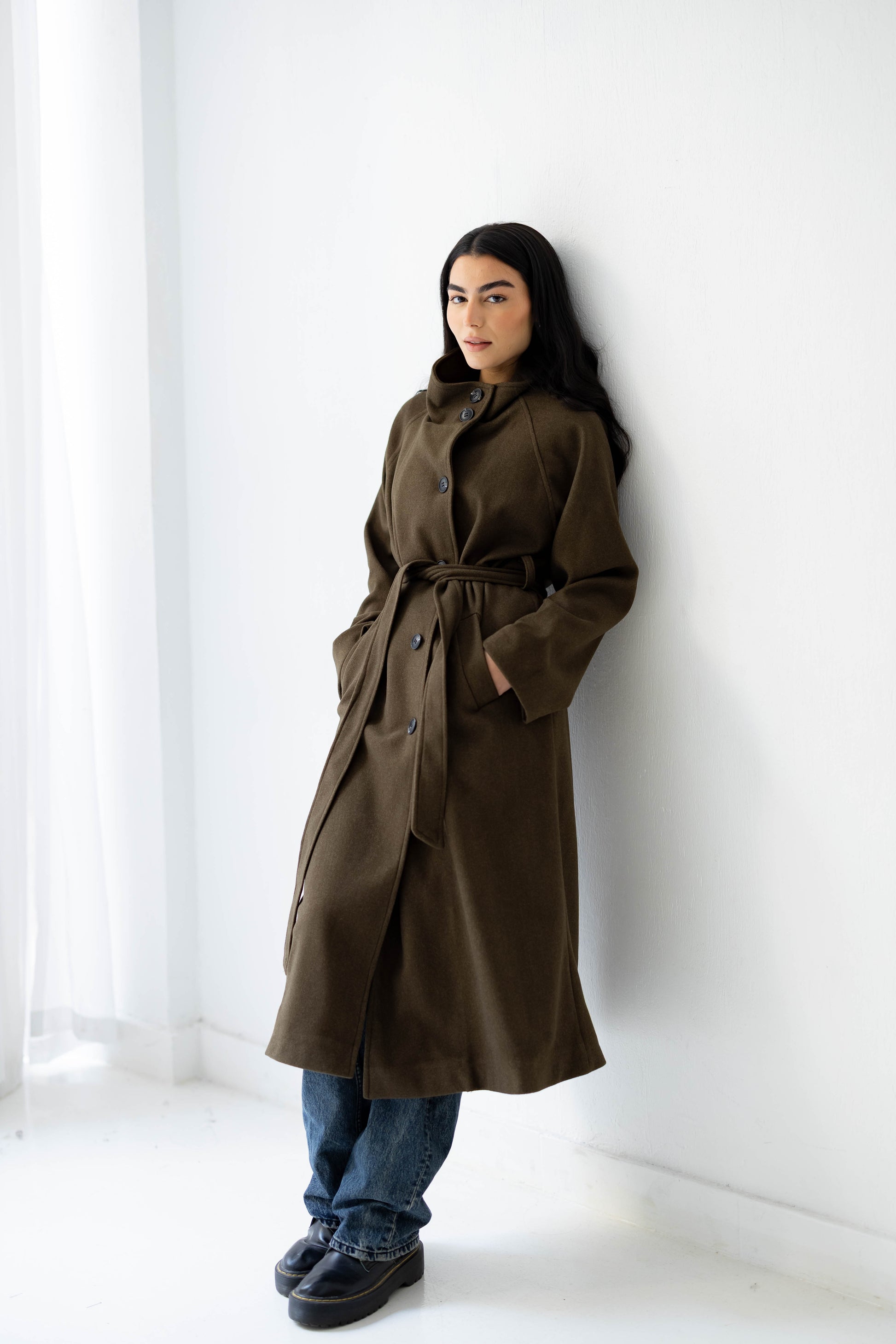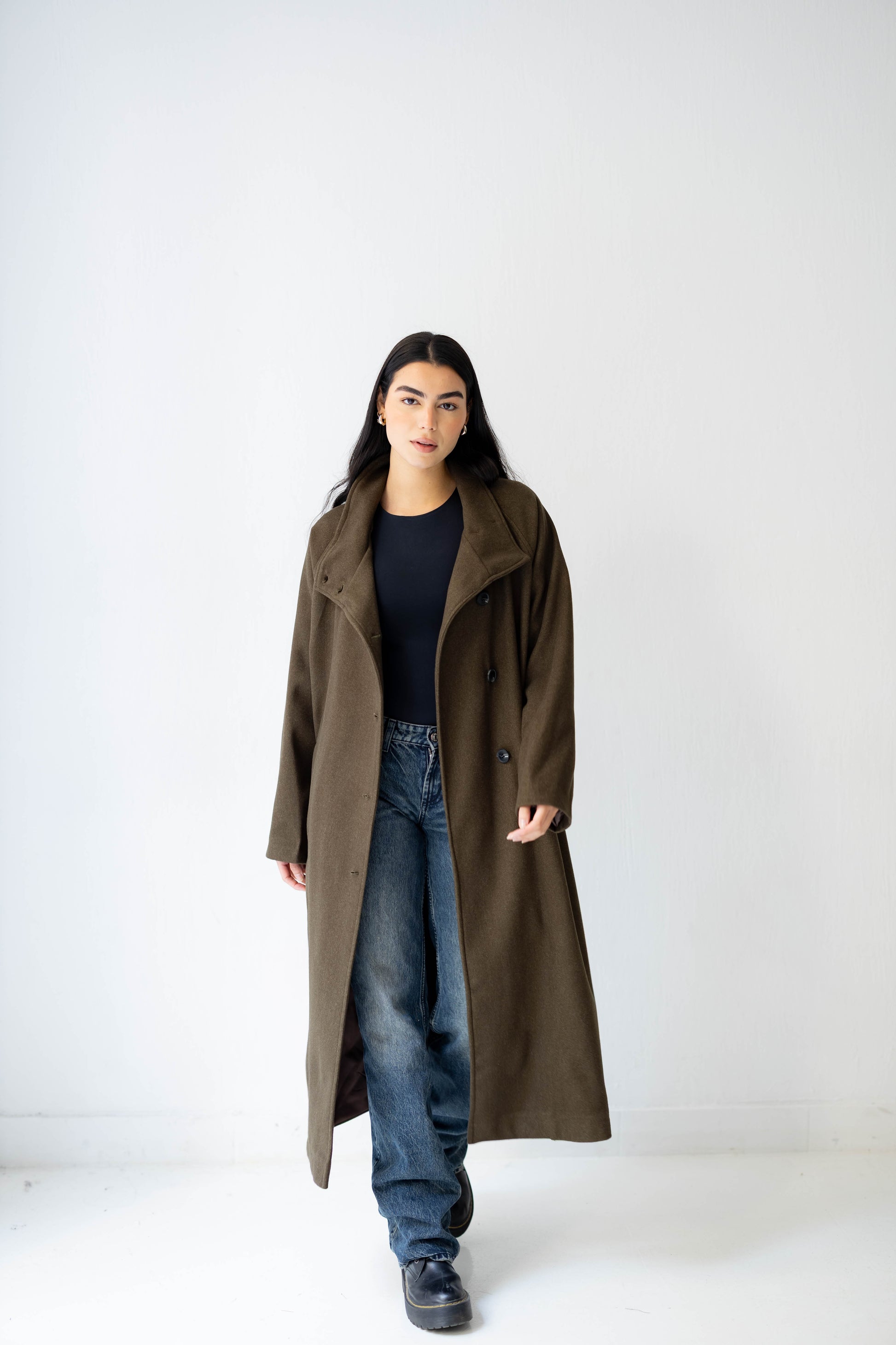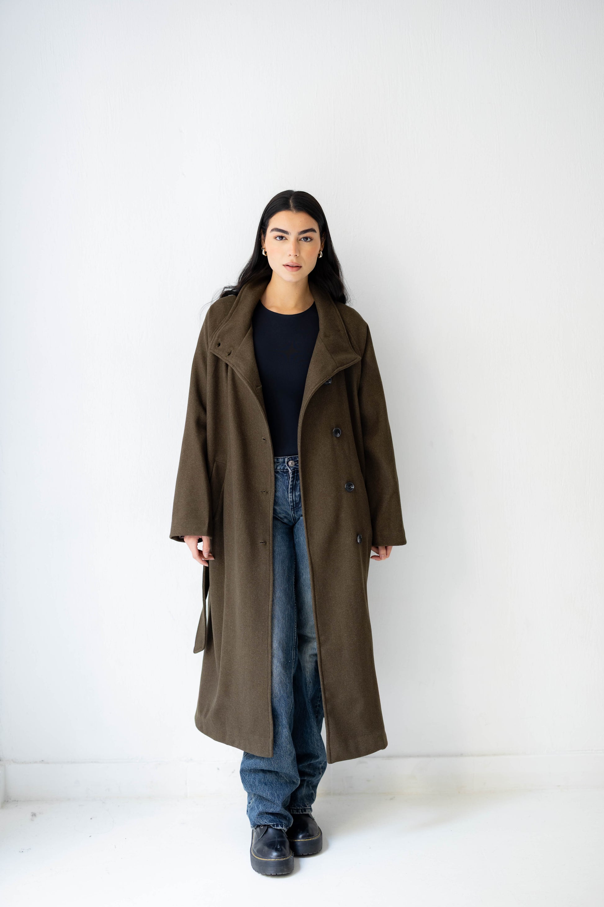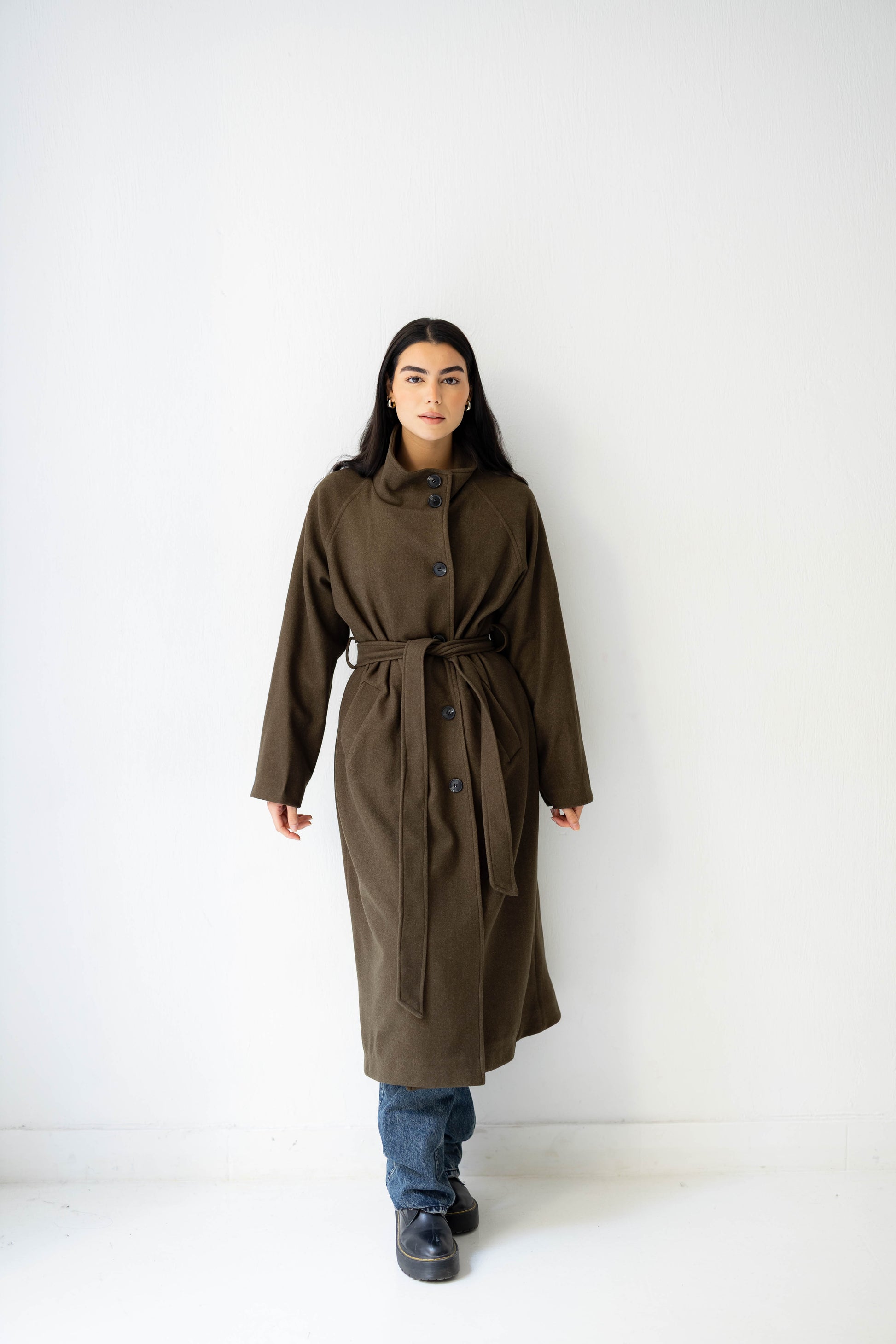 A timeless long coat designed with a sleek stand-up collar, full button closure, and a matching belt for a defined silhouette. Warm, elegant, and effortlessly stylish — perfect for elevating any winter look.