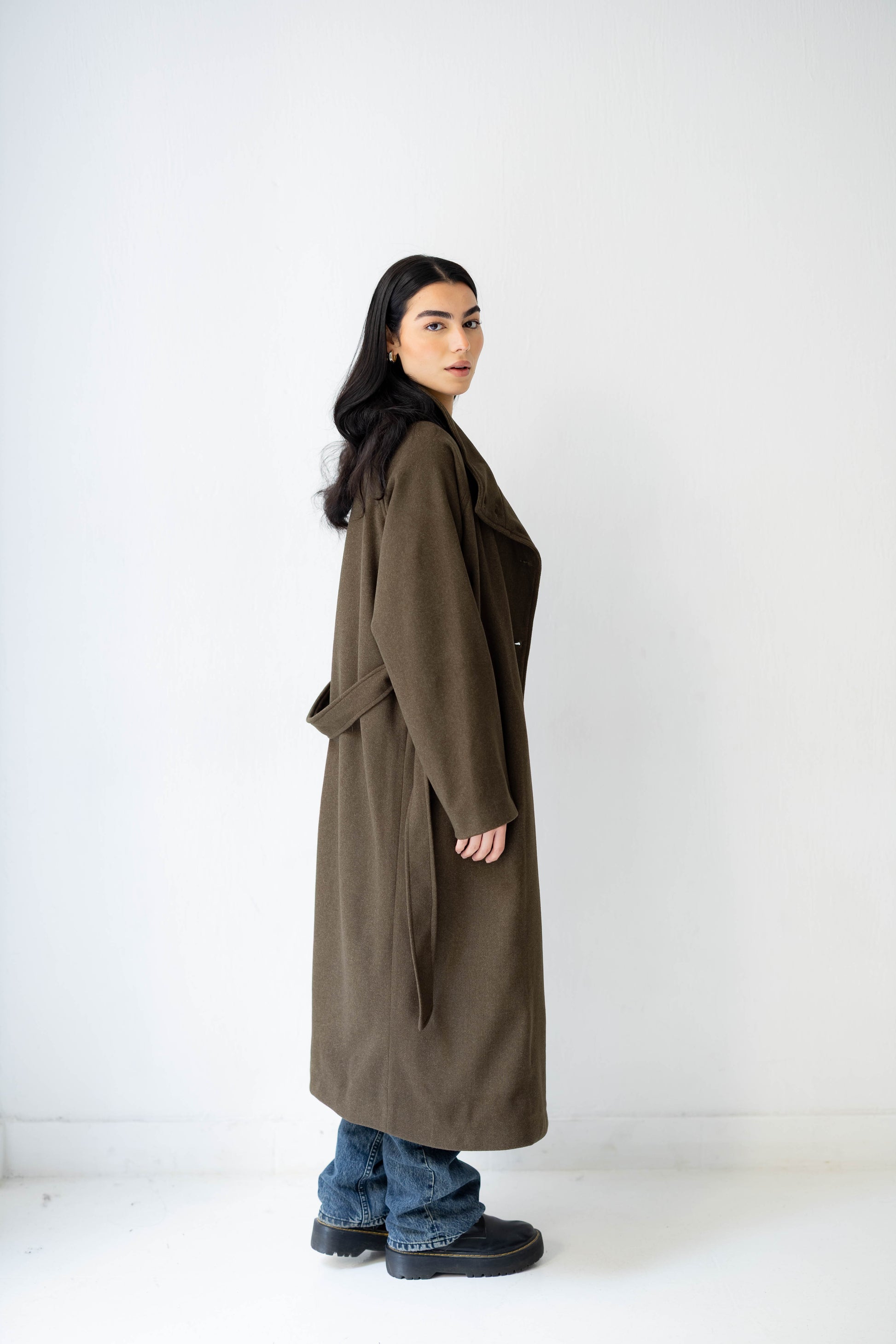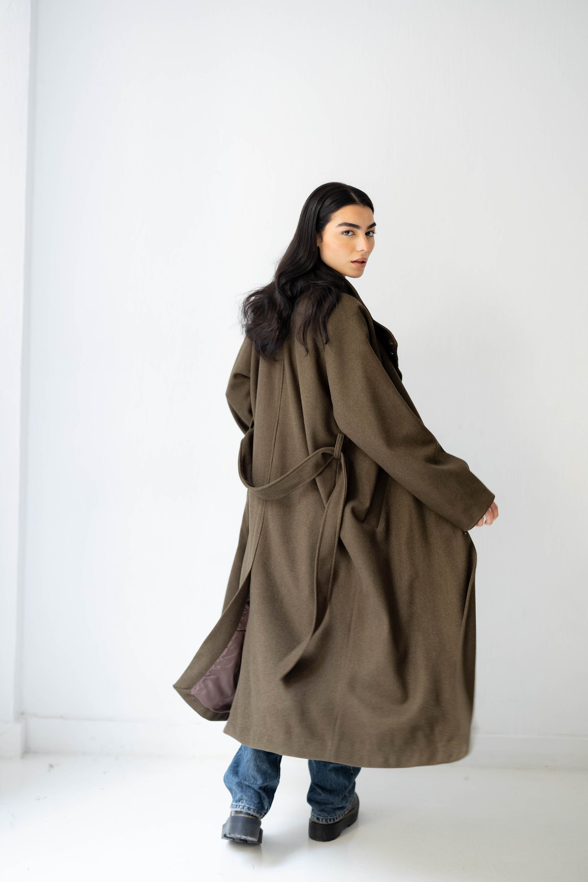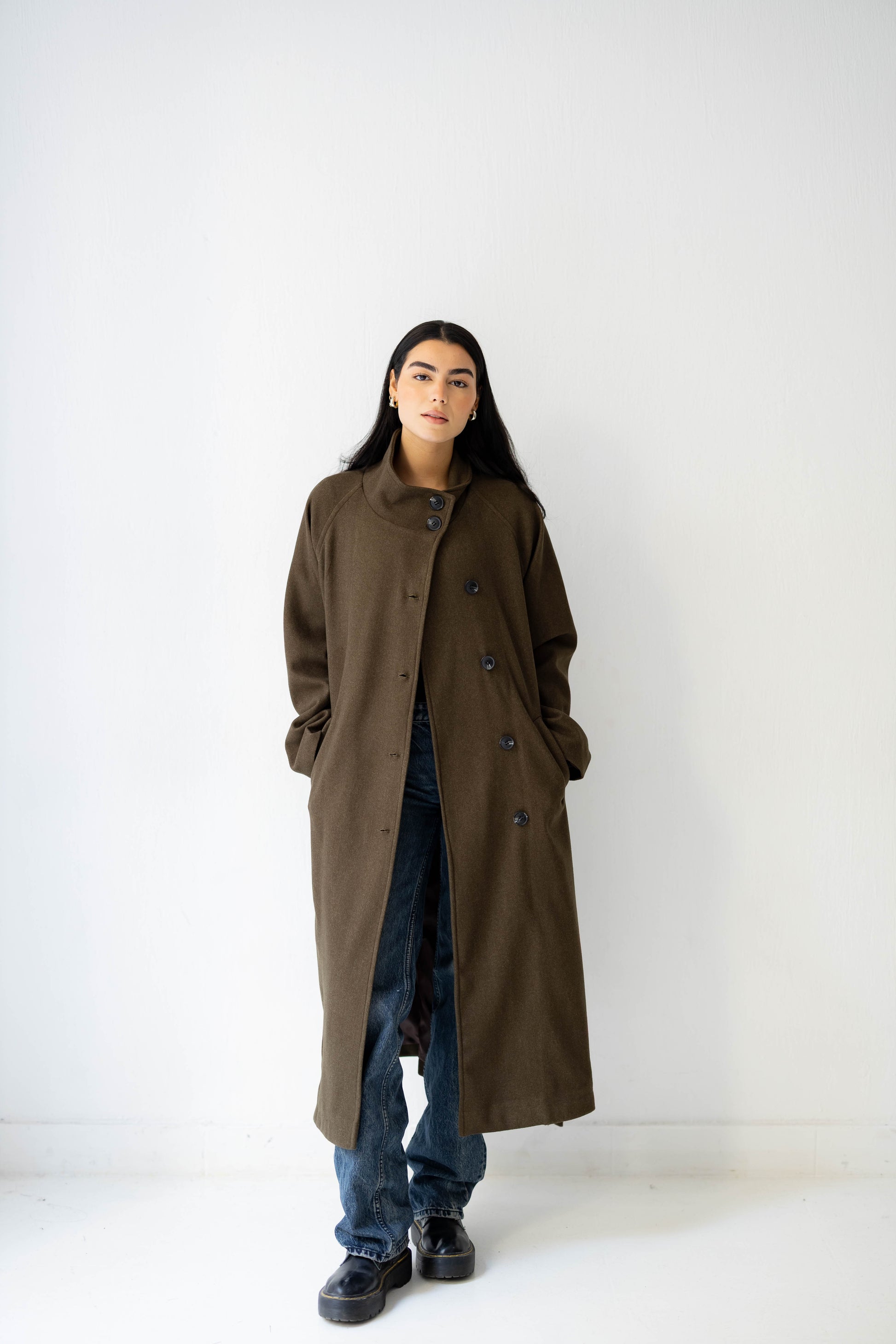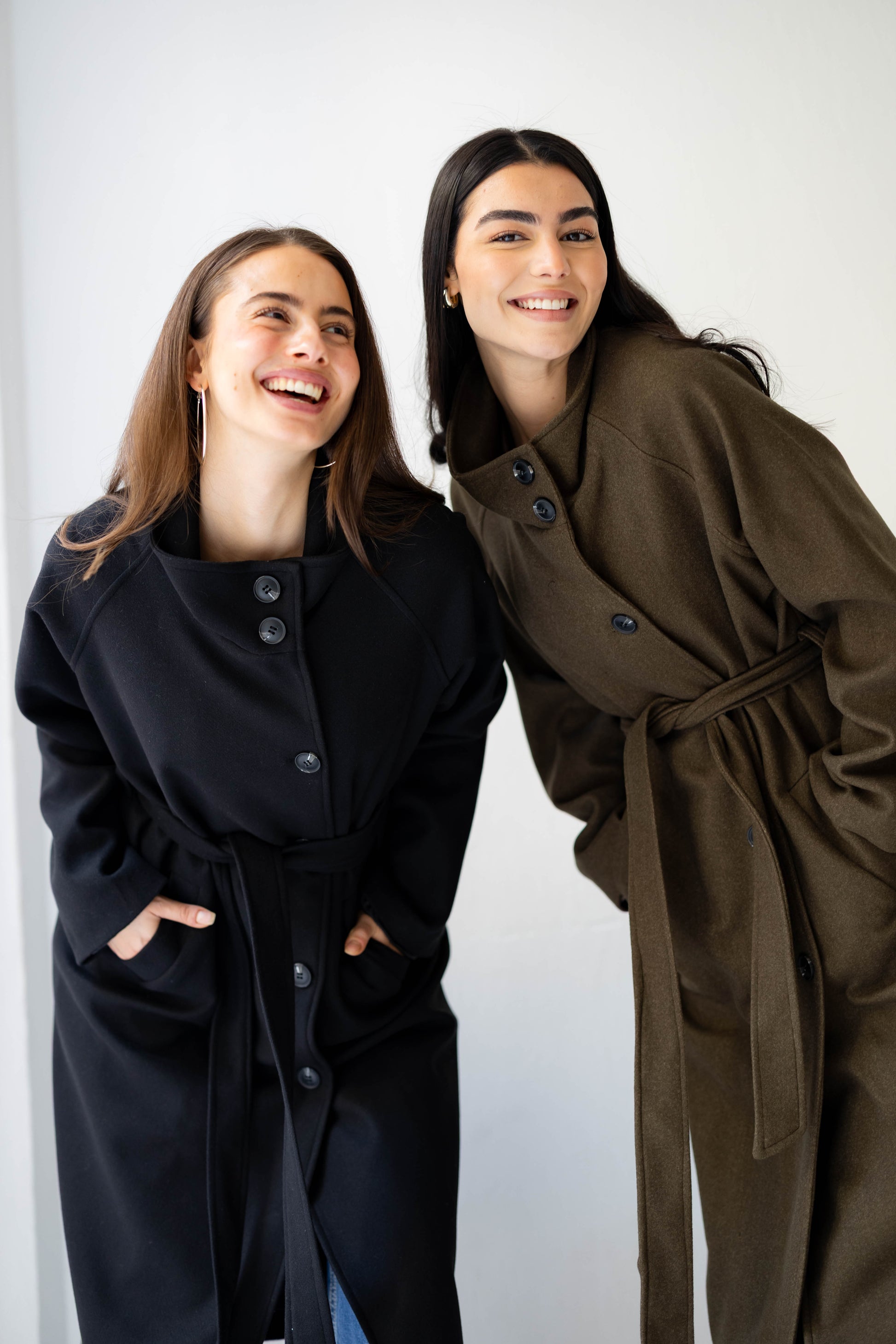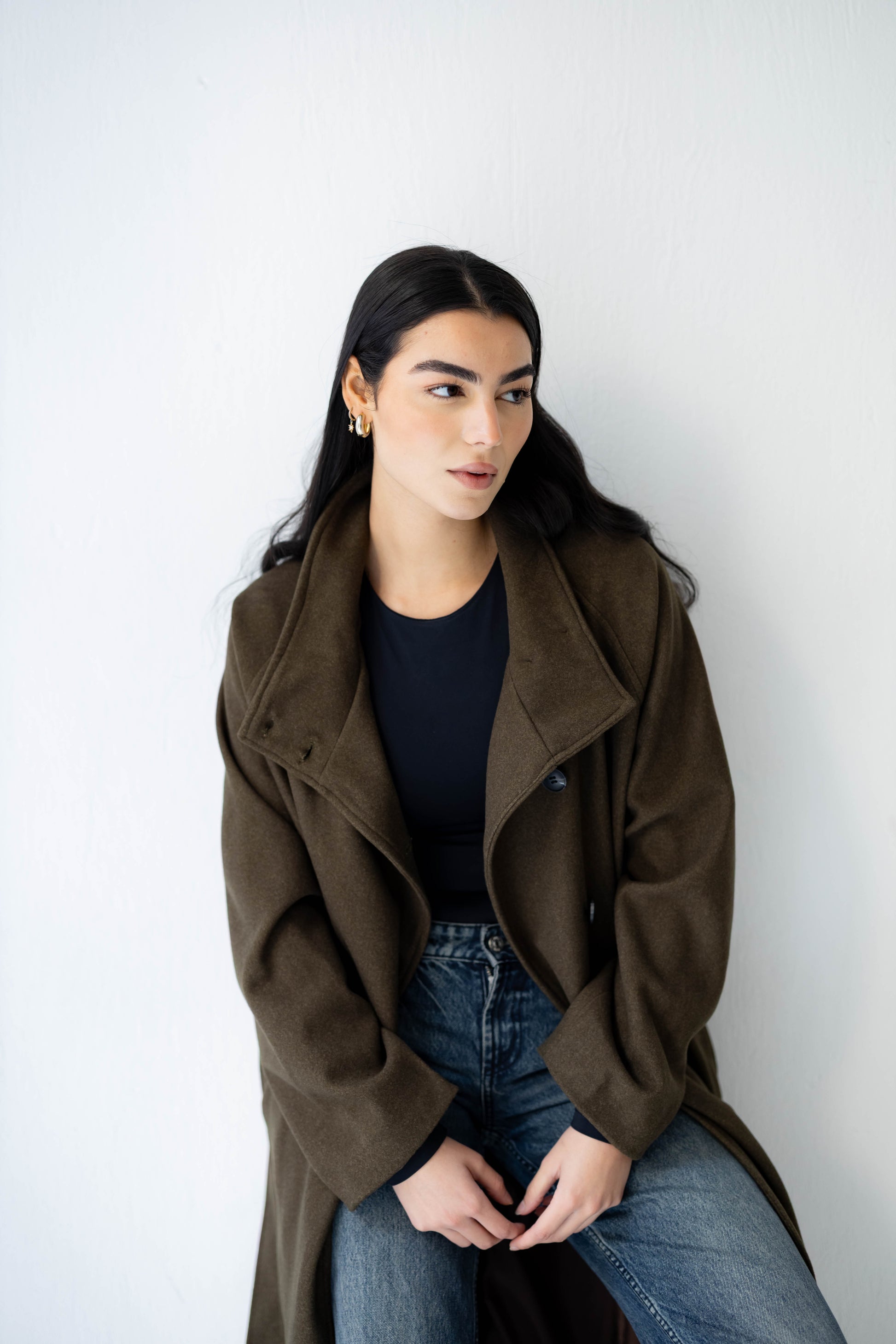 A timeless long coat designed with a sleek stand-up collar, full button closure, and a matching belt for a defined silhouette. Warm, elegant, and effortlessly stylish — perfect for elevating any winter look.