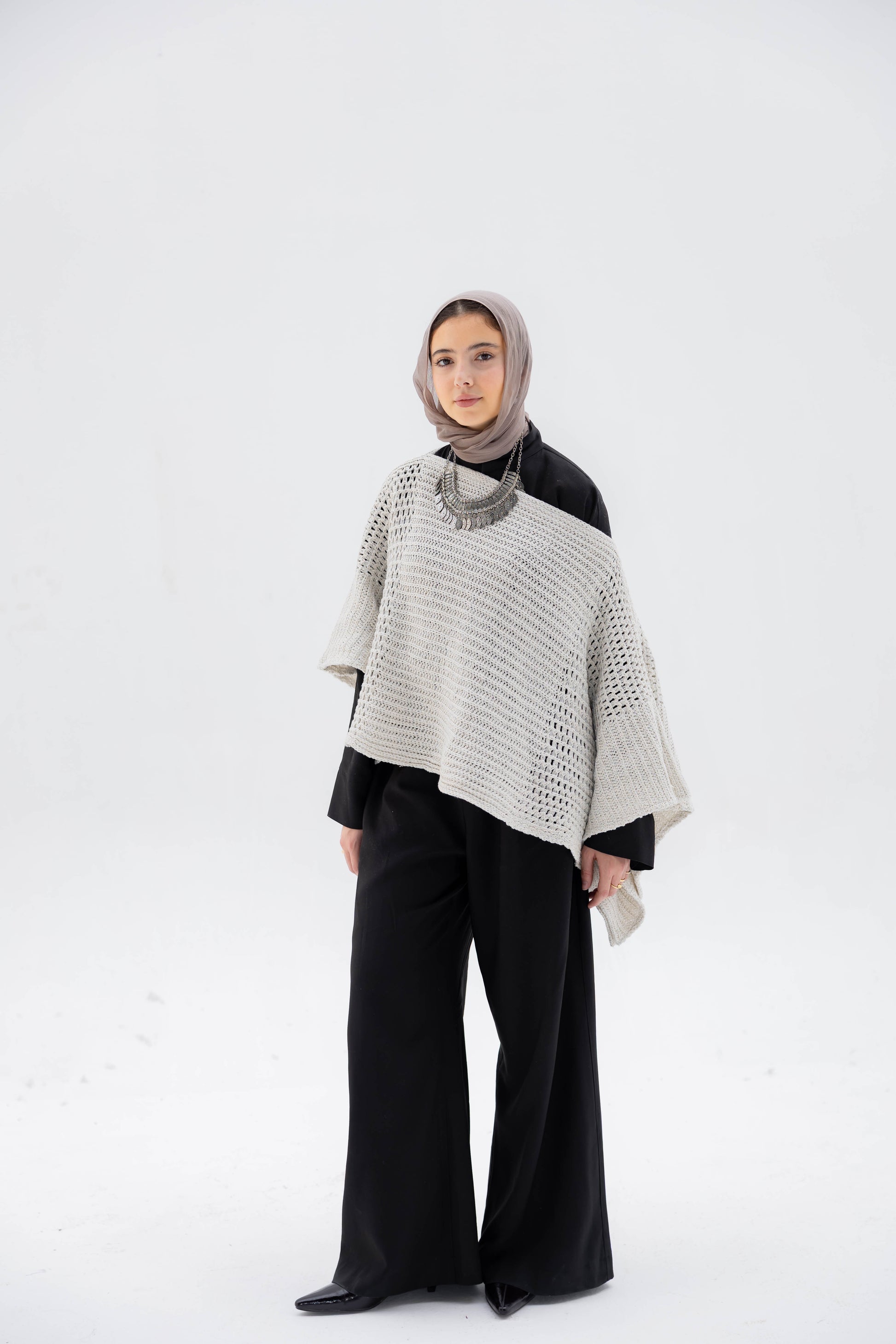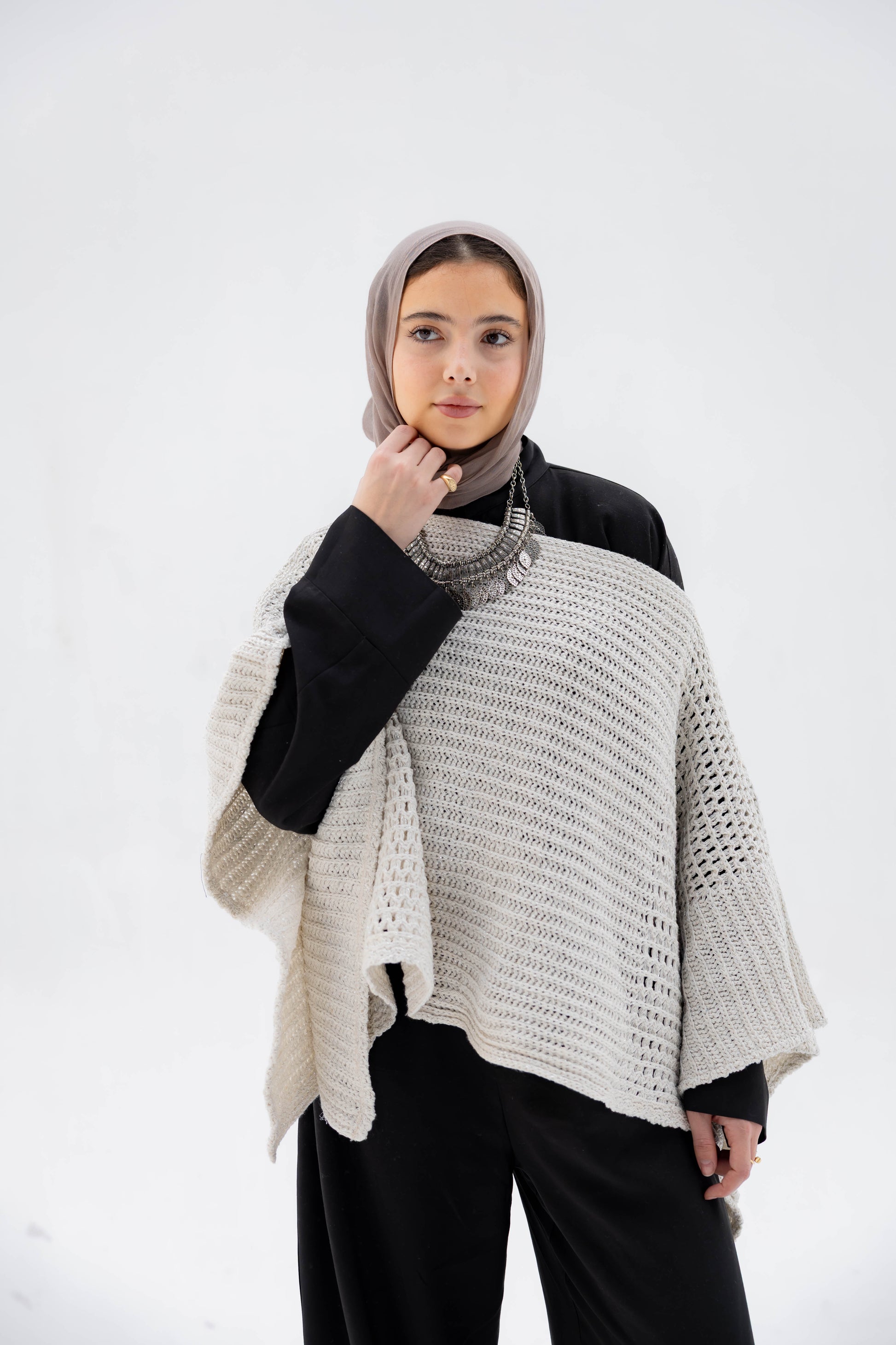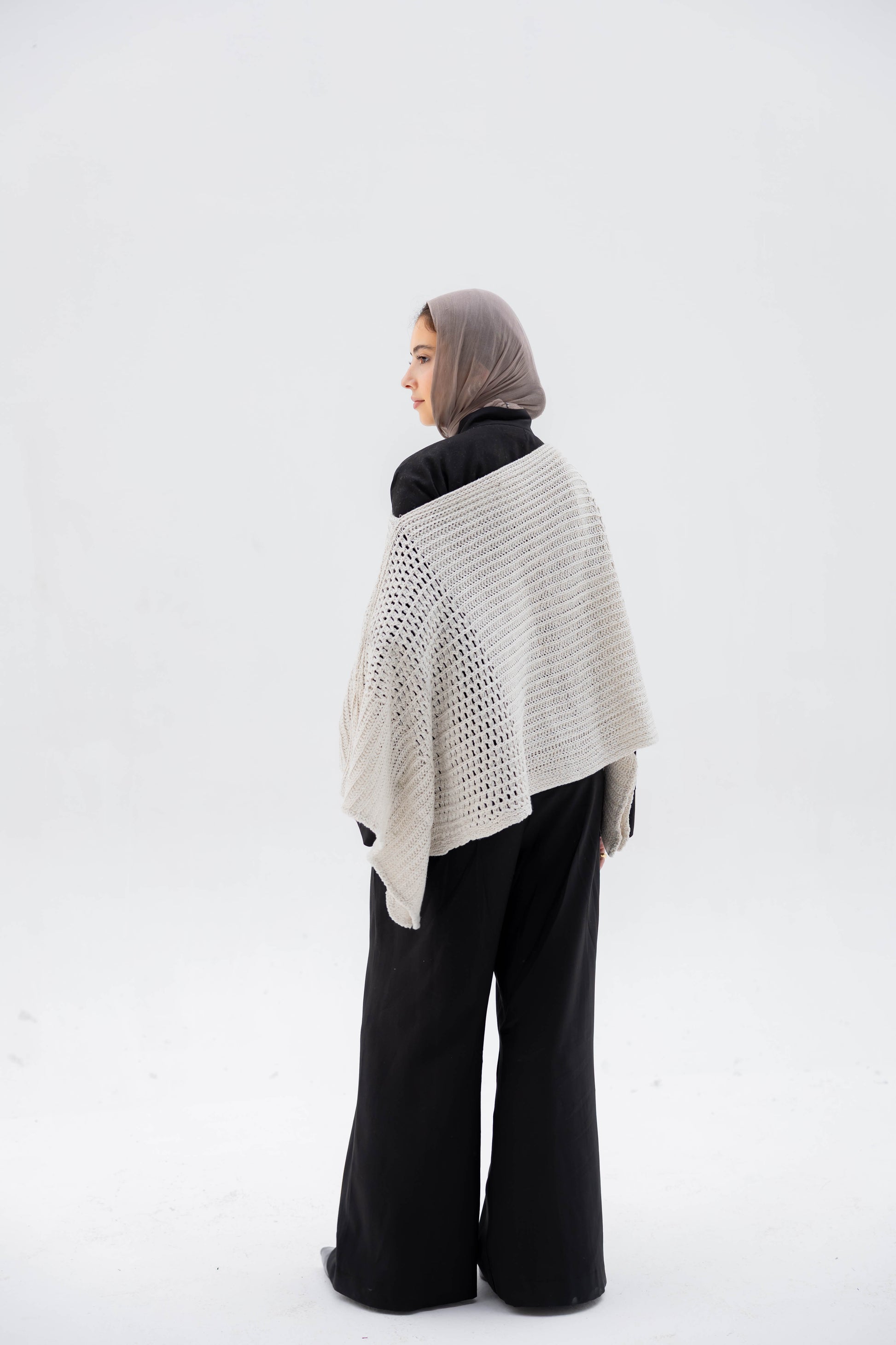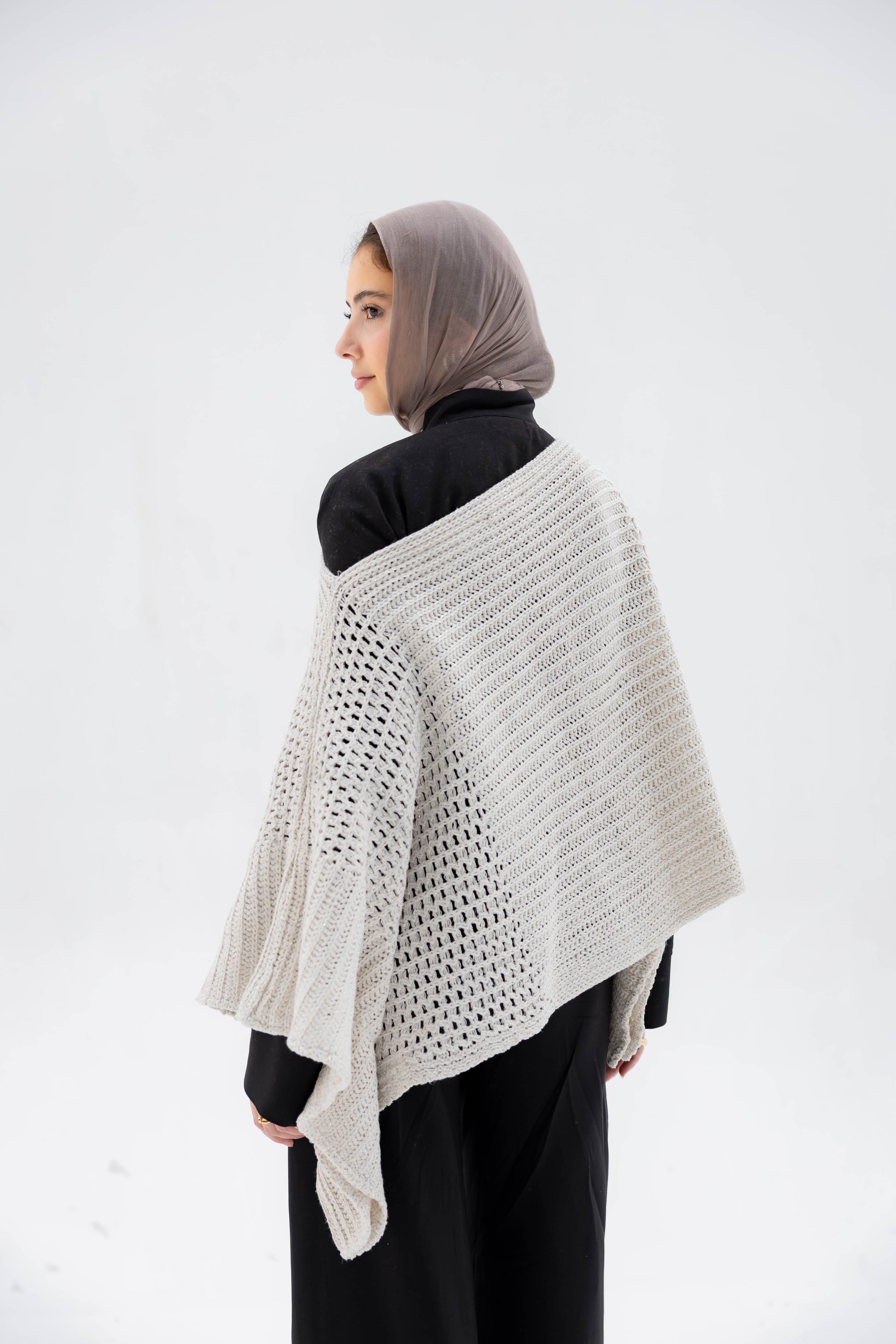 A modern statement piece with a soft, effortless feel. The Moonlit Knit Cape features a relaxed, draped silhouette with wide sleeves and a breathable textured knit that moves gracefully with the body. Designed for comfort and ease, it offers a lightweight layer that elevates everyday looks while remaining versatile and timeless. Perfect for transitional weather, it brings a sense of quiet elegance to both casual and refined styling.
