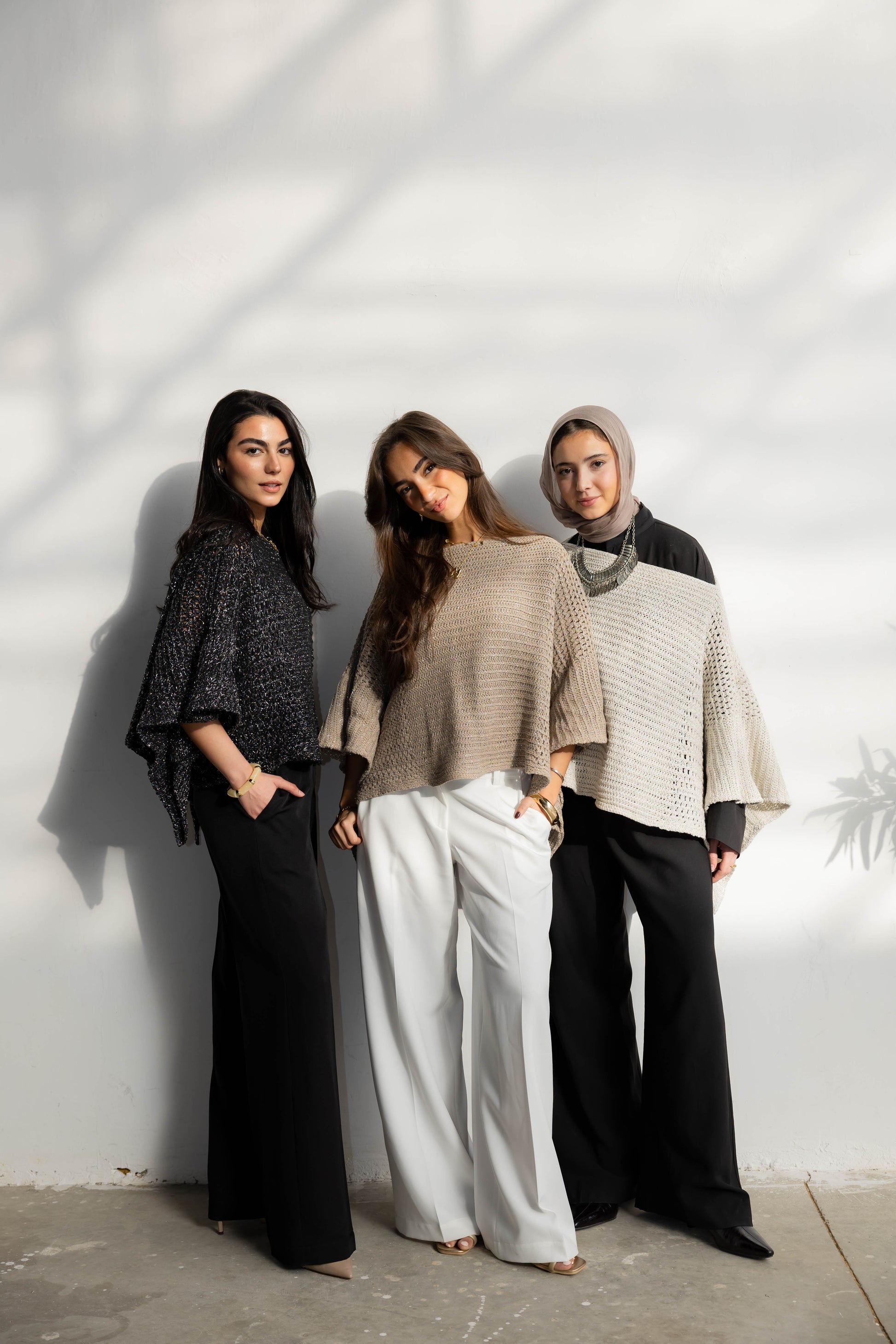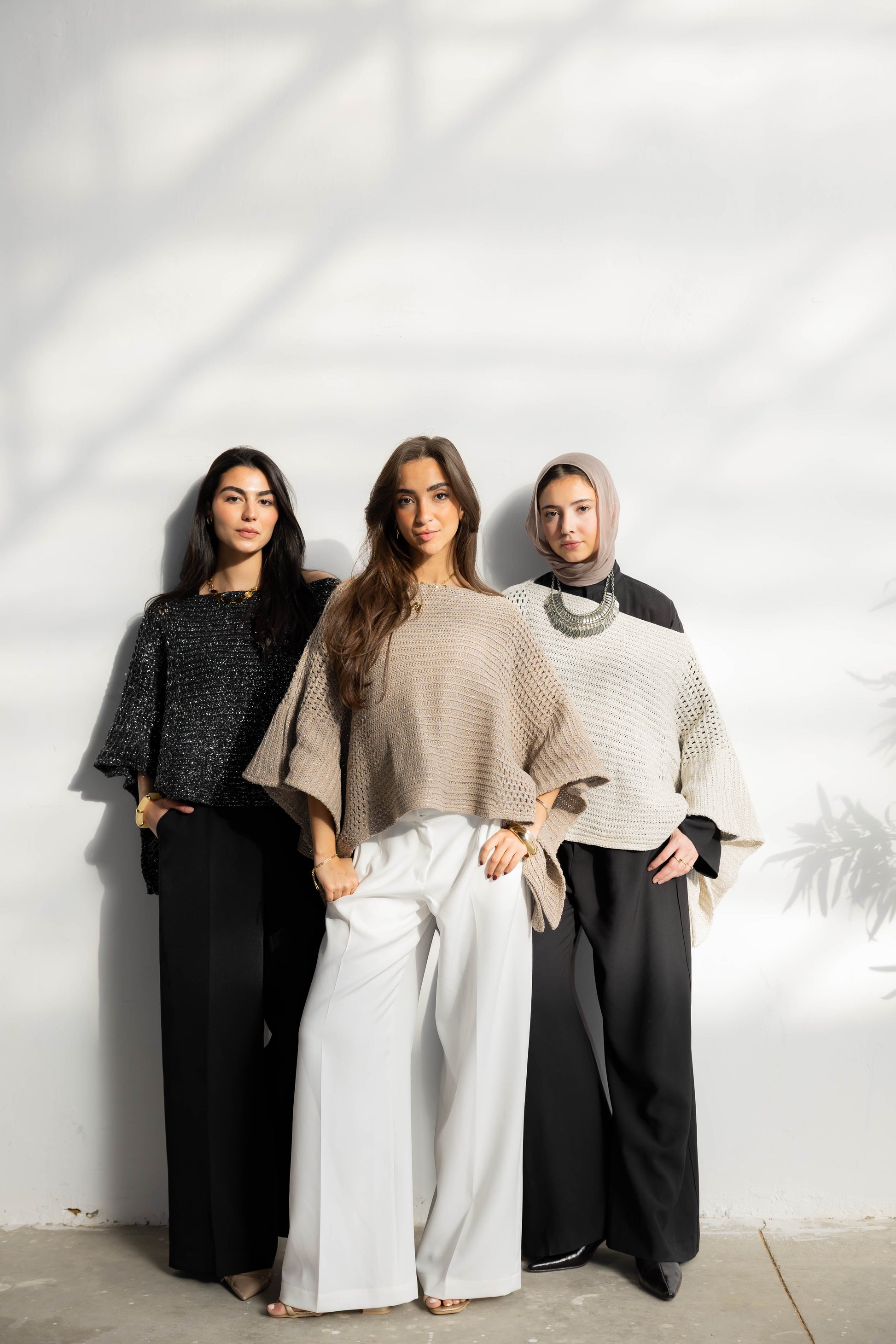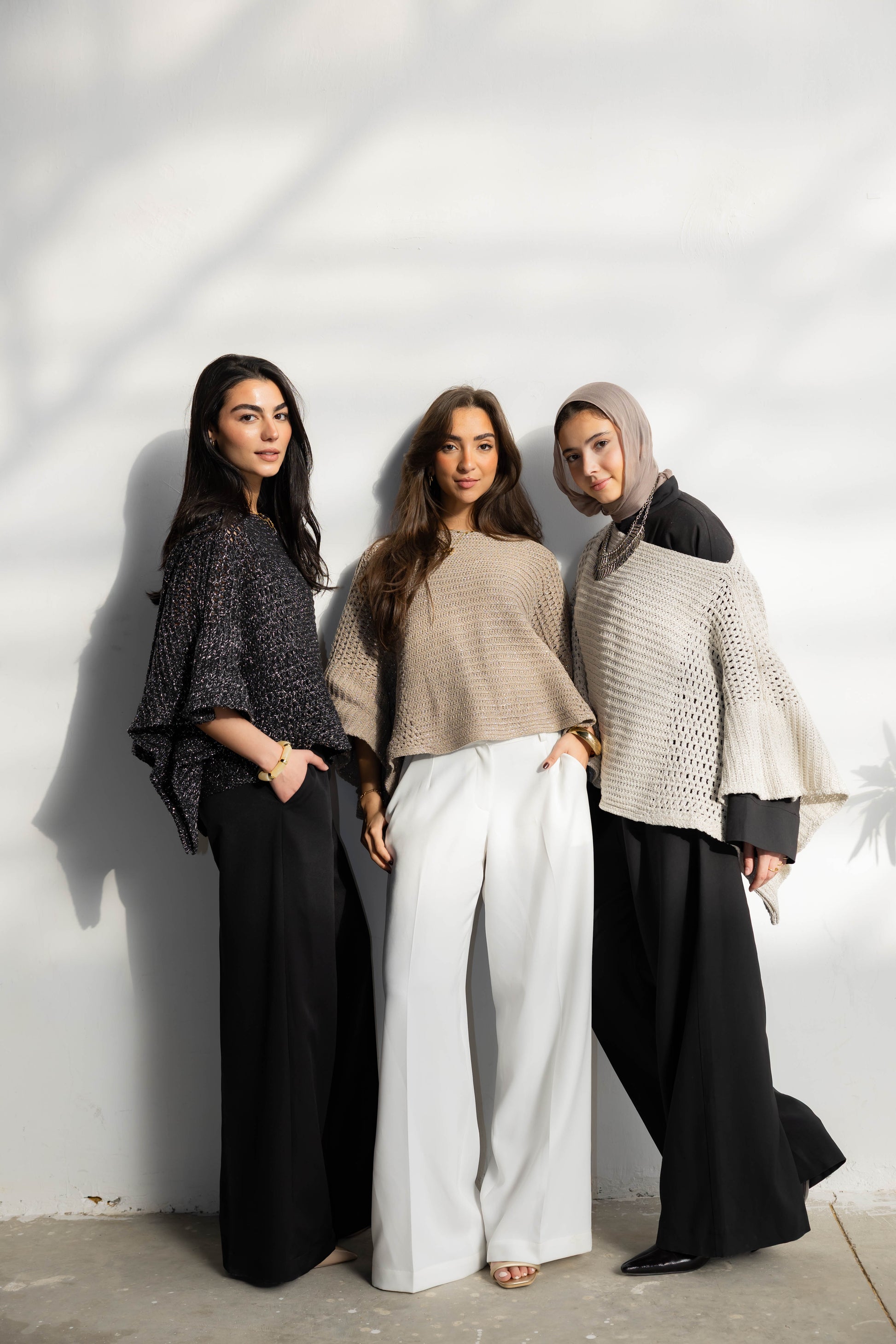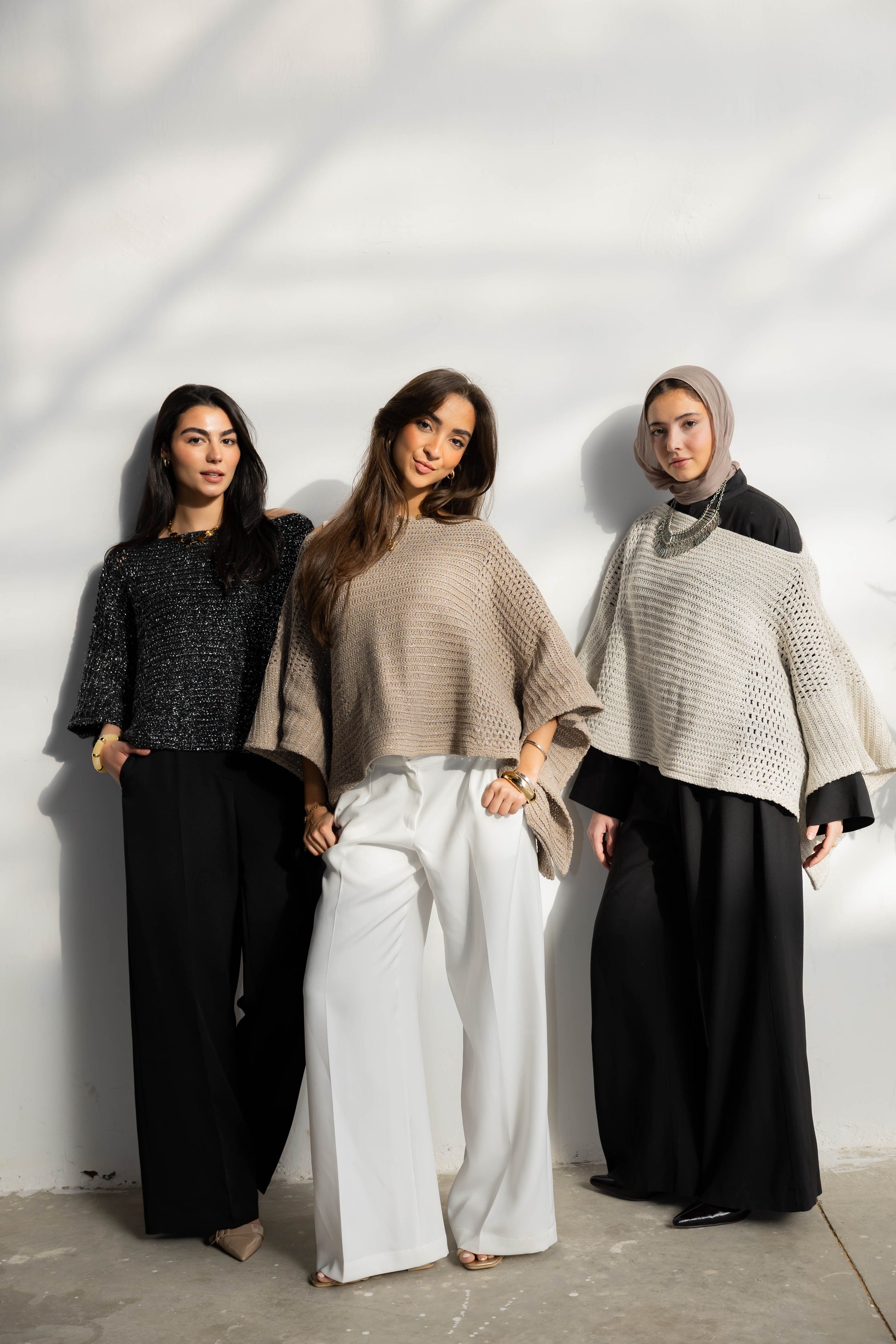 A modern statement piece with a soft, effortless feel. The Moonlit Knit Cape features a relaxed, draped silhouette with wide sleeves and a breathable textured knit that moves gracefully with the body. Designed for comfort and ease, it offers a lightweight layer that elevates everyday looks while remaining versatile and timeless. Perfect for transitional weather, it brings a sense of quiet elegance to both casual and refined styling.
