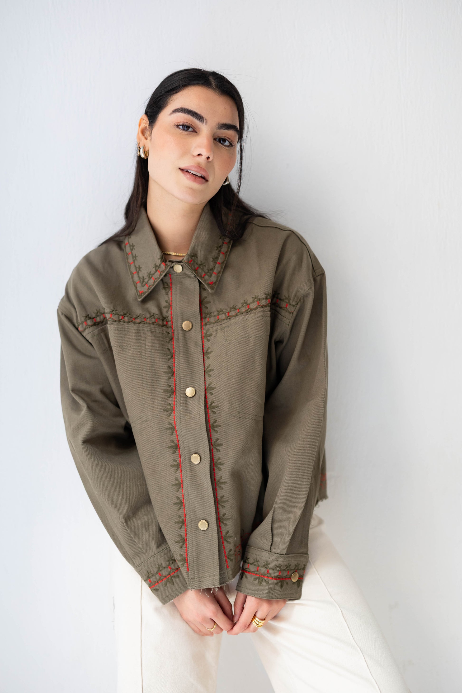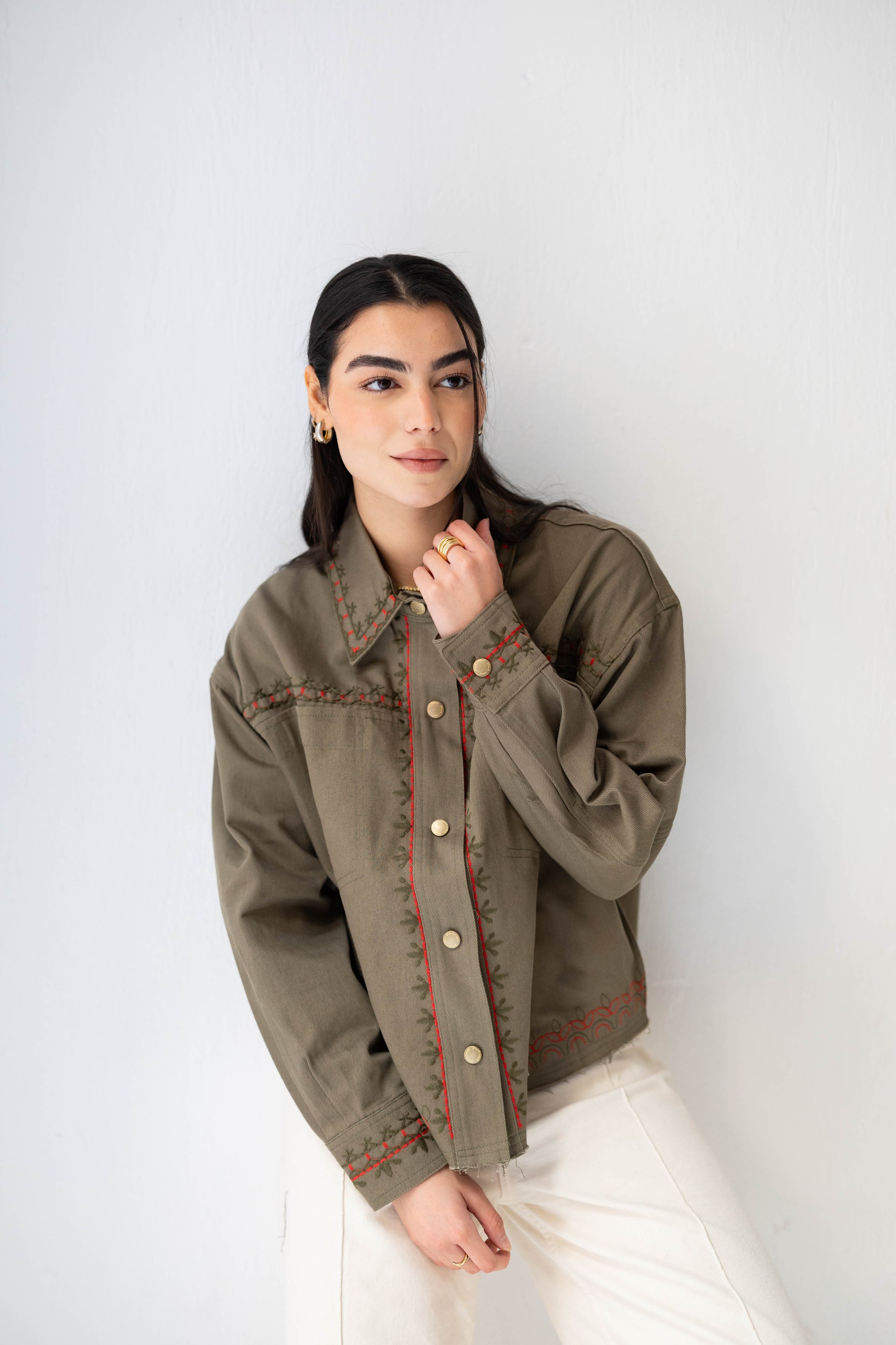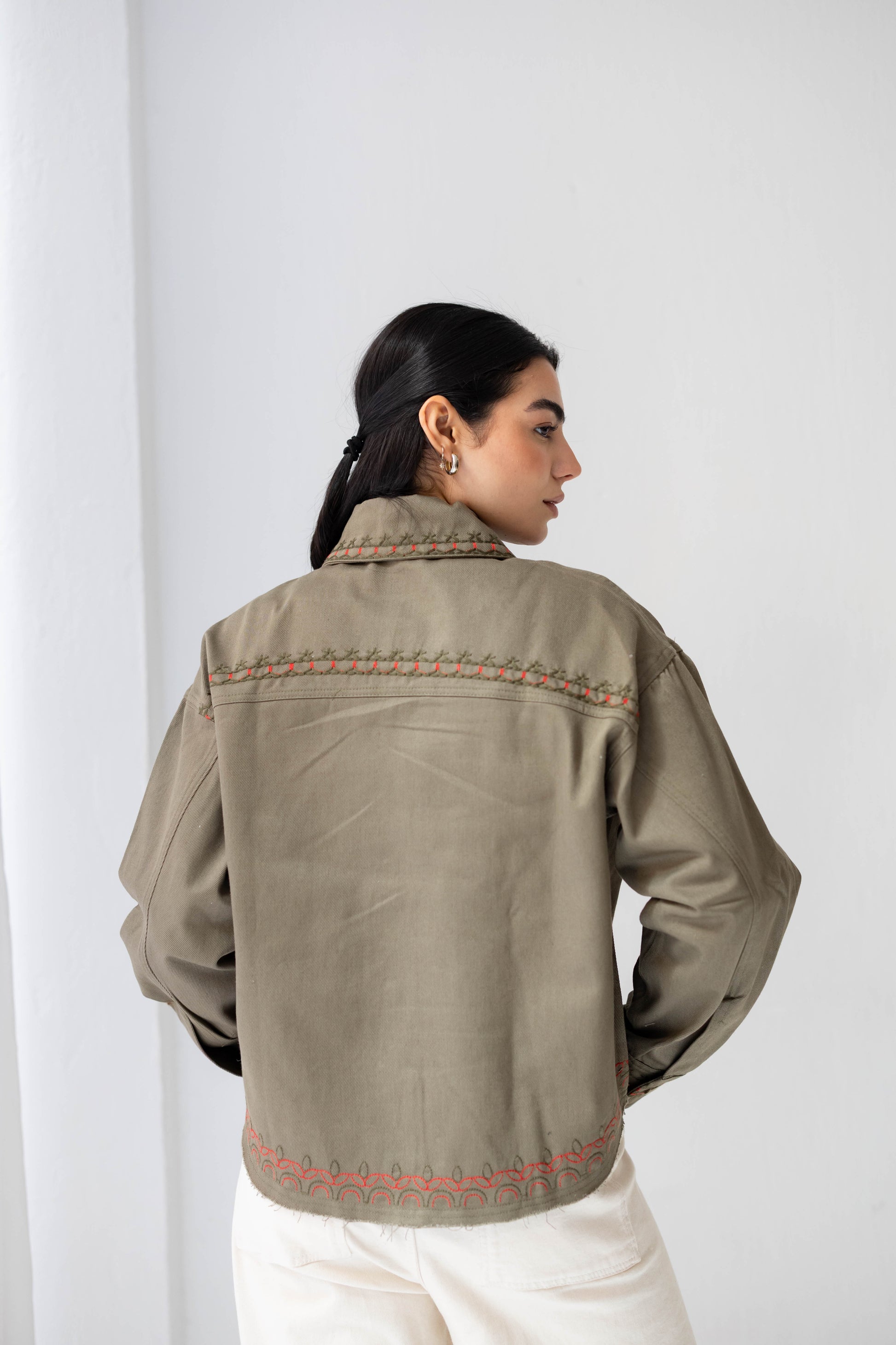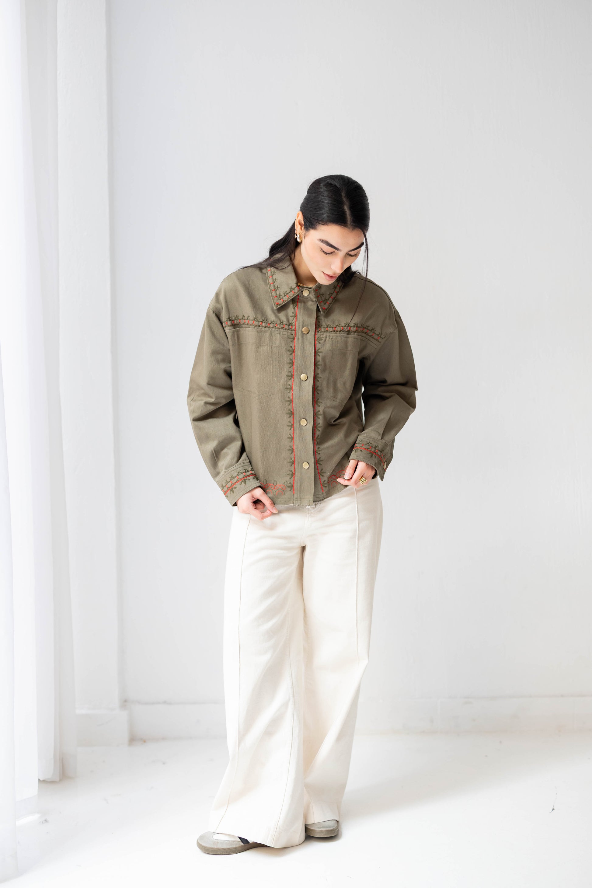 A statement piece crafted from structured fabric, featuring delicate contrast stitching that adds a refined, modern edge. This jacket blends minimal design with artistic detailing, making it perfect for elevating everyday looks or completing a polished, evening-ready outfit.