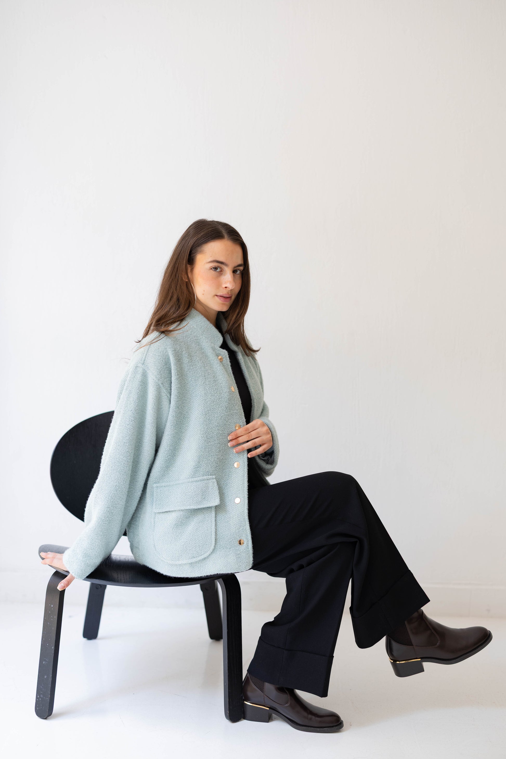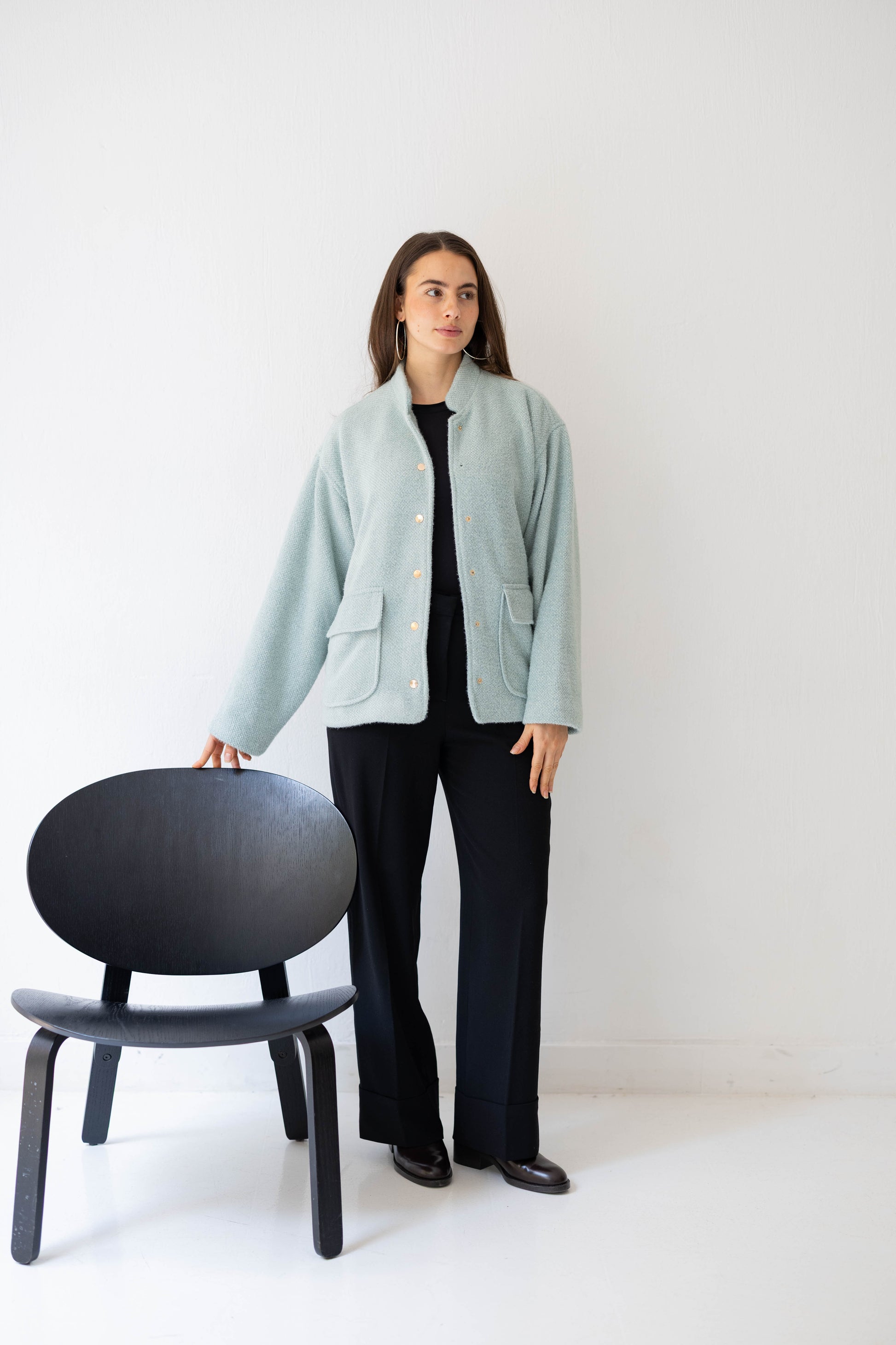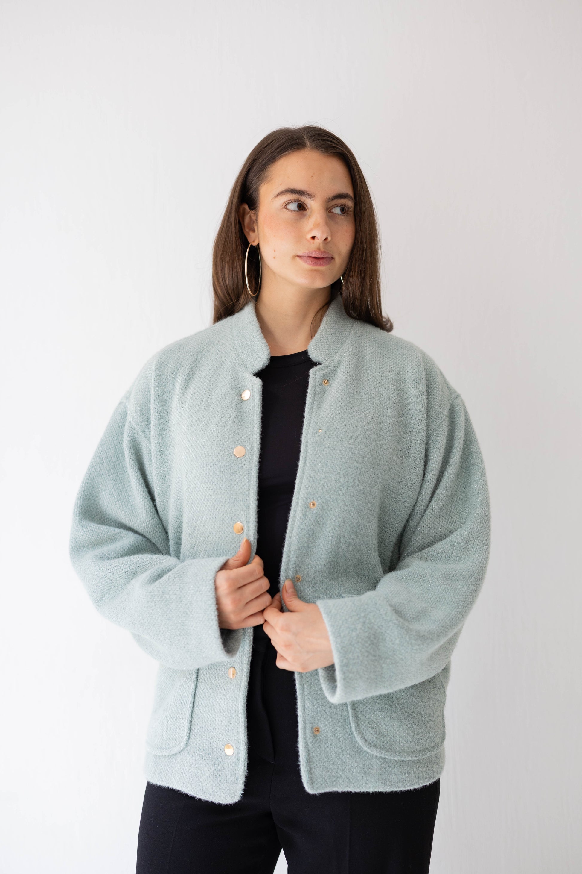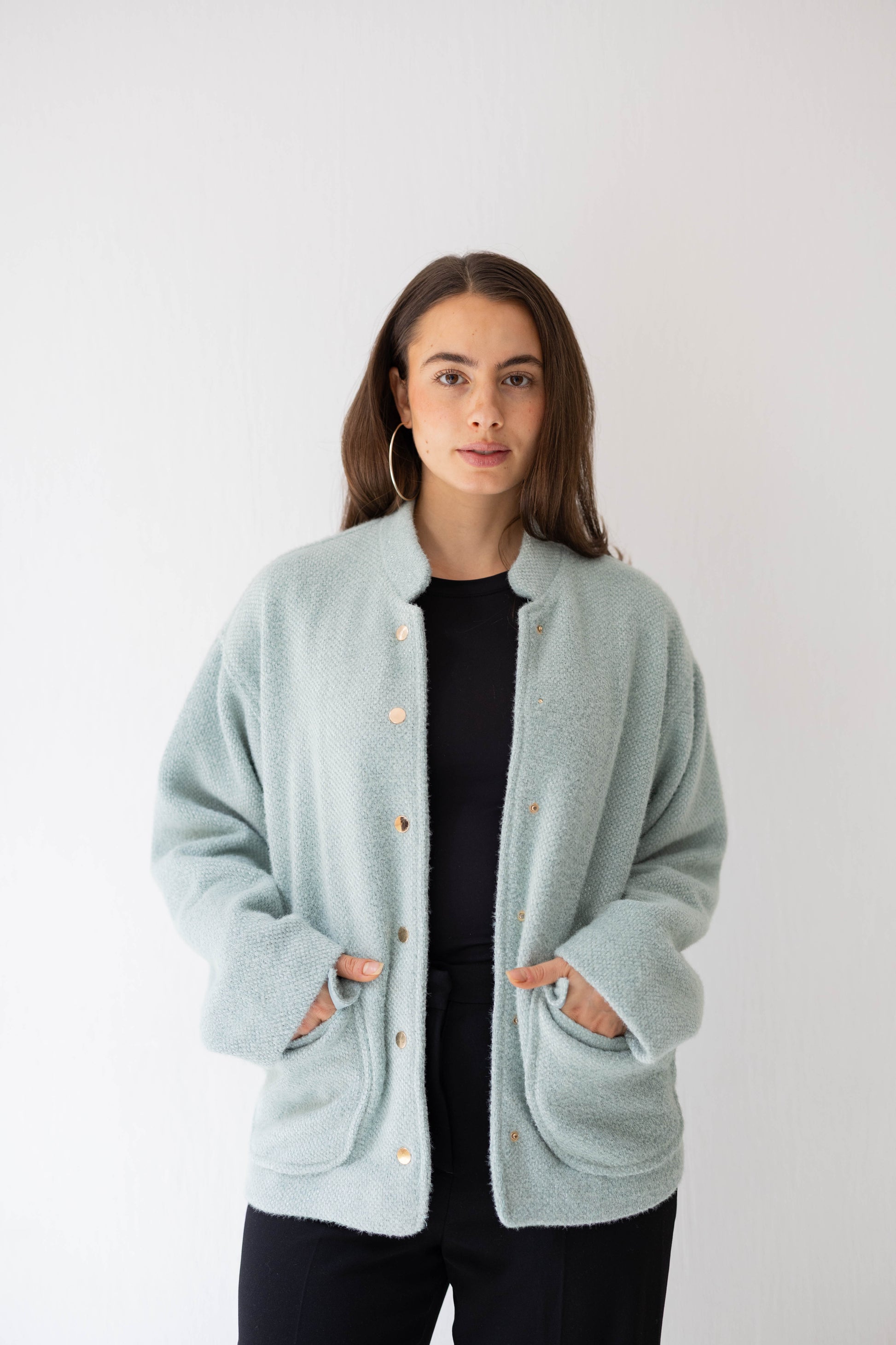 Step out in casual chic with the Shimmer Bomber Jacket – crafted from soft, knitted fabric with a subtle shimmer, featuring gold buttons and a comfortable elastic back band. The perfect mix of relaxed style and a touch of sparkle.