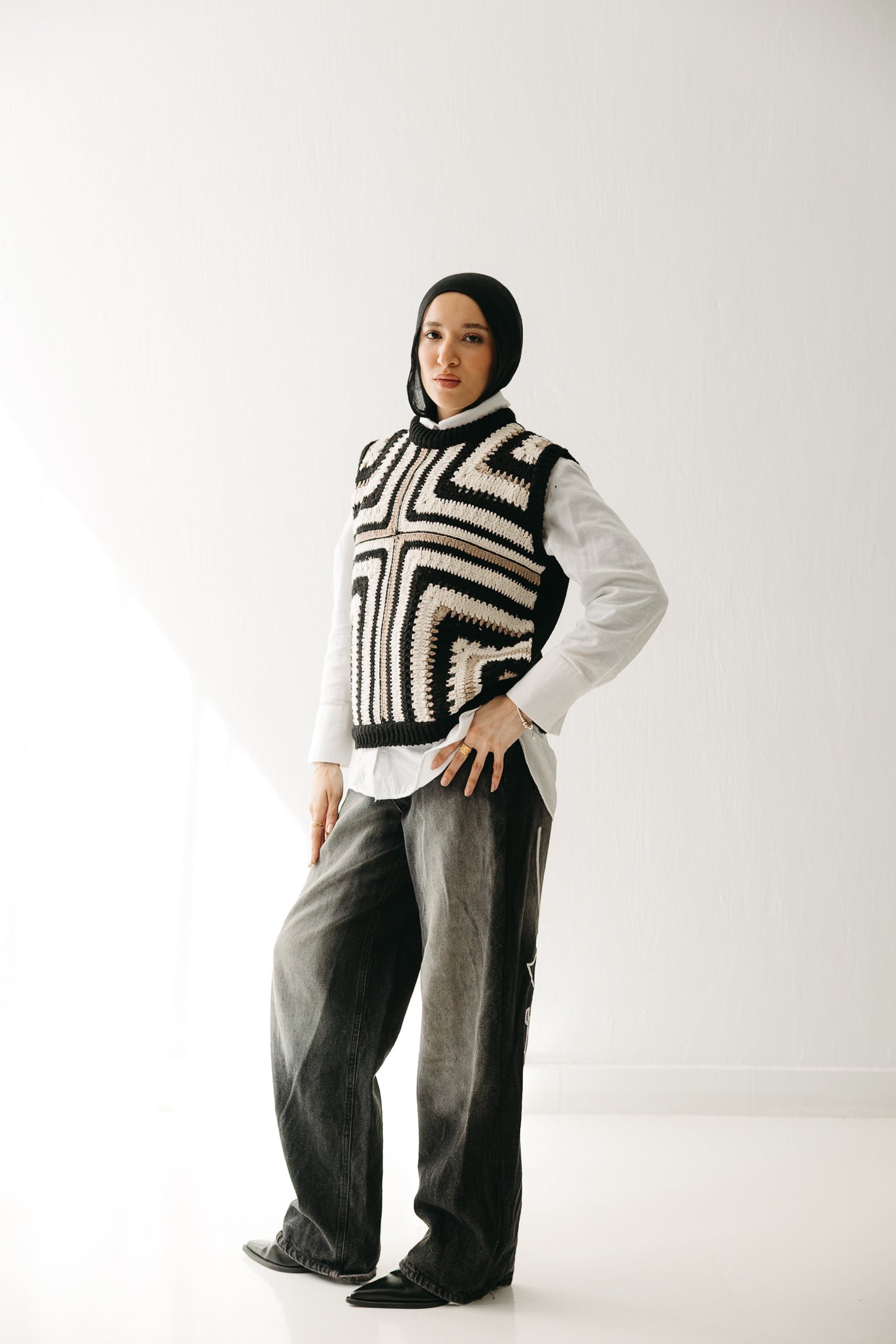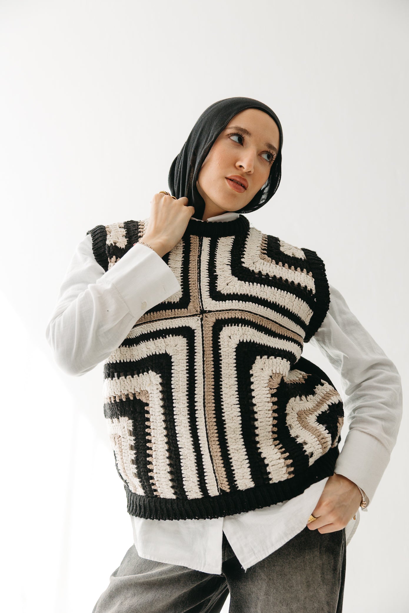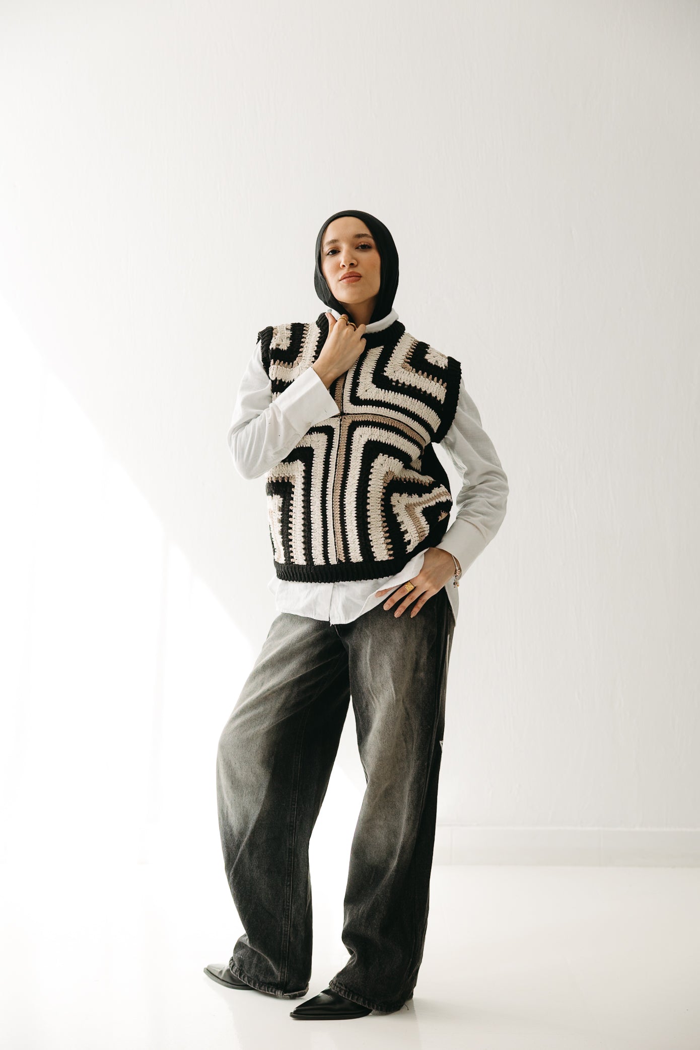 The Artisan Vest celebrates the beauty of craftsmanship. Hand-crocheted with intricate stitches and bold geometric patterns, each piece carries a unique story of skill and detail. A statement layer that blends artistry with timeless style, making it a true wardrobe treasure.