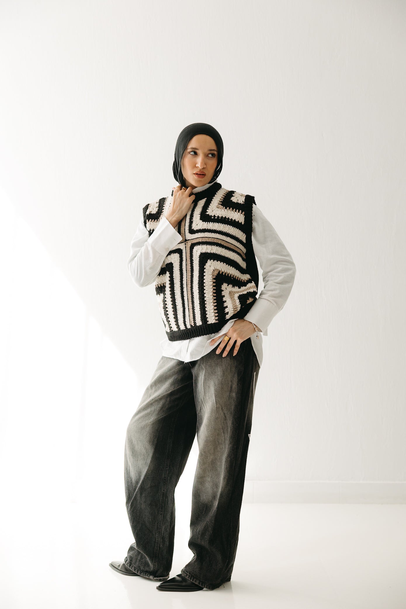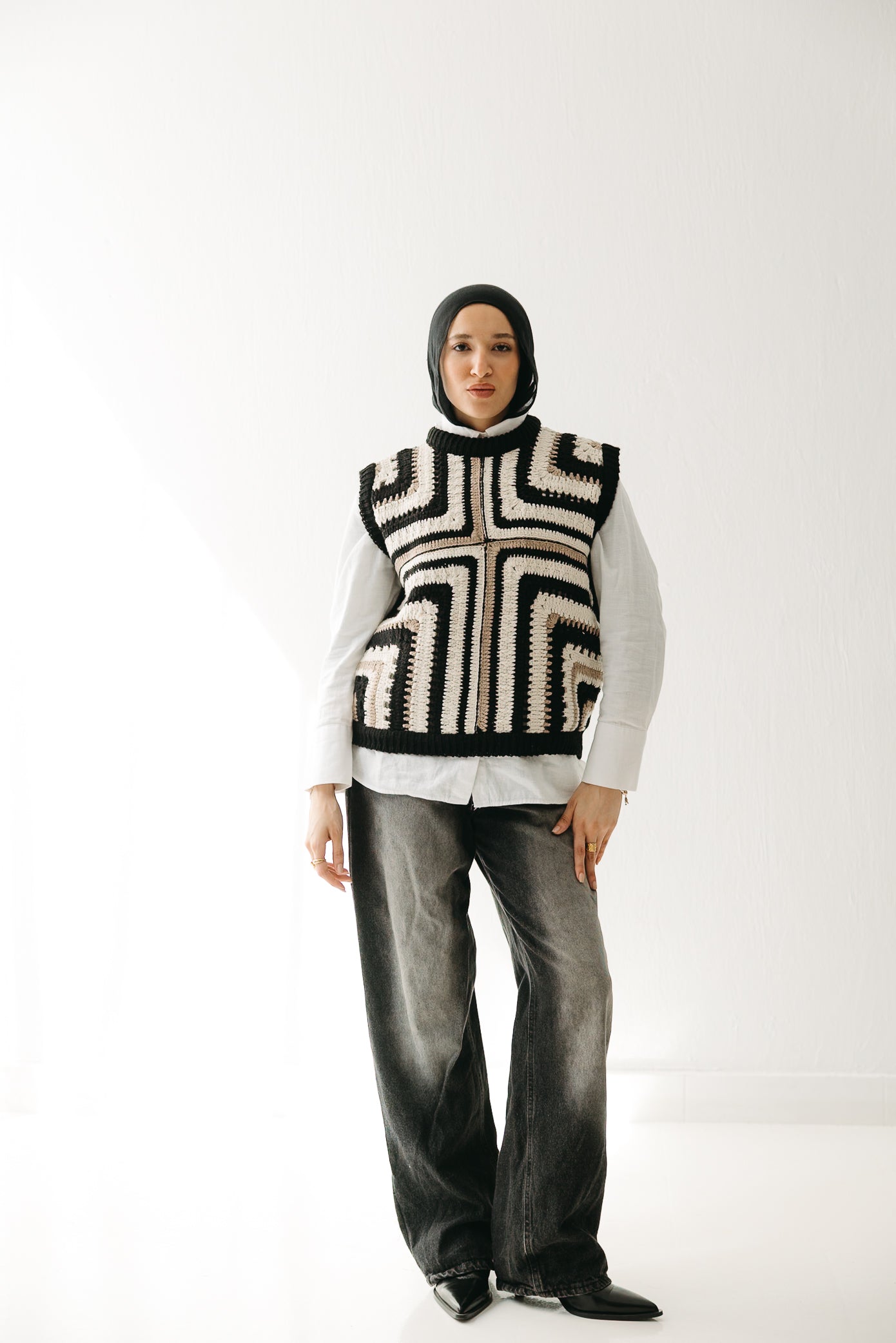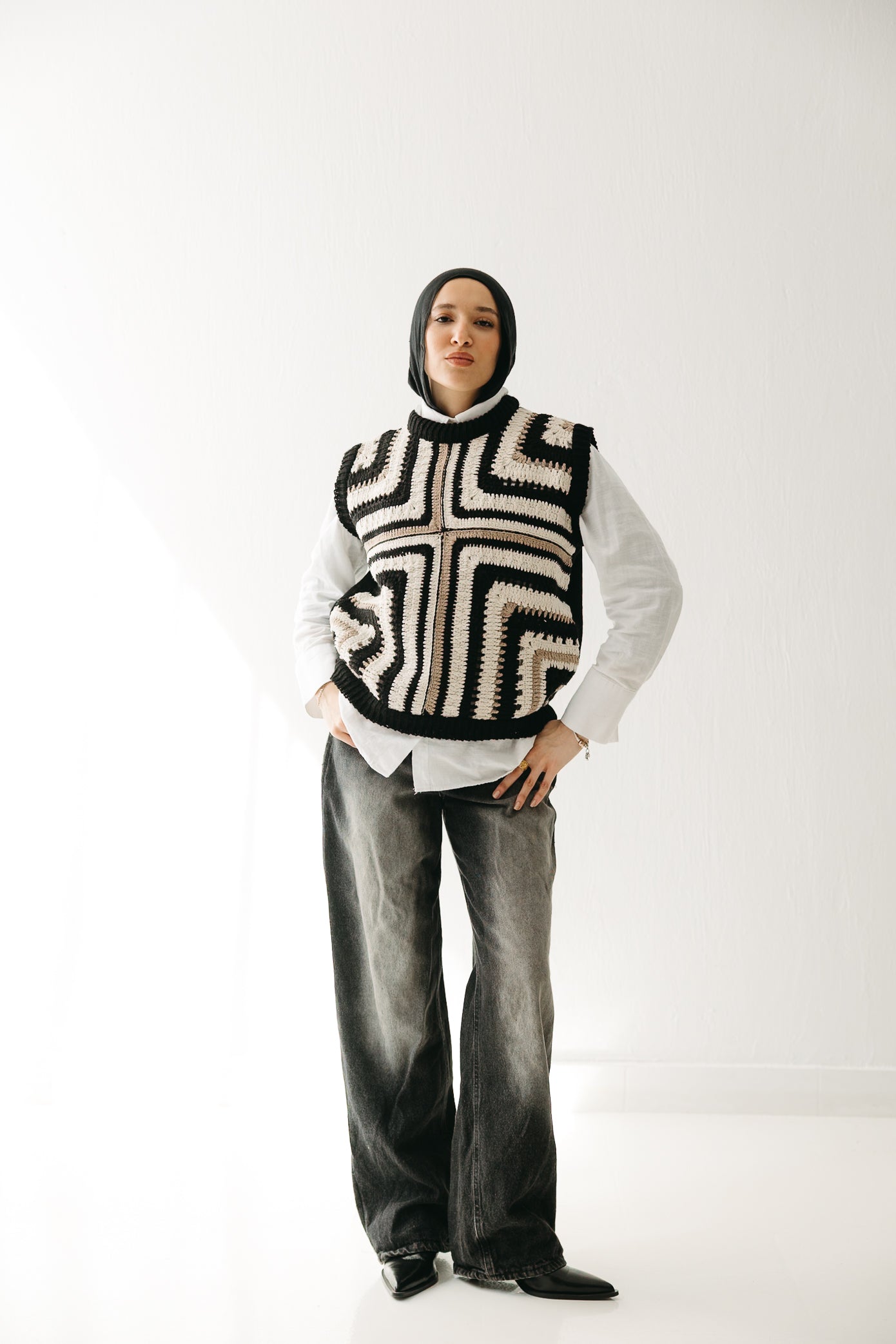 The Artisan Vest celebrates the beauty of craftsmanship. Hand-crocheted with intricate stitches and bold geometric patterns, each piece carries a unique story of skill and detail. A statement layer that blends artistry with timeless style, making it a true wardrobe treasure.