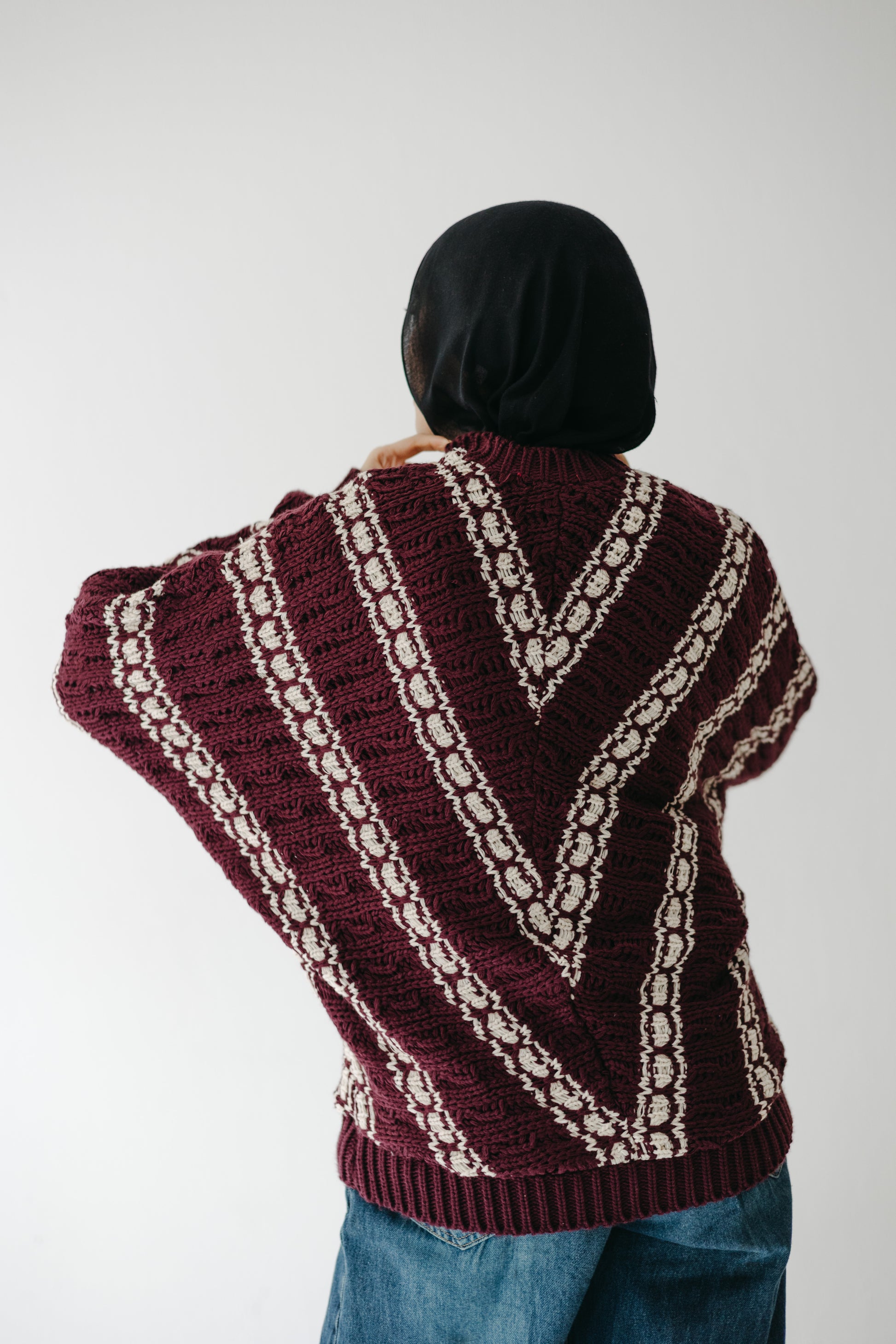 The bold chevron weave evokes mountain ridges and ski-lodge nostalgia, while the palette stays grounded in cold, wintery tones.