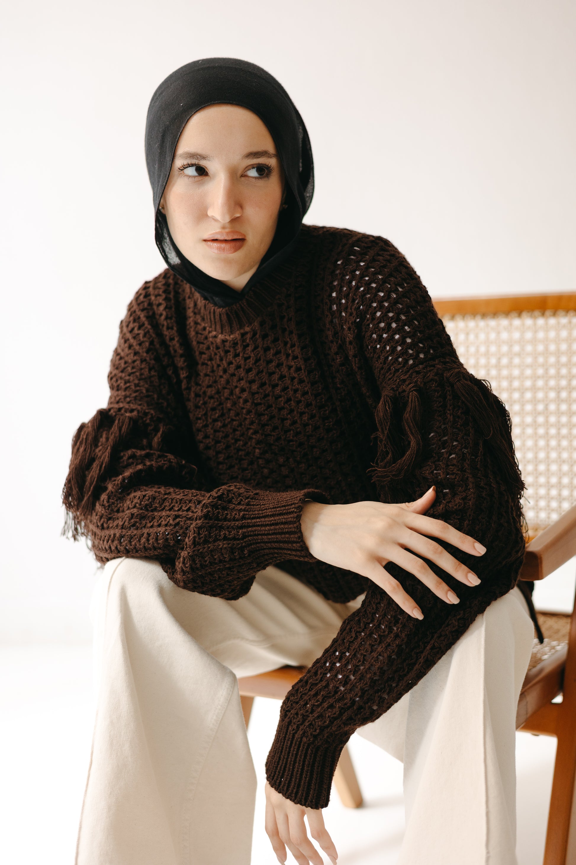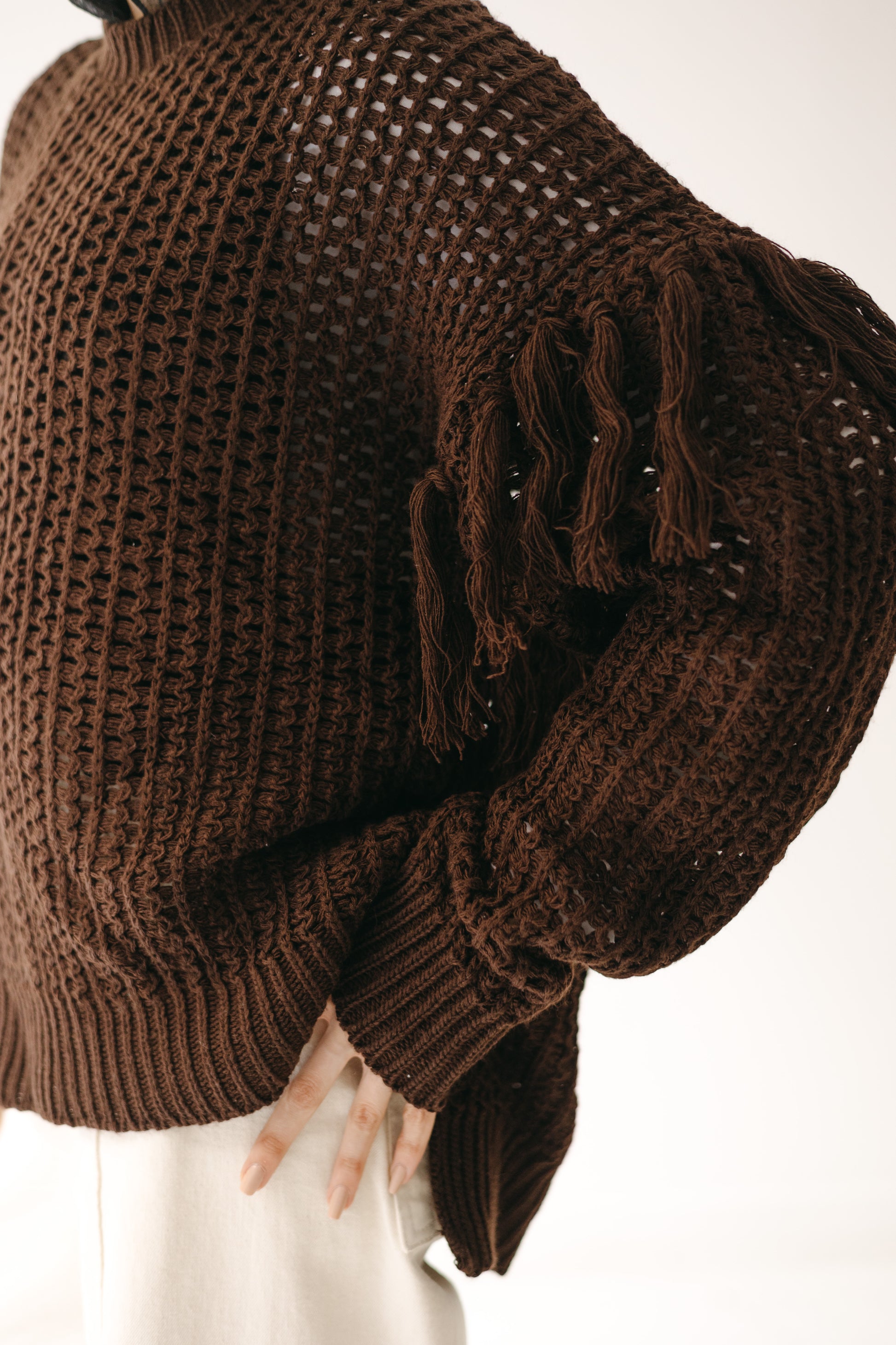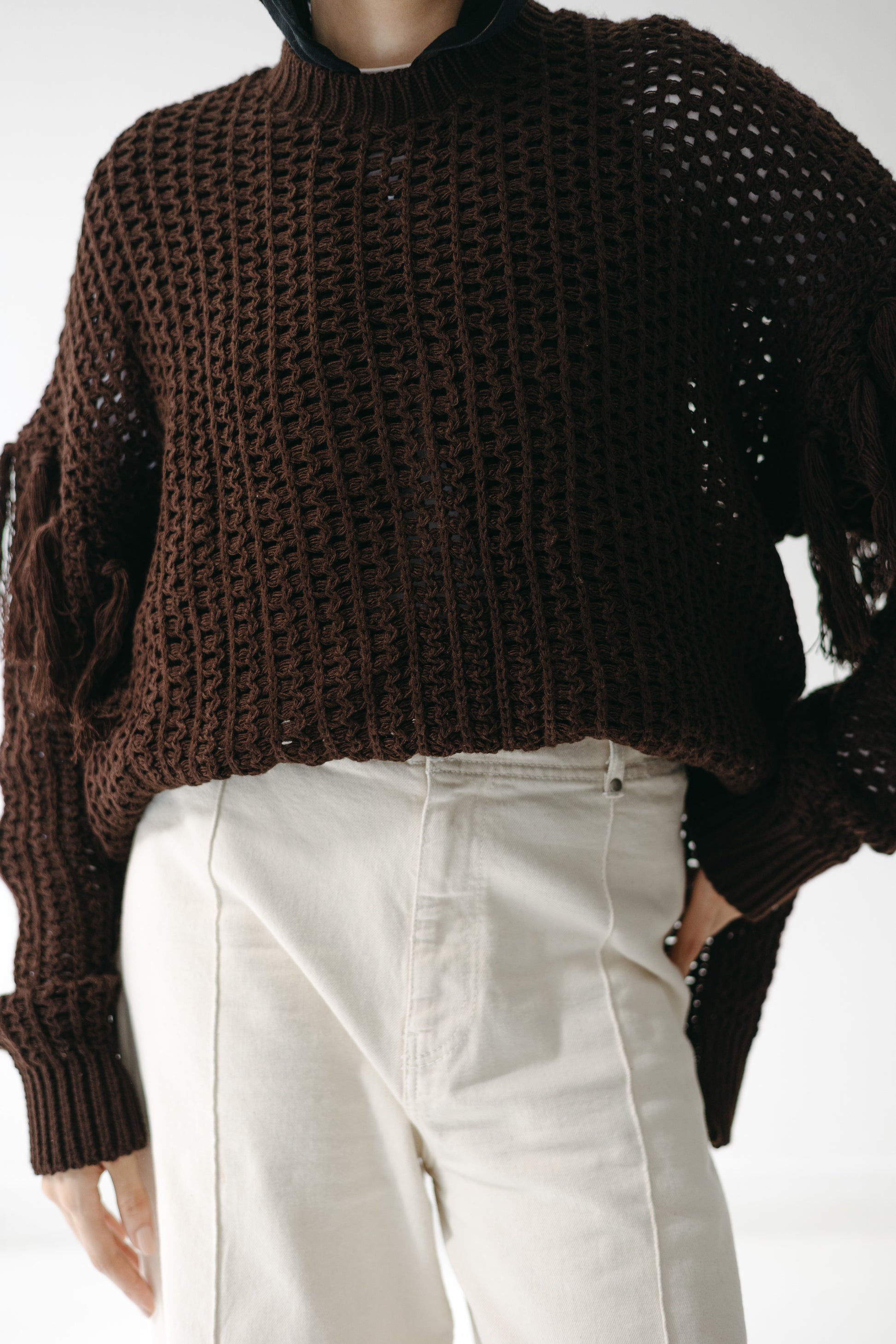 The Fringed Flow Knit is crafted with an airy open weave and elevated by fringed sleeves that move gracefully with every step. Designed with a relaxed high-low hem and dropped shoulders, it brings structure and softness together — a calm expression of effortless layering.