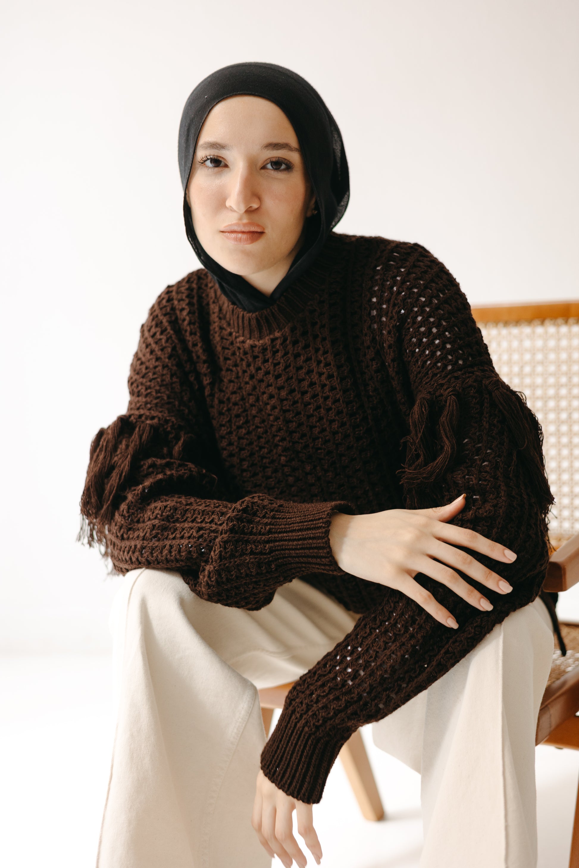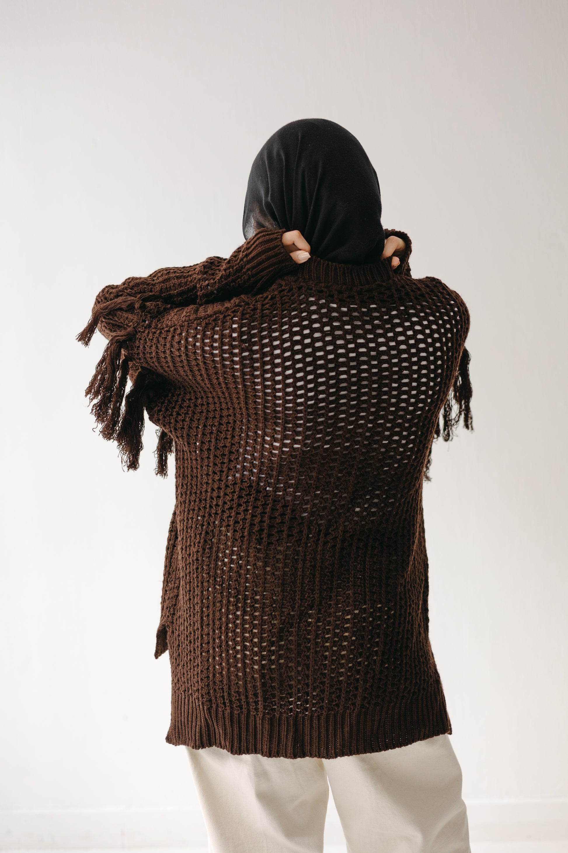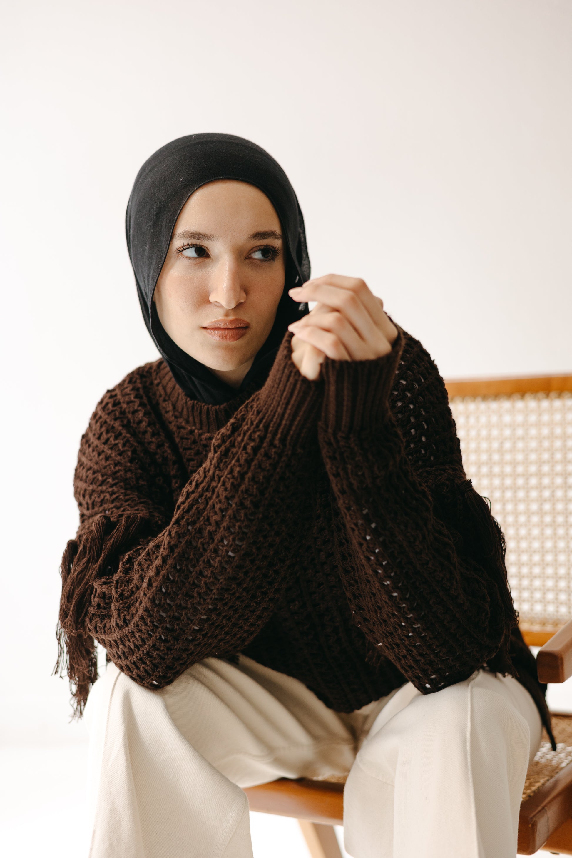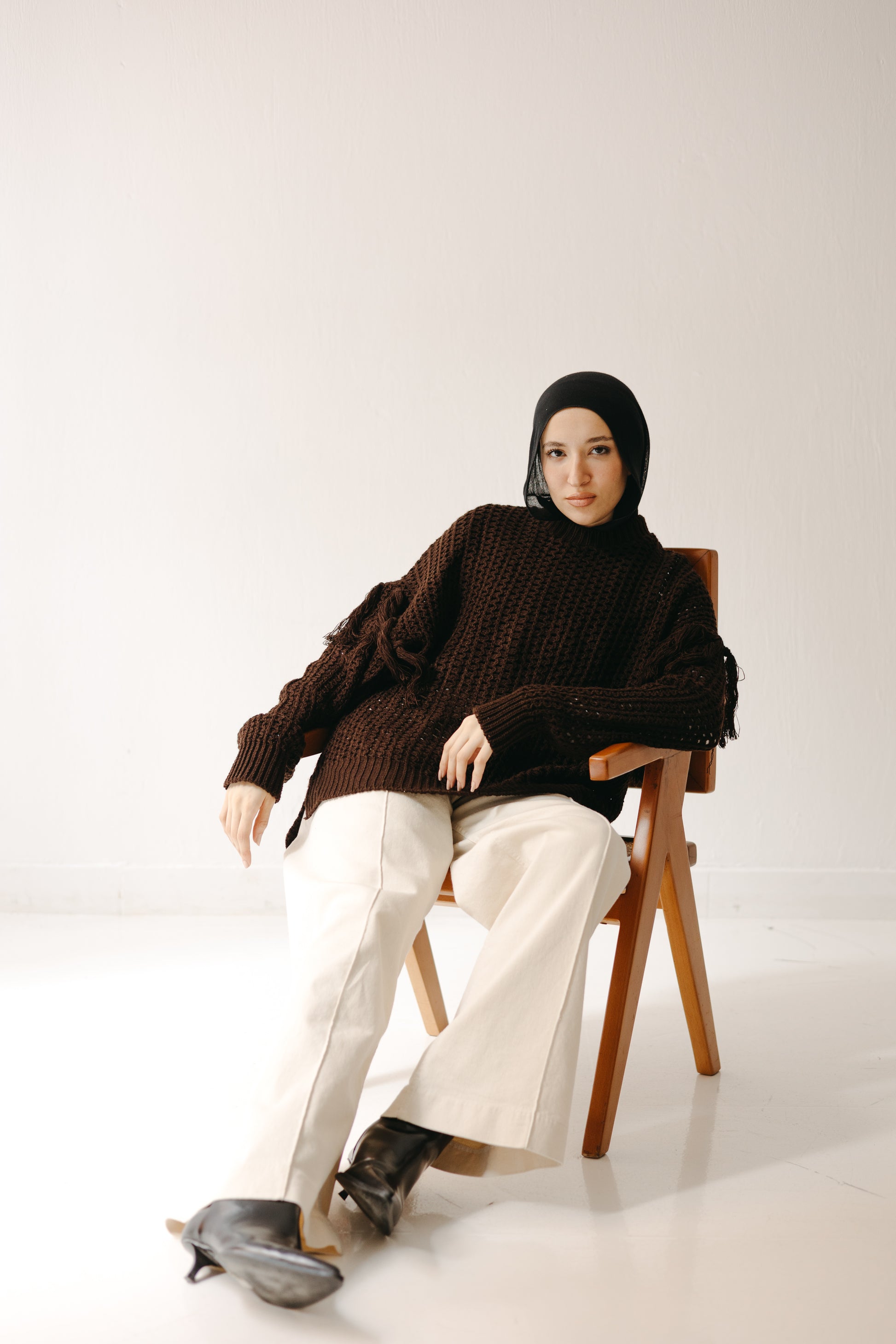 The Fringed Flow Knit is crafted with an airy open weave and elevated by fringed sleeves that move gracefully with every step. Designed with a relaxed high-low hem and dropped shoulders, it brings structure and softness together — a calm expression of effortless layering.
