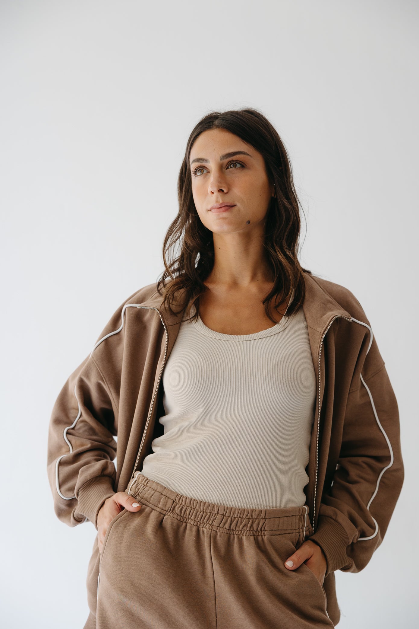 Minimal details, maximum impact. Featuring sleek piping lines and a relaxed zip-up design, this set blends sporty elegance with everyday comfort. Perfect for laid-back days, travel, or styling with sneakers for a modern, effortless look.
