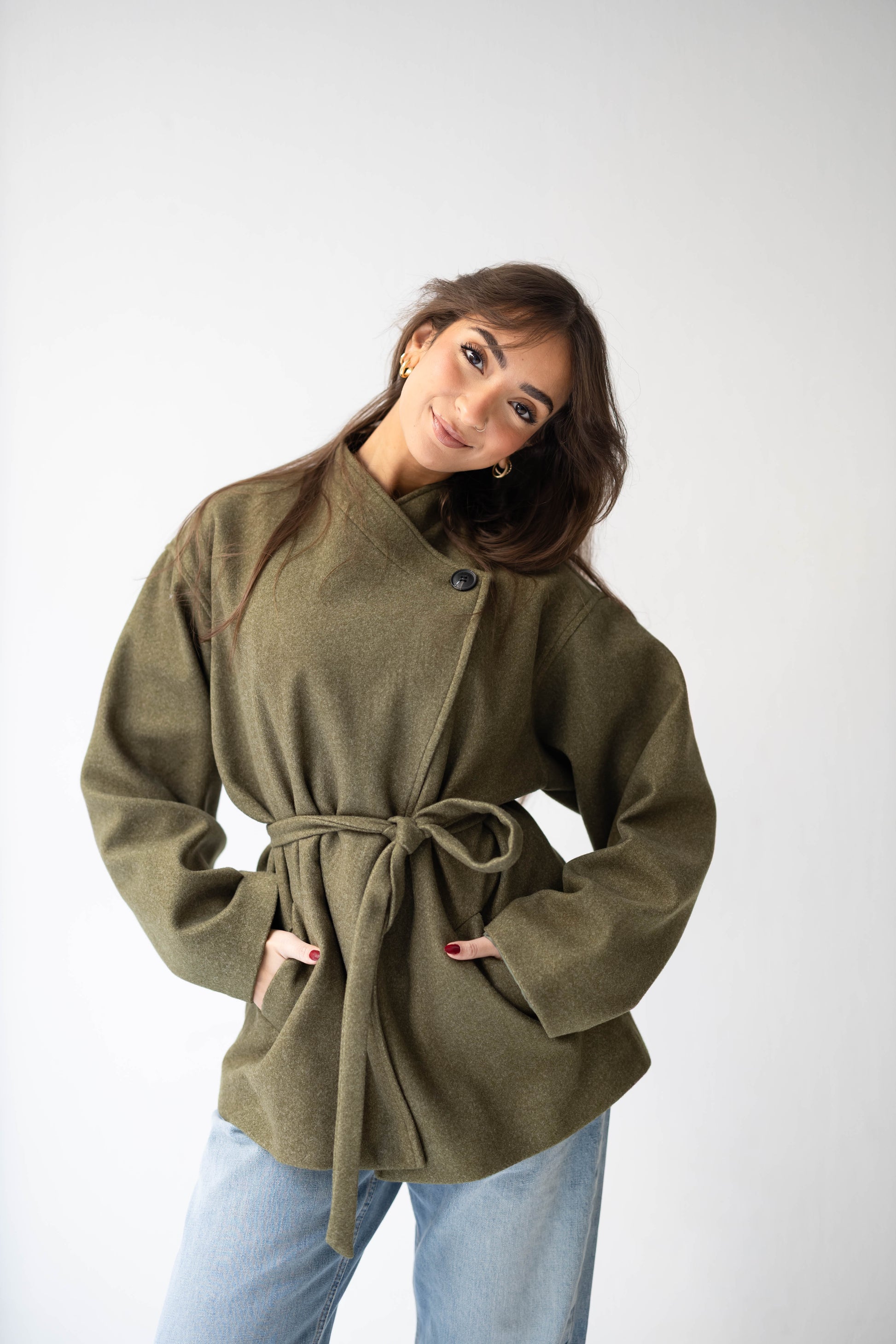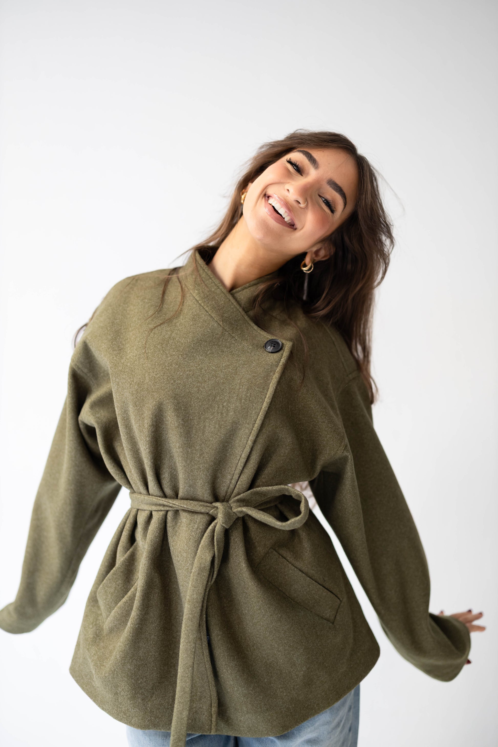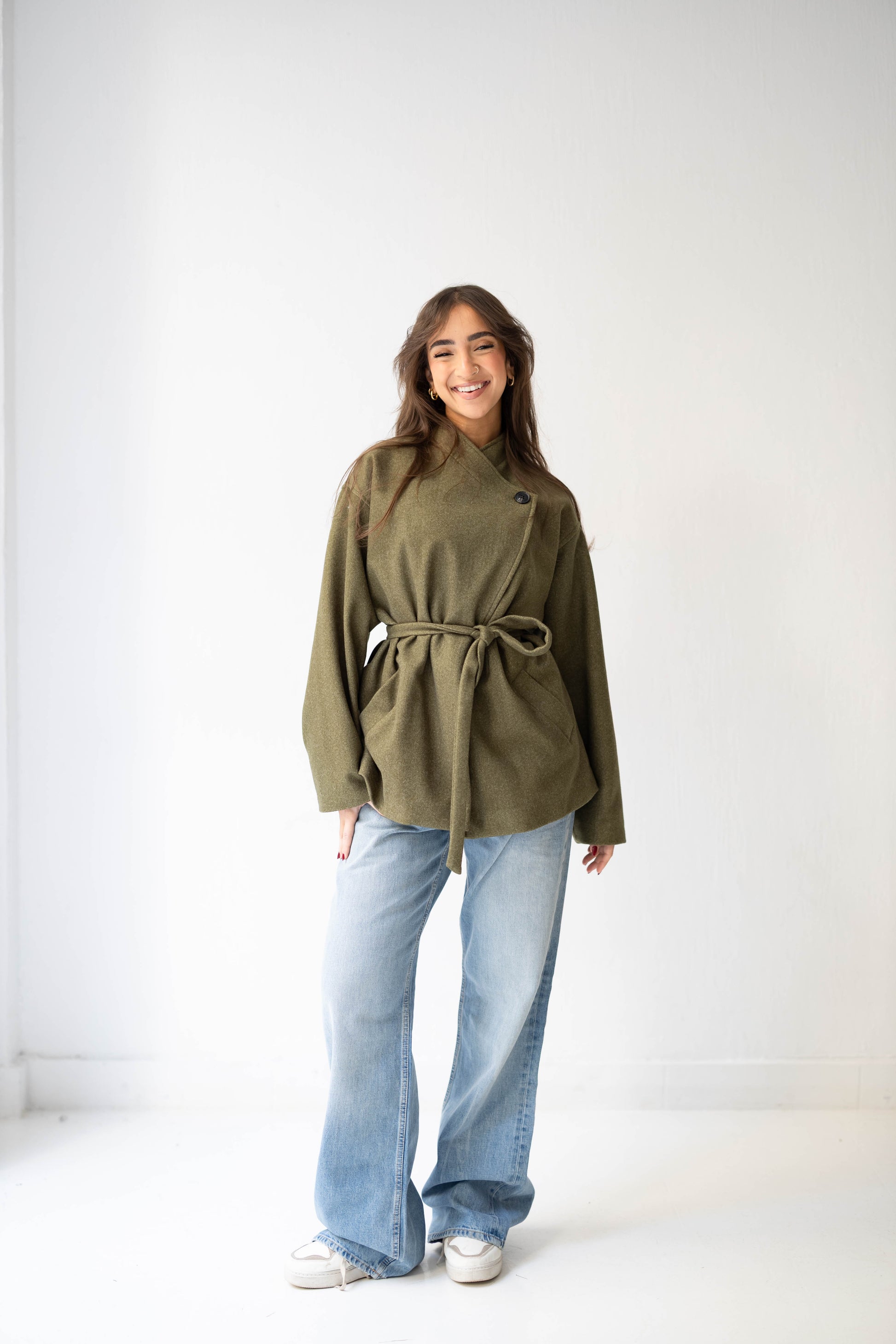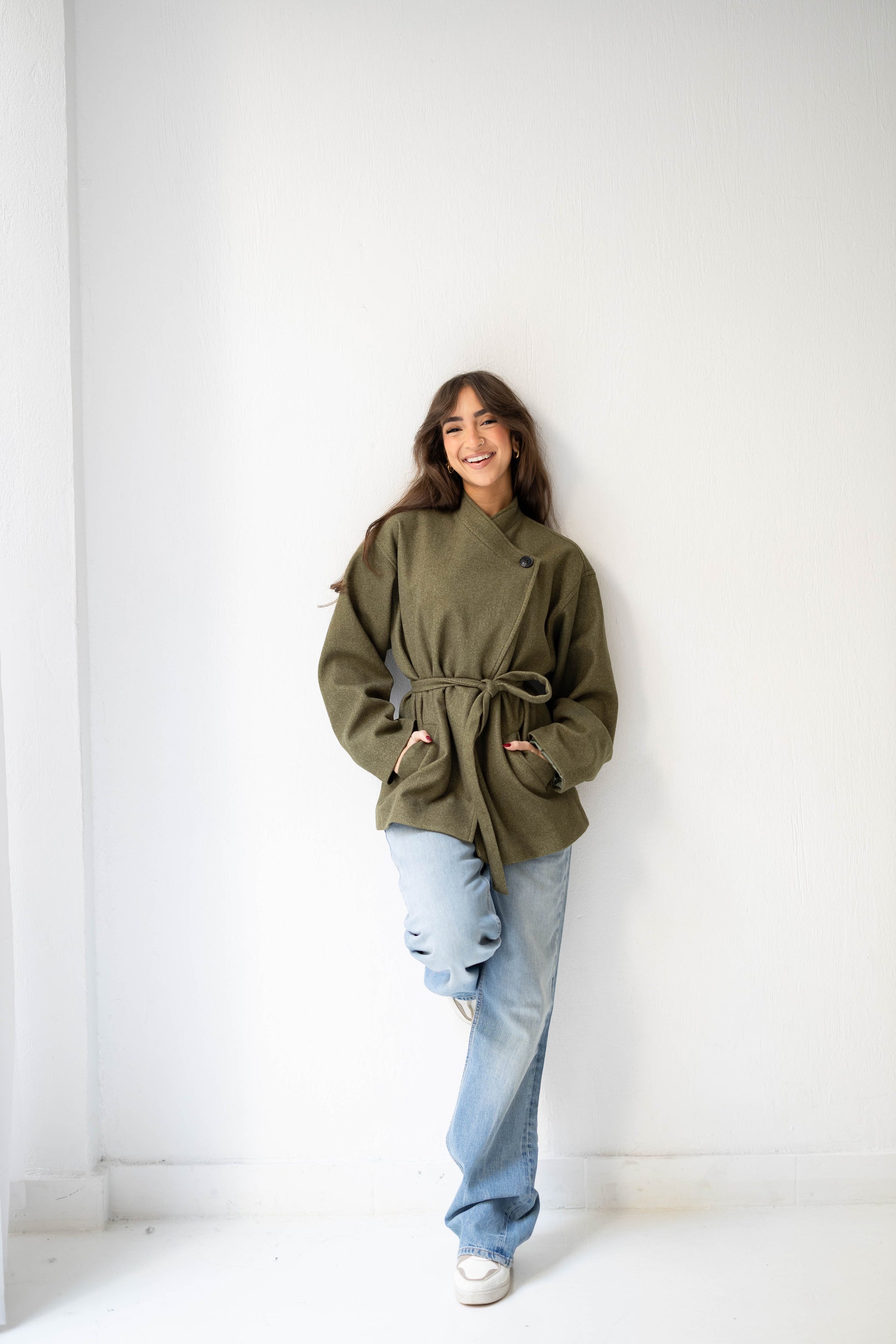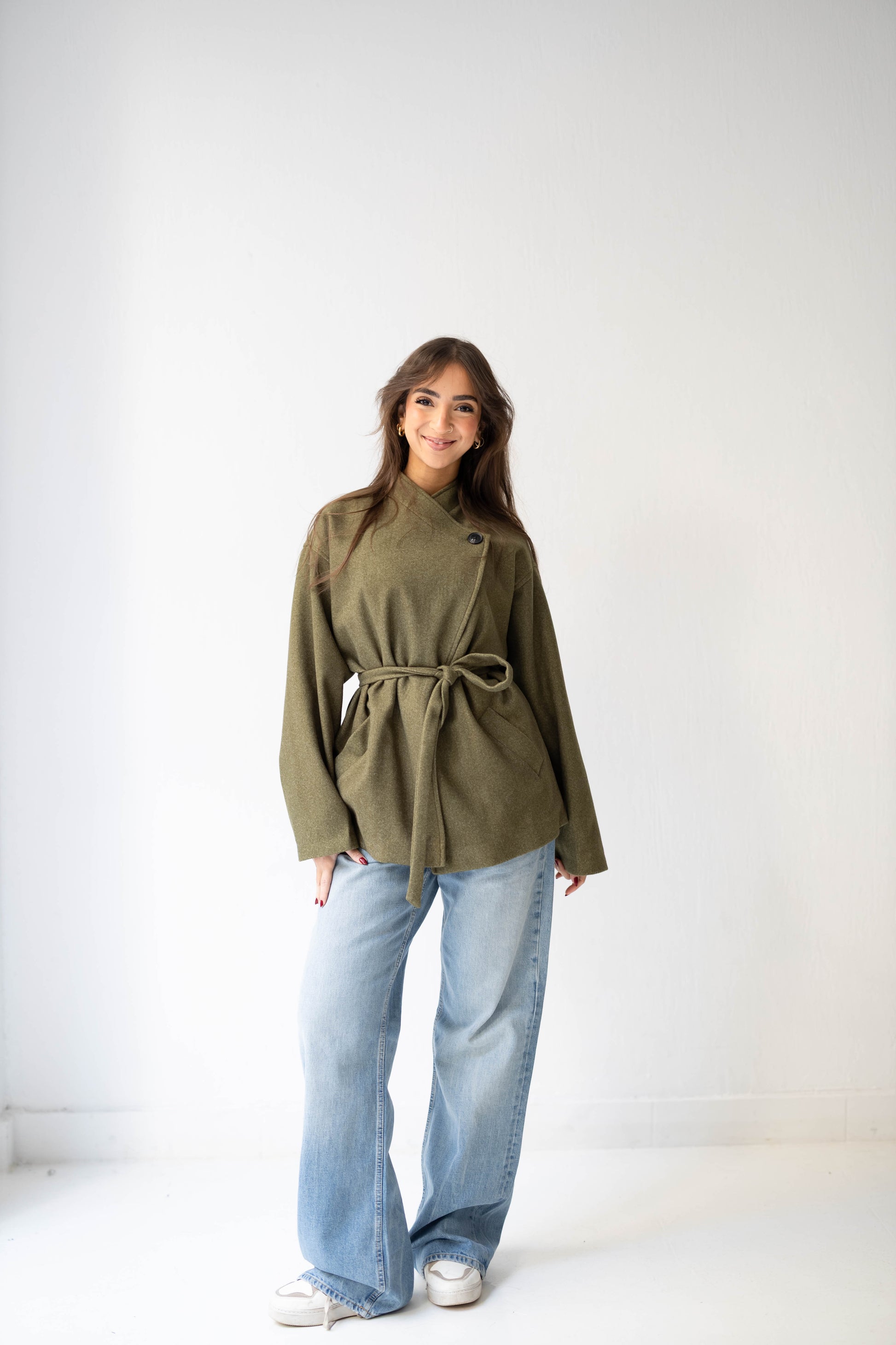 A clean, effortless jacket designed with a modern wrap front and a soft belted waist. Crafted in a relaxed silhouette for everyday comfort, with a structured minimal look that elevates any outfit. Perfect for simple, timeless style.