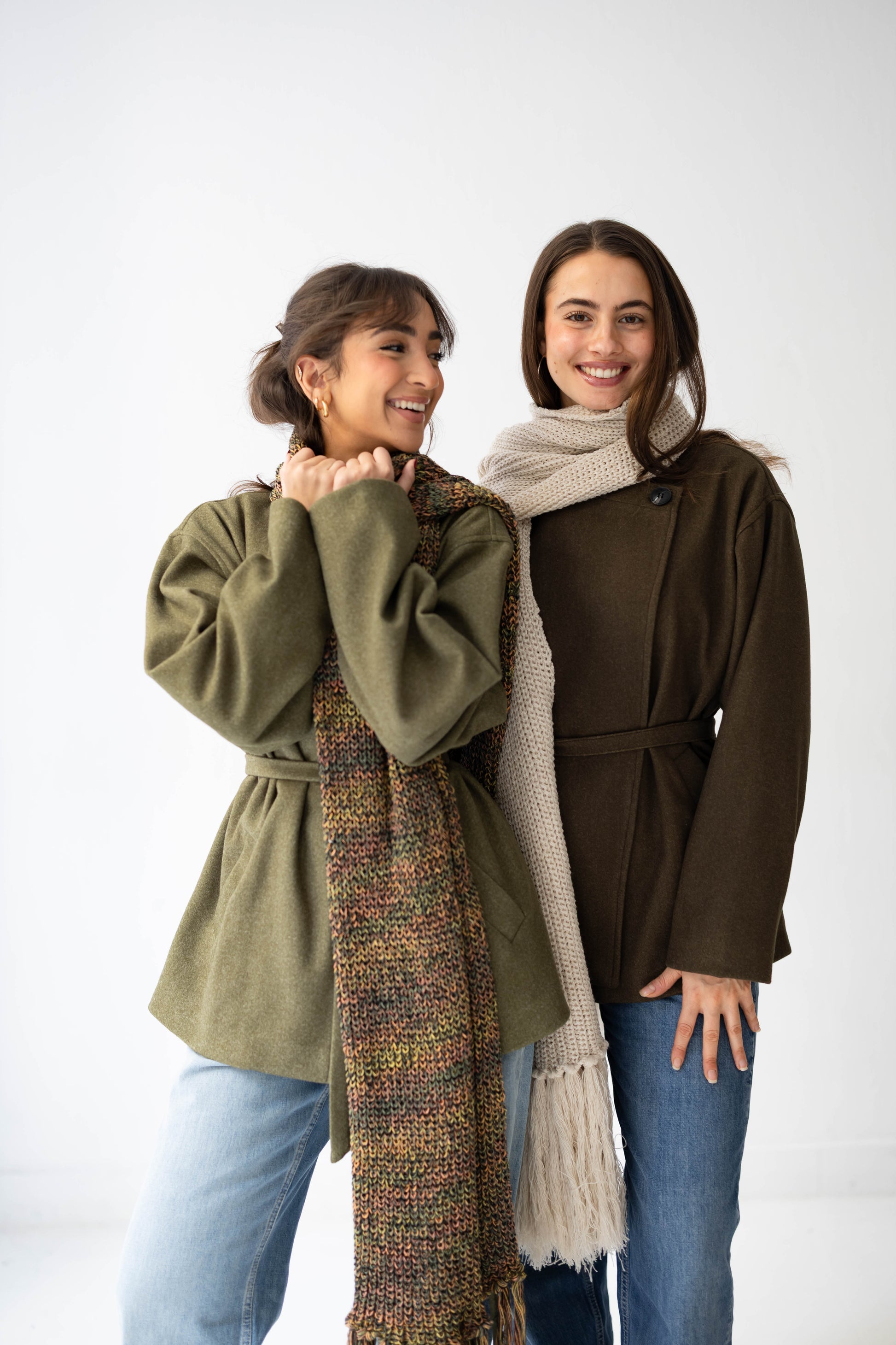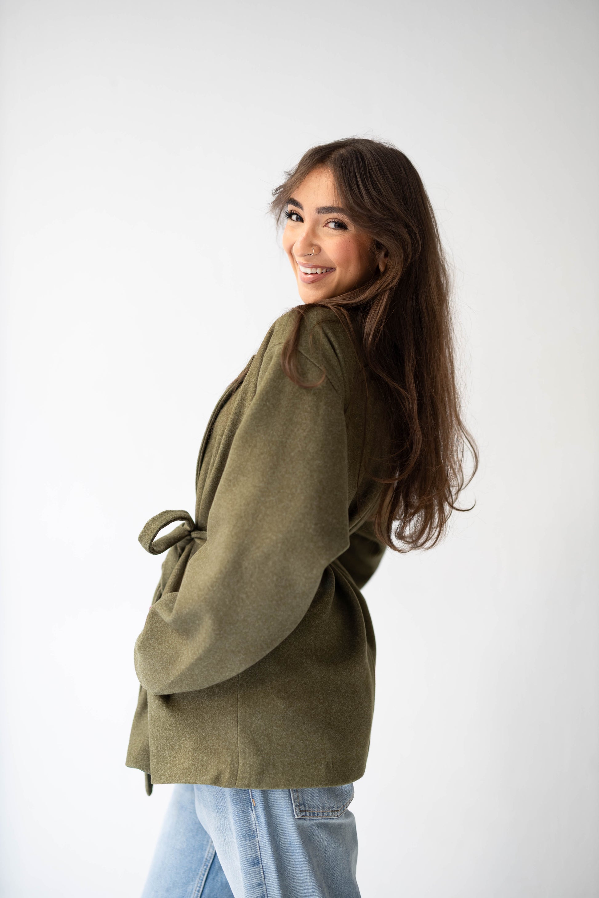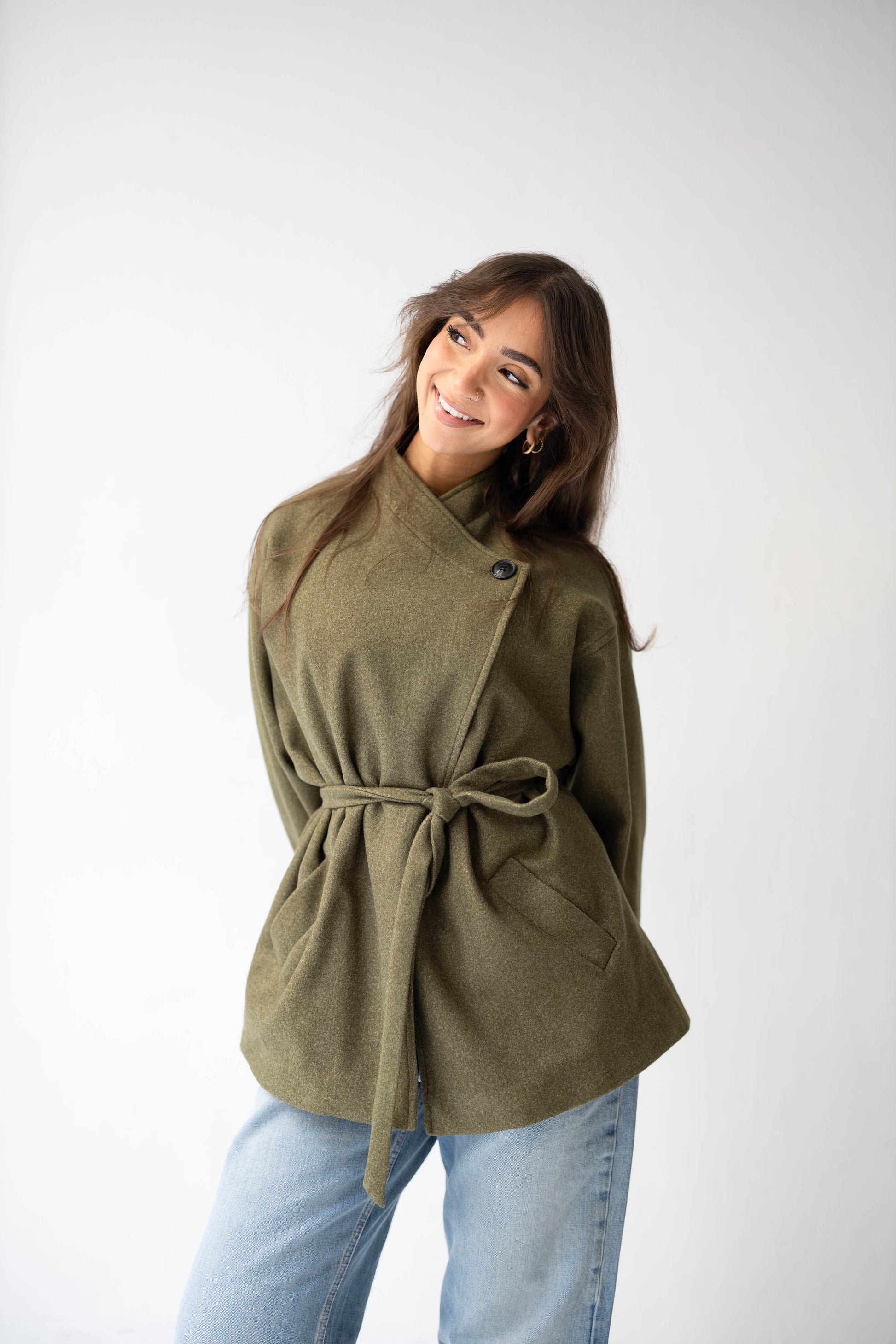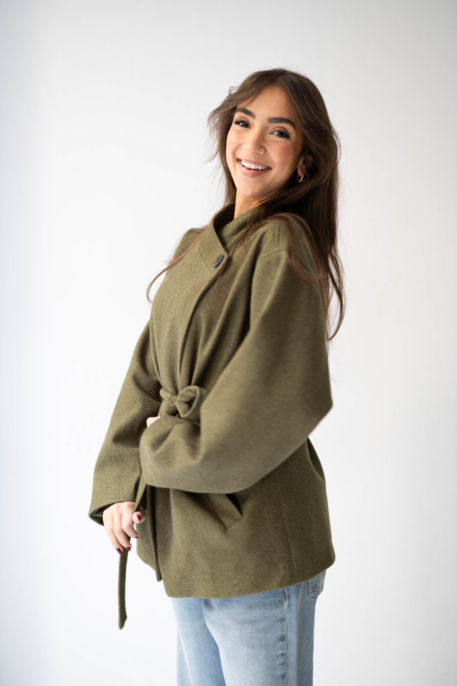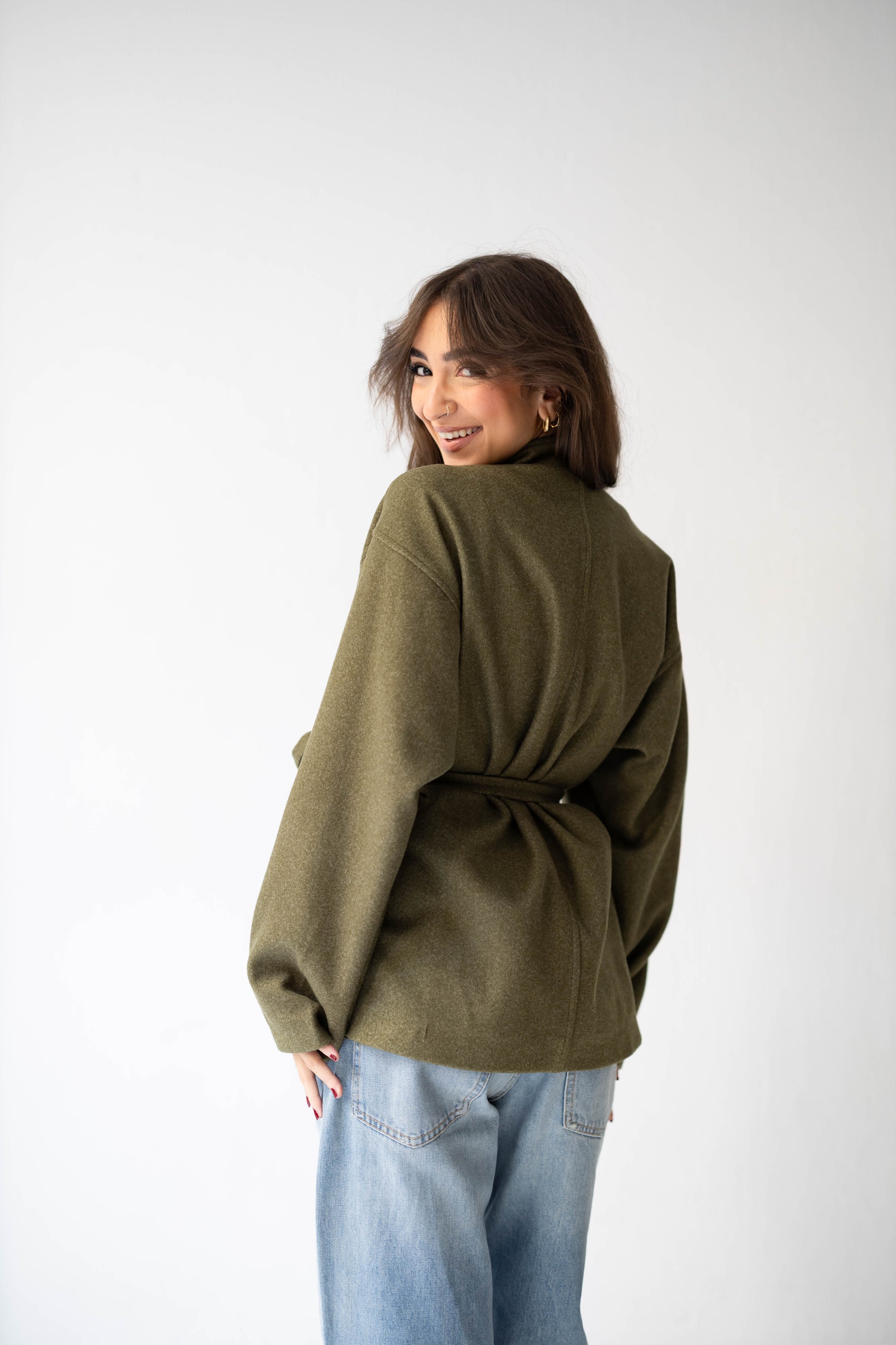 A clean, effortless jacket designed with a modern wrap front and a soft belted waist. Crafted in a relaxed silhouette for everyday comfort, with a structured minimal look that elevates any outfit. Perfect for simple, timeless style.