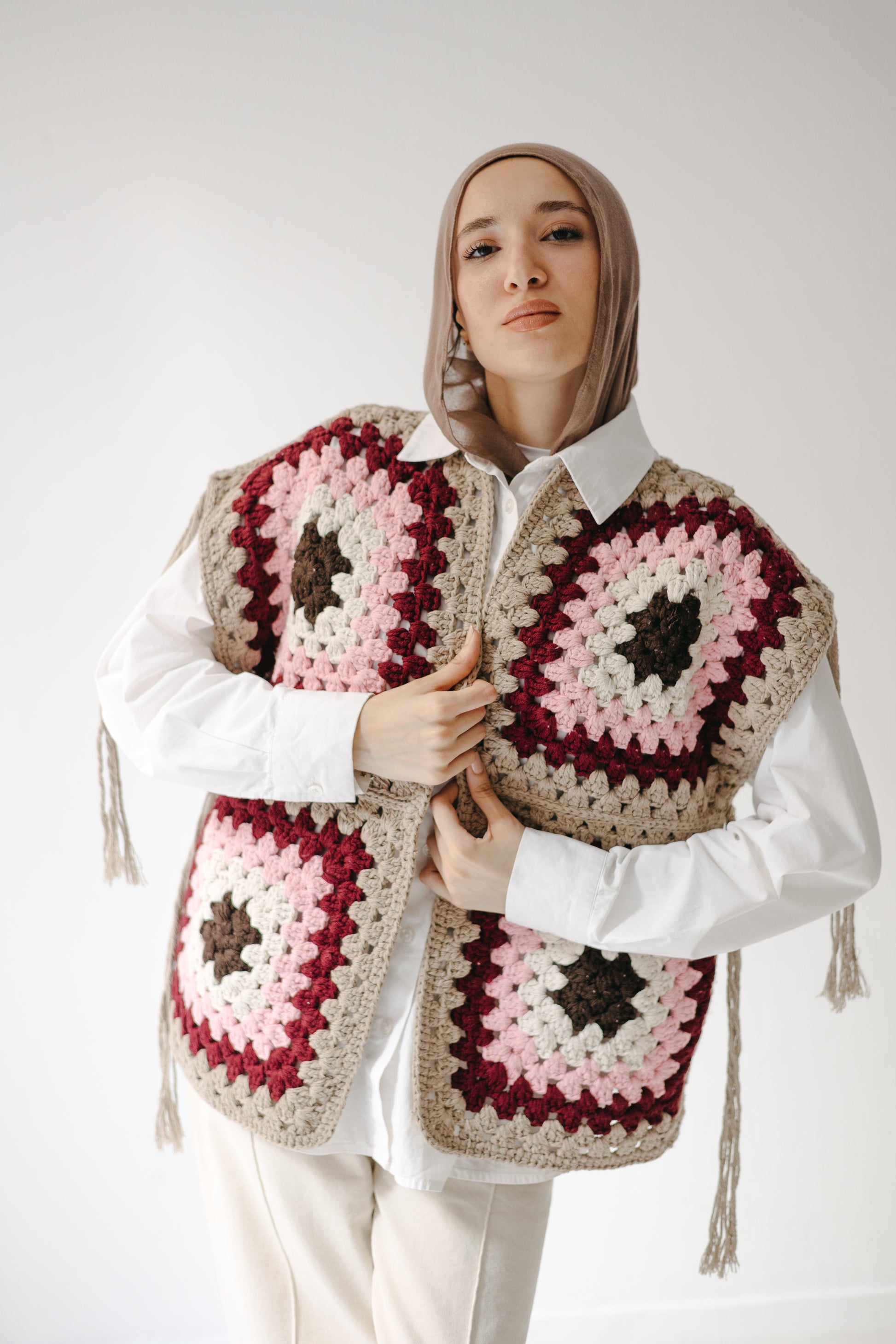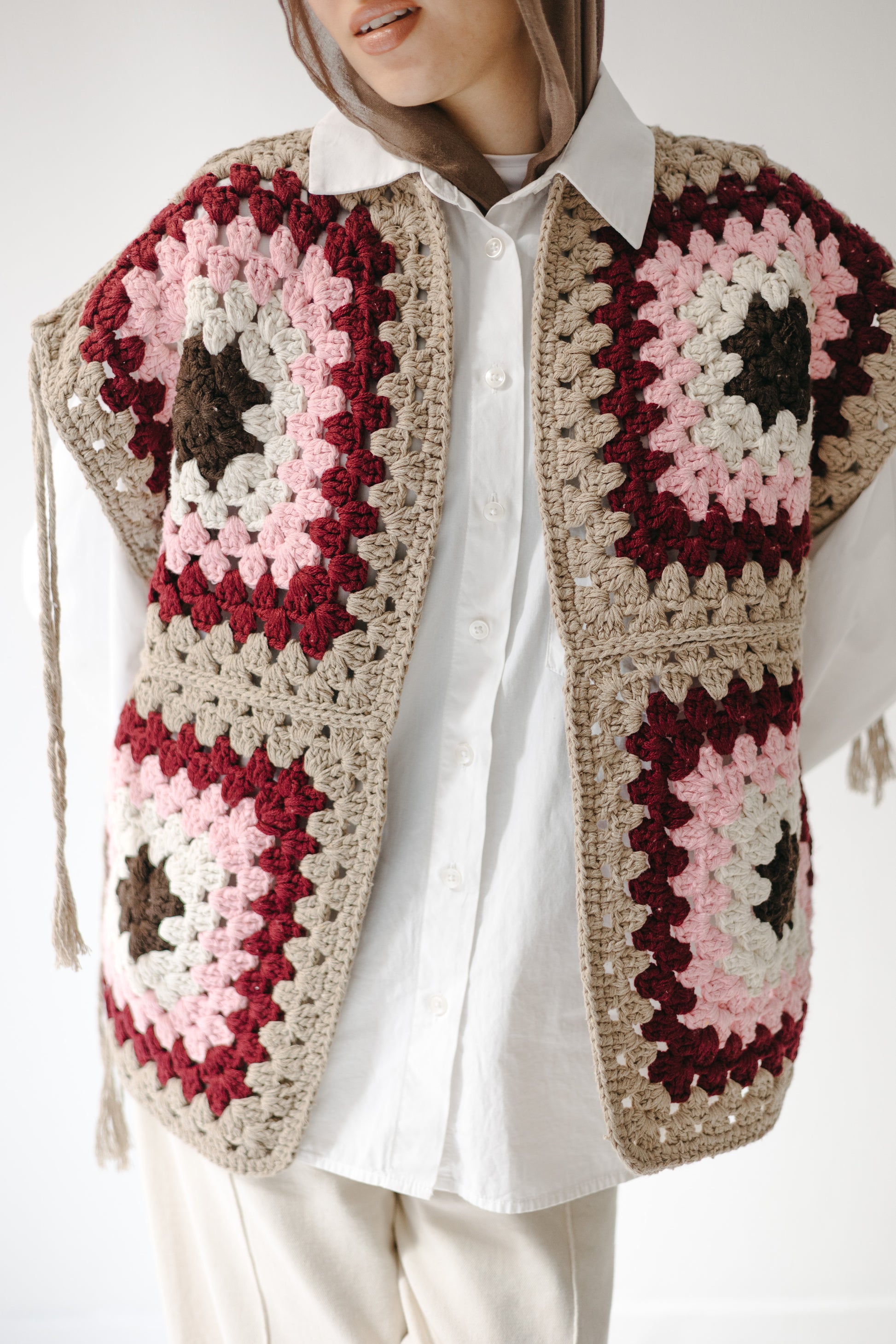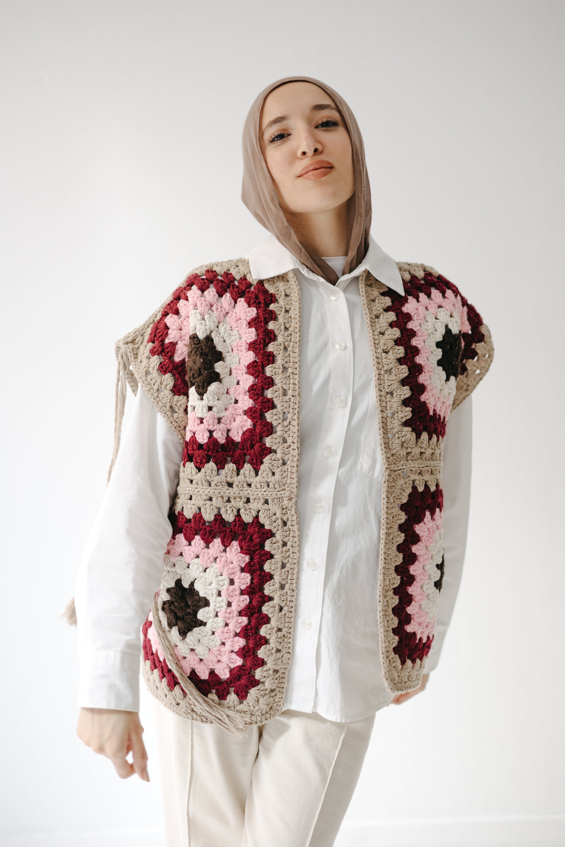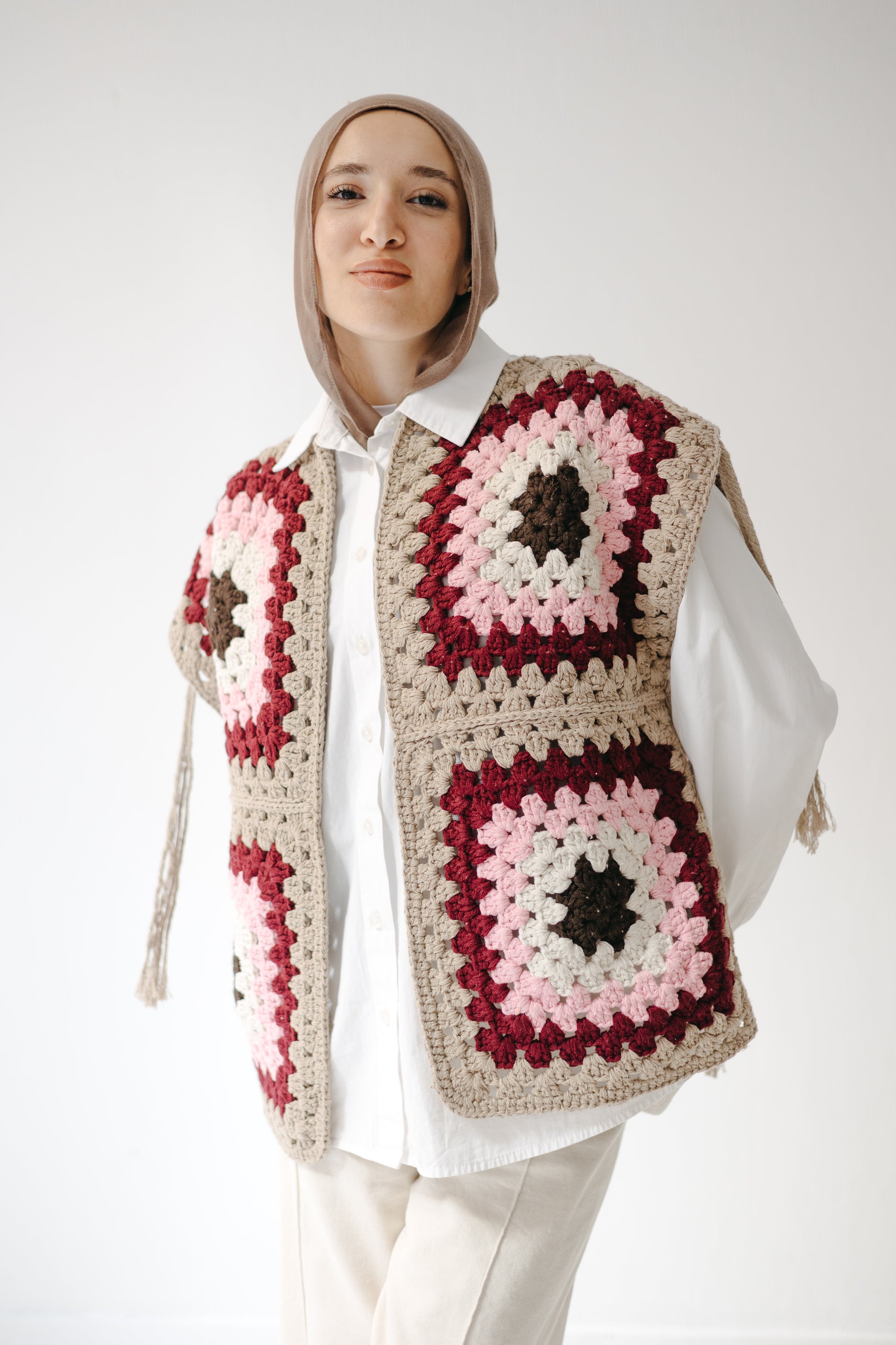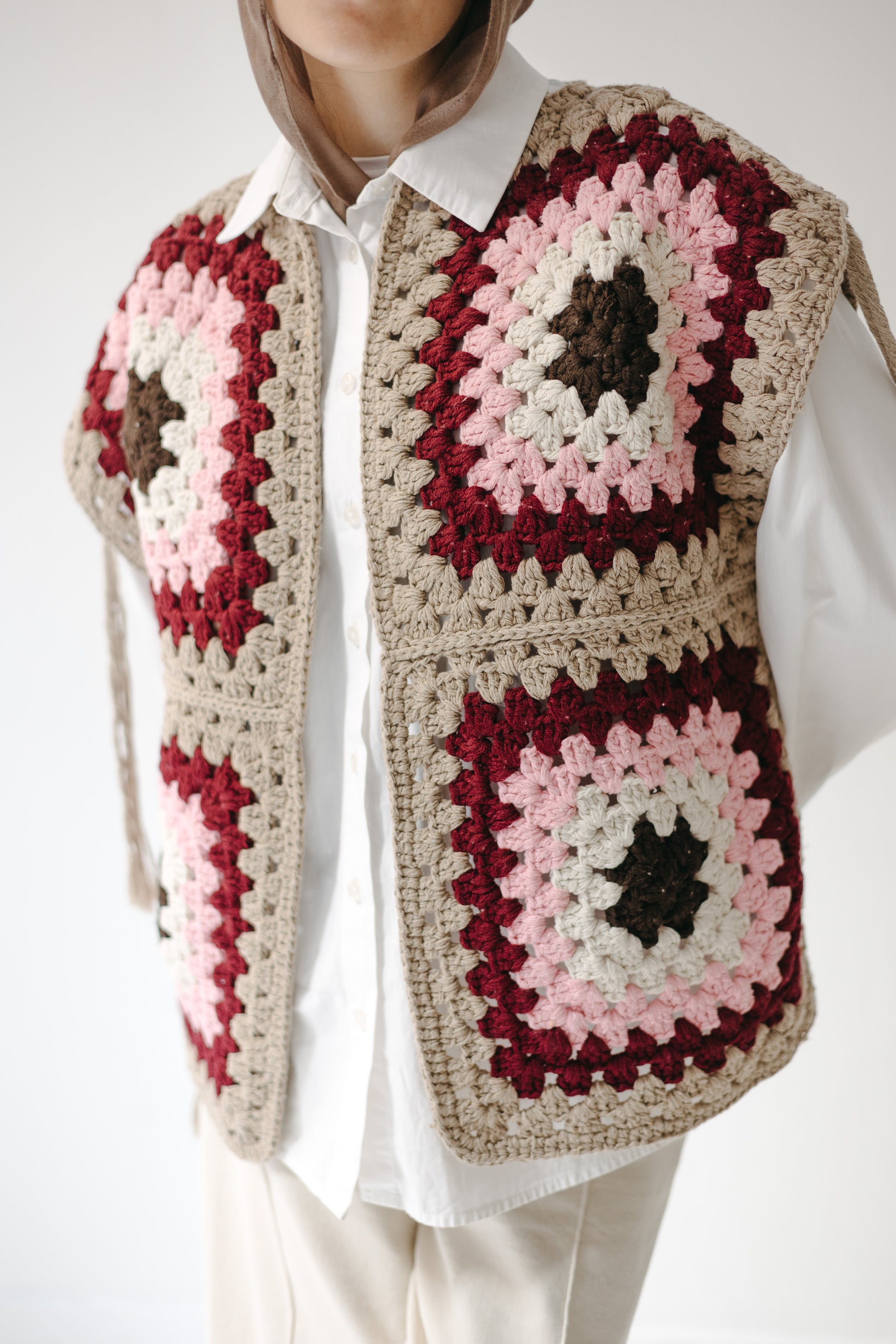 The Mosaic Vest is 100% handmade, designed from individually crocheted panels that come together in a textured patchwork of color and heritage. Its relaxed fit and open sides make it the perfect layering piece — balancing cozy nostalgia with modern ease.