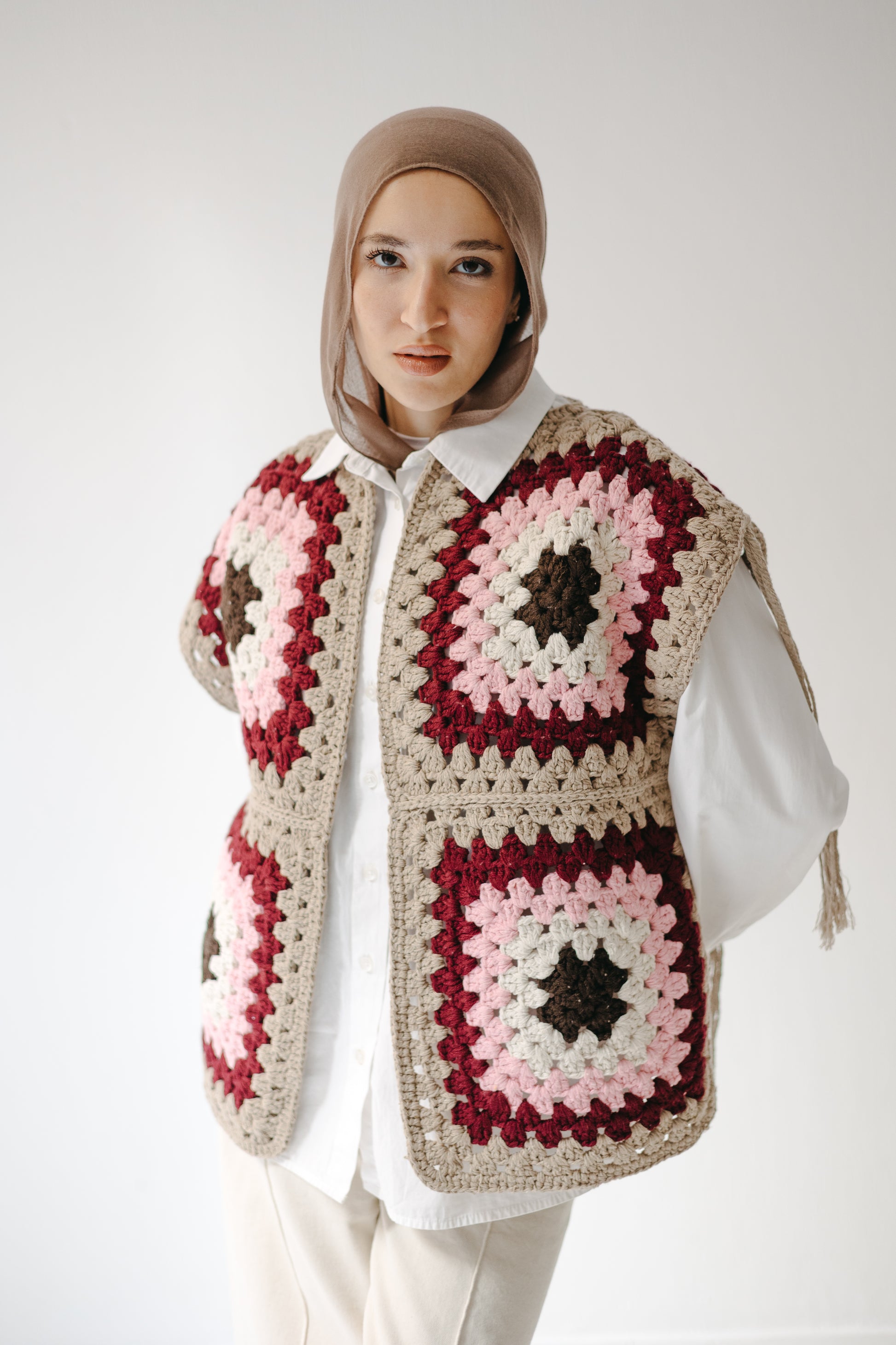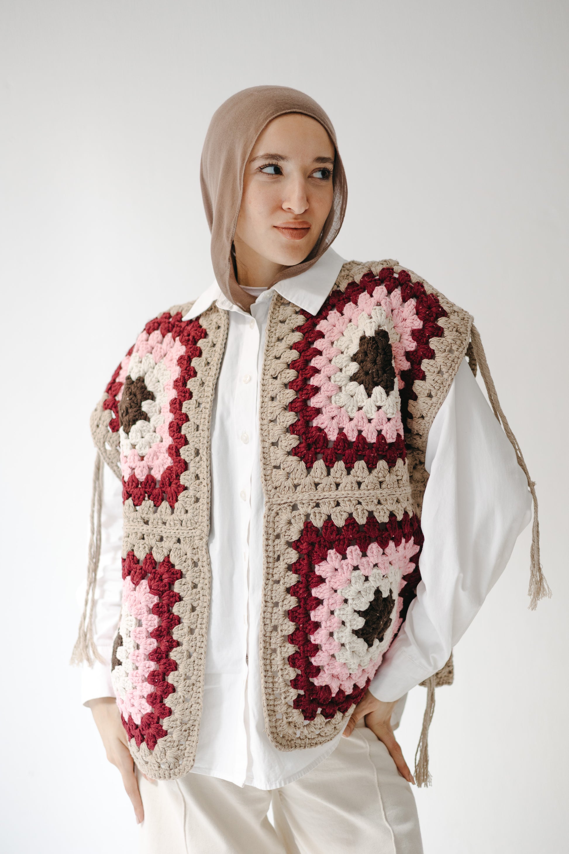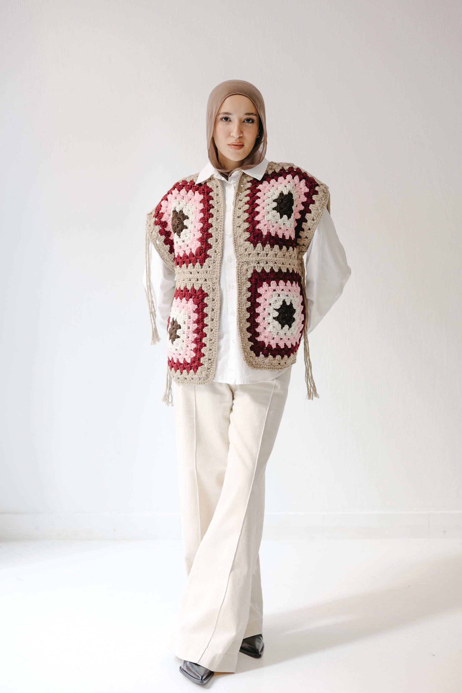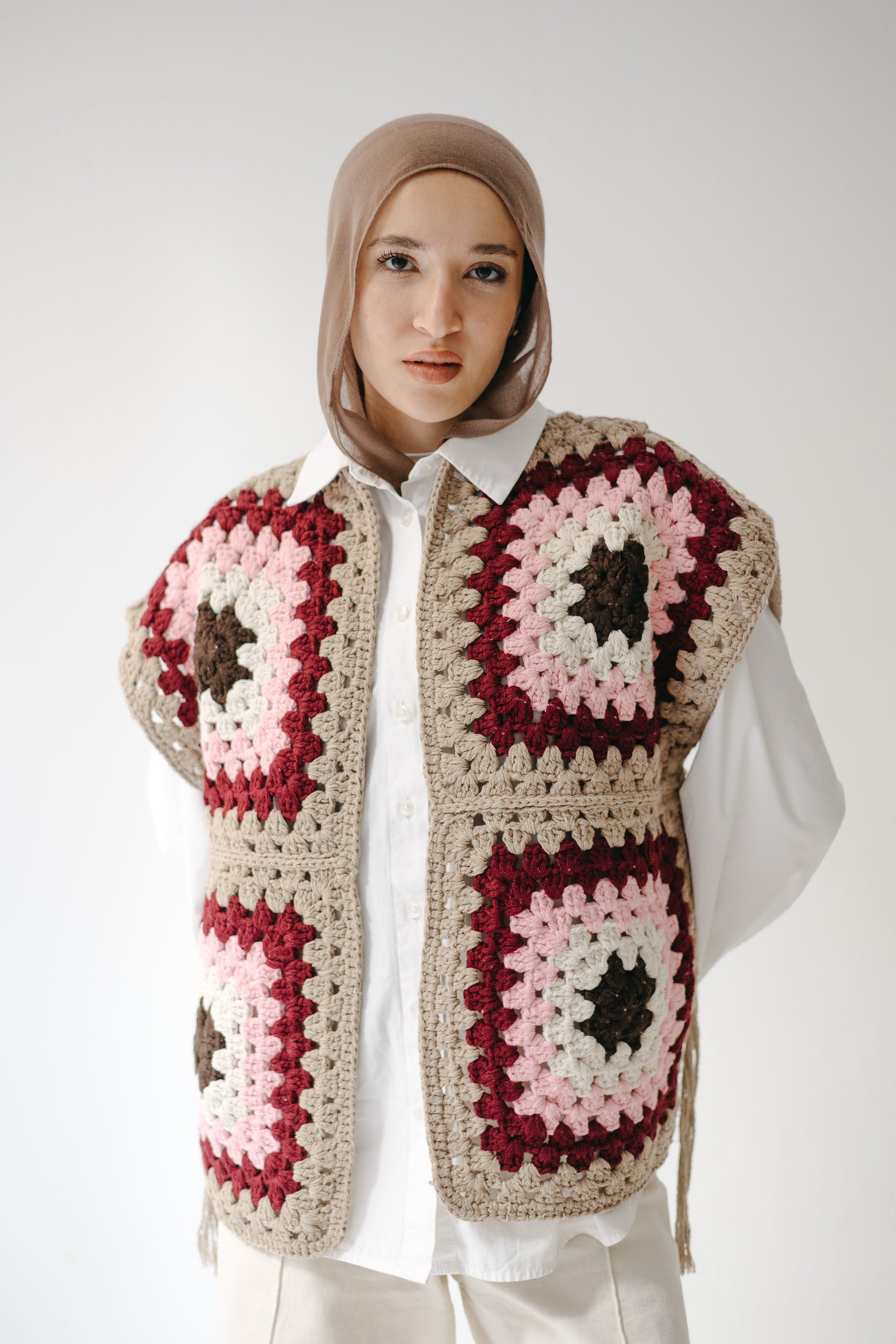 The Mosaic Vest is 100% handmade, designed from individually crocheted panels that come together in a textured patchwork of color and heritage. Its relaxed fit and open sides make it the perfect layering piece — balancing cozy nostalgia with modern ease.