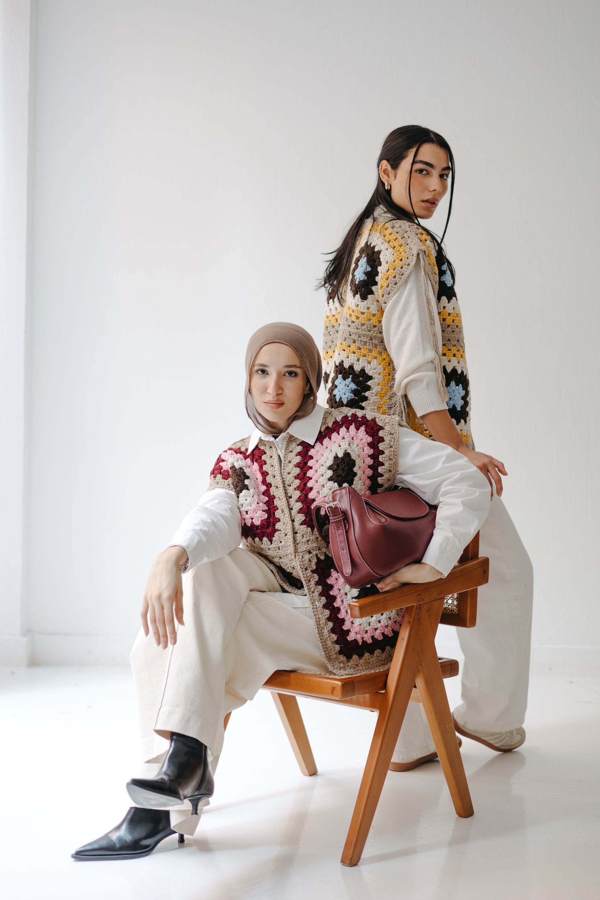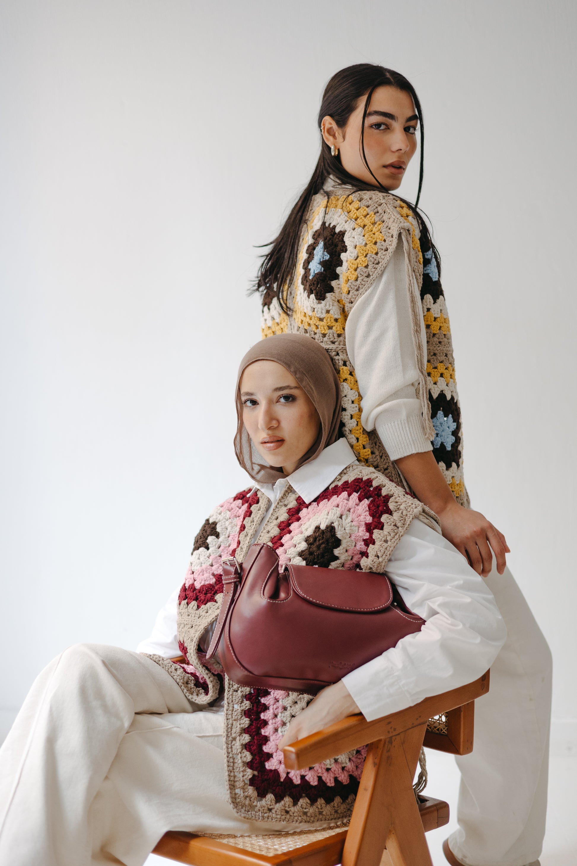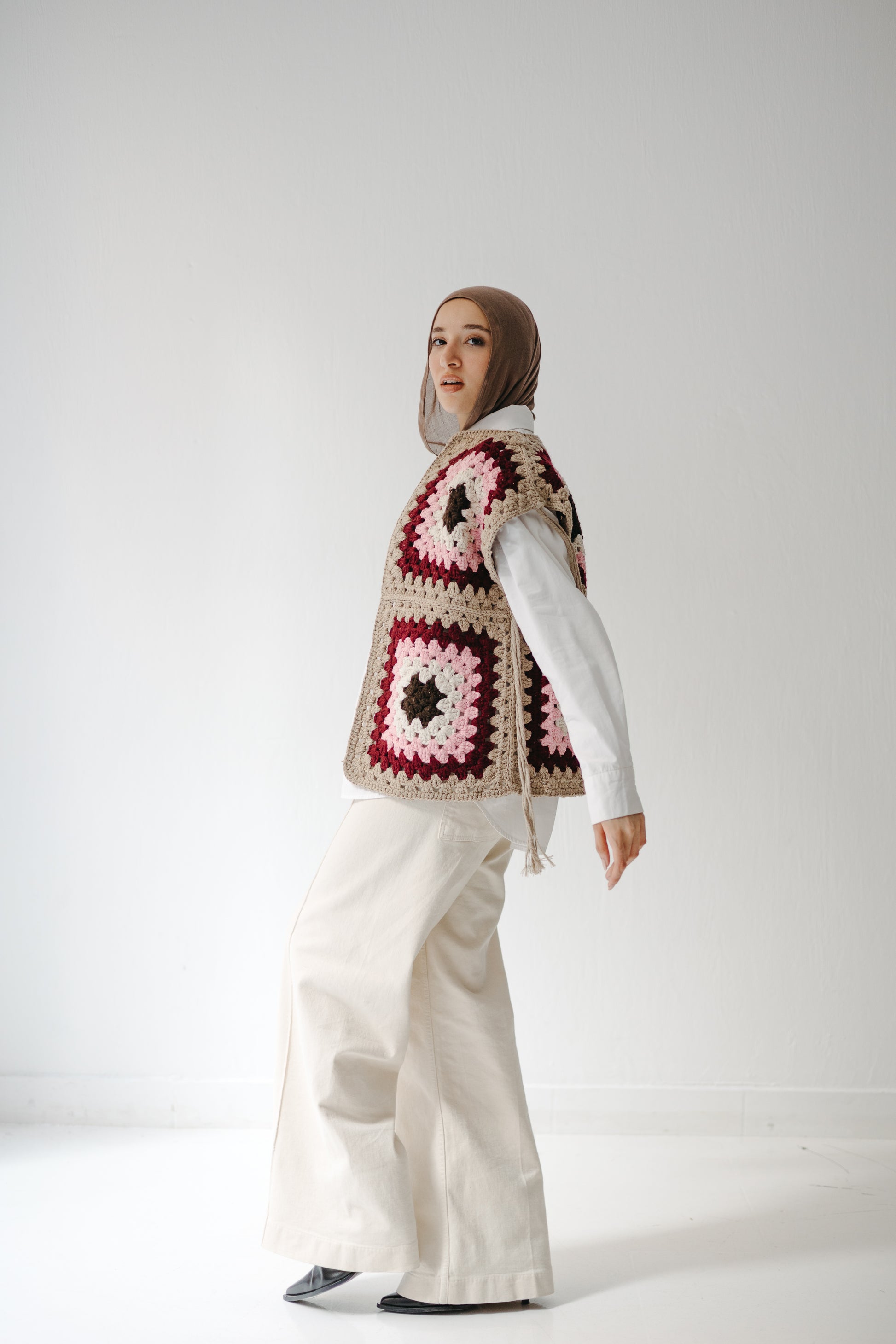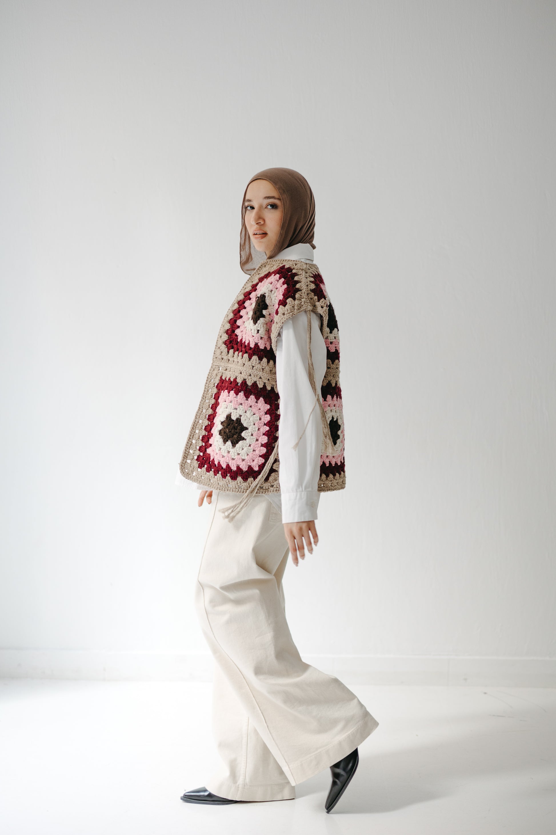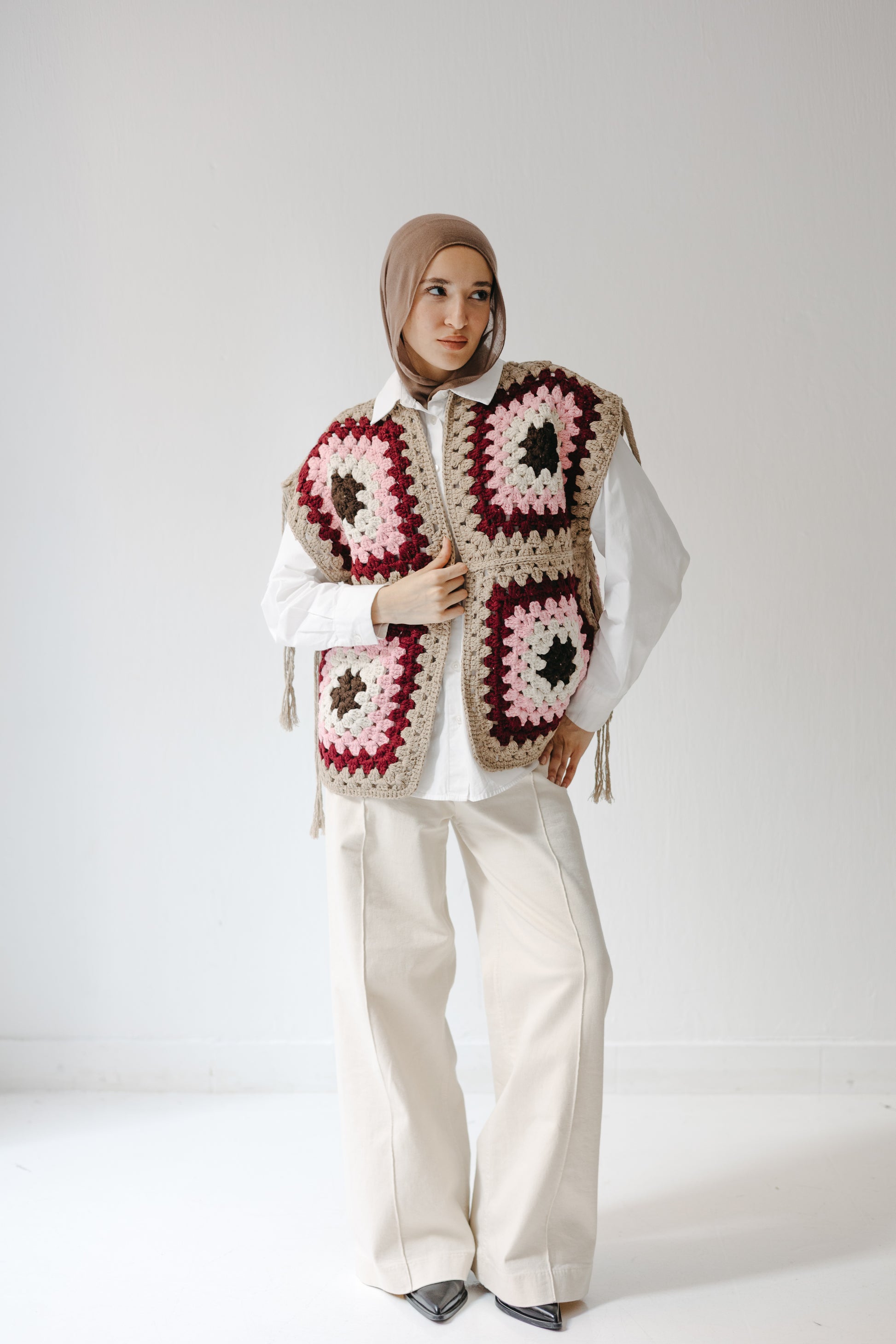The Mosaic Vest is 100% handmade, designed from individually crocheted panels that come together in a textured patchwork of color and heritage. Its relaxed fit and open sides make it the perfect layering piece — balancing cozy nostalgia with modern ease.