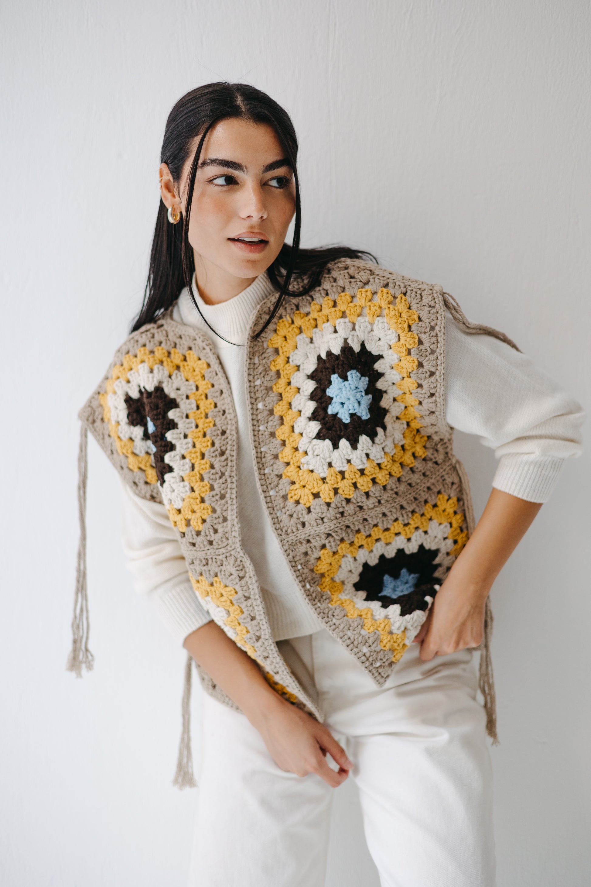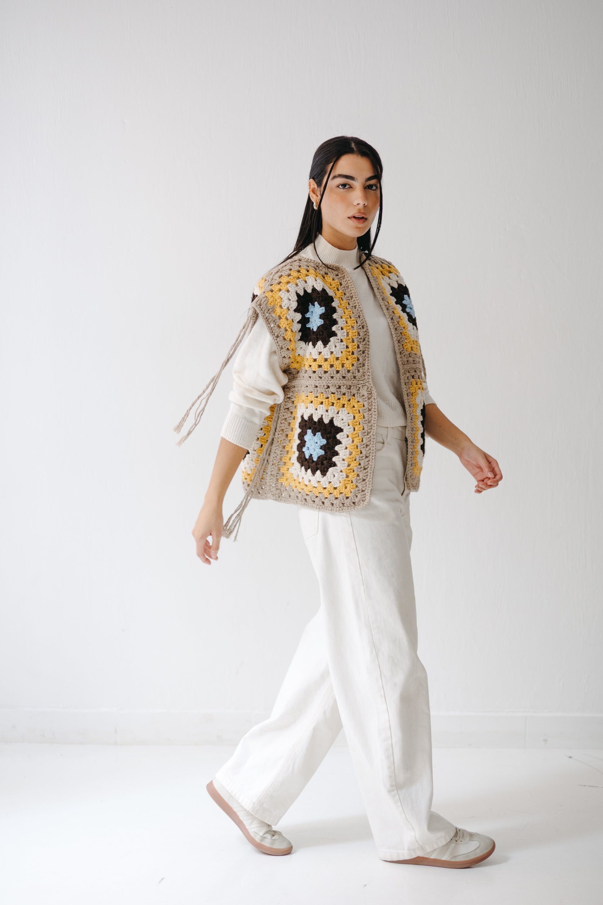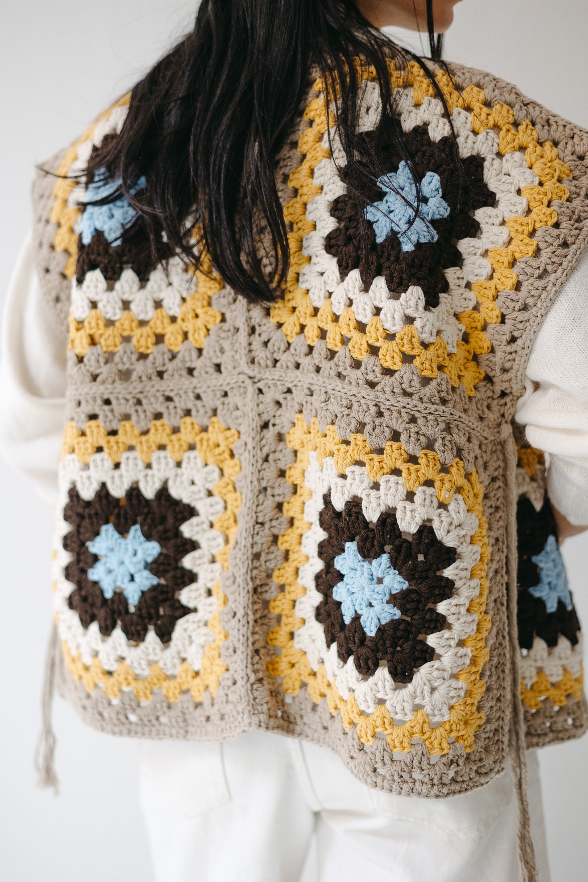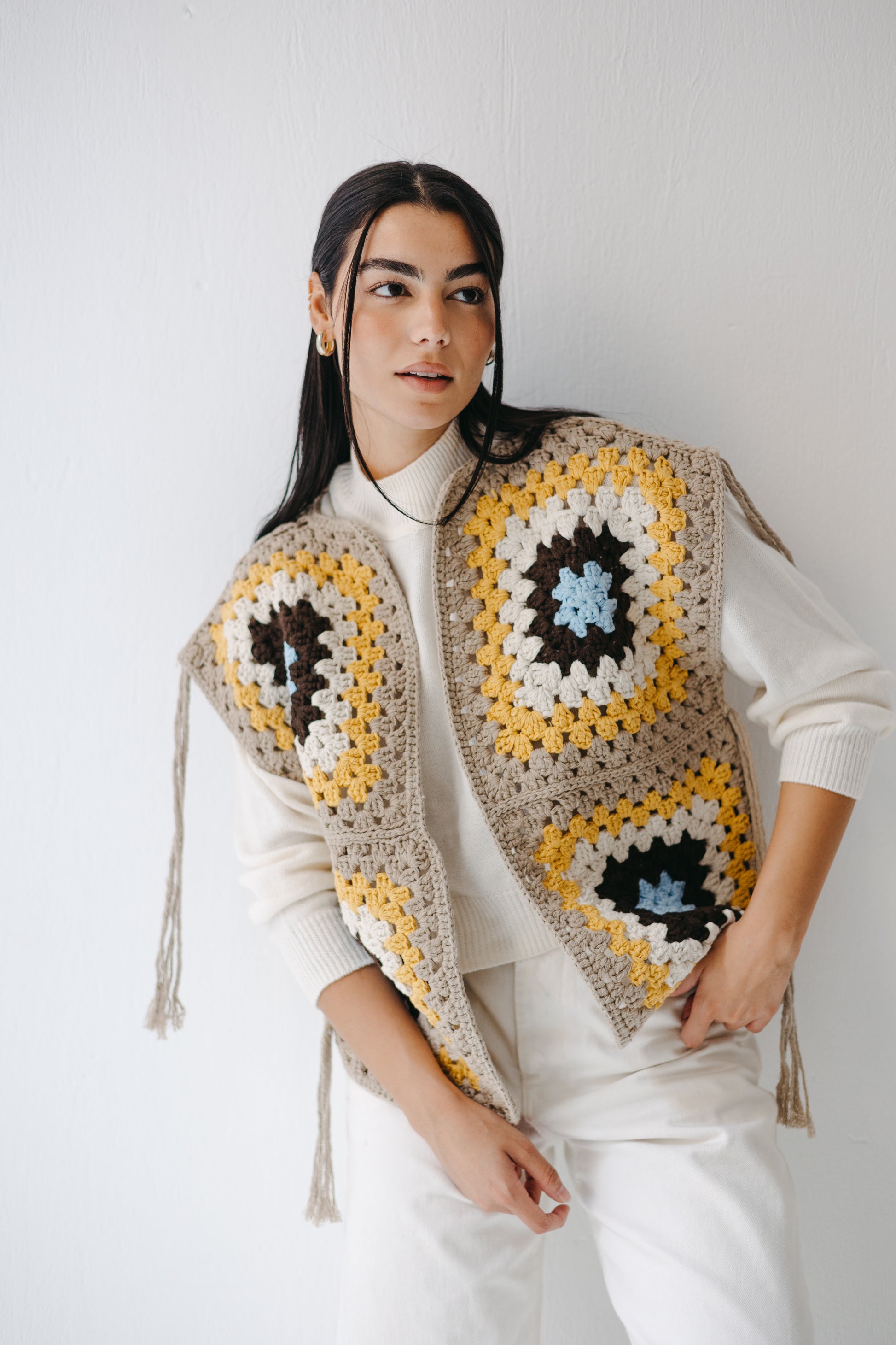 The Mosaic Vest is 100% handmade, designed from individually crocheted panels that come together in a textured patchwork of color and heritage. Its relaxed fit and open sides make it the perfect layering piece — balancing cozy nostalgia with modern ease.
