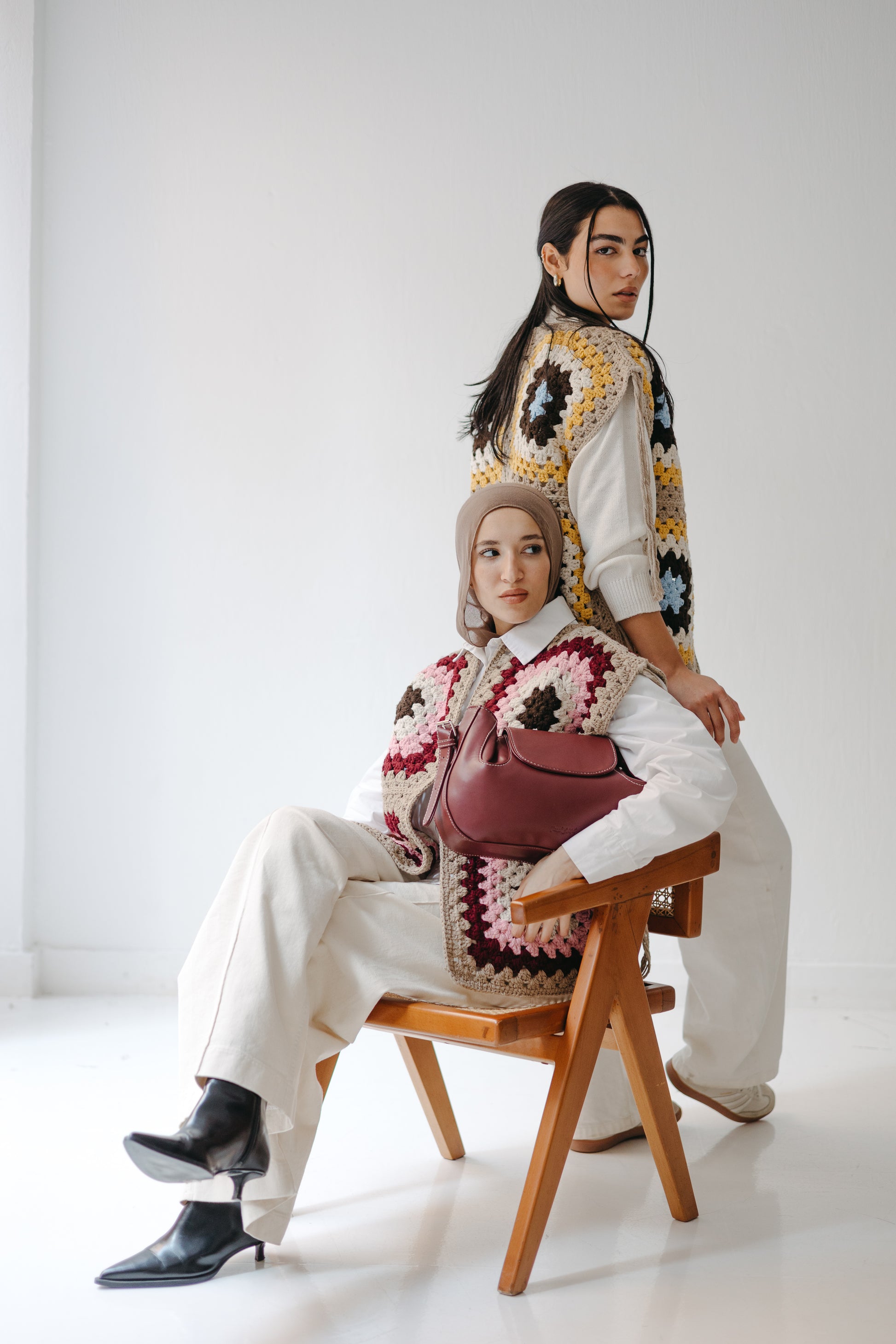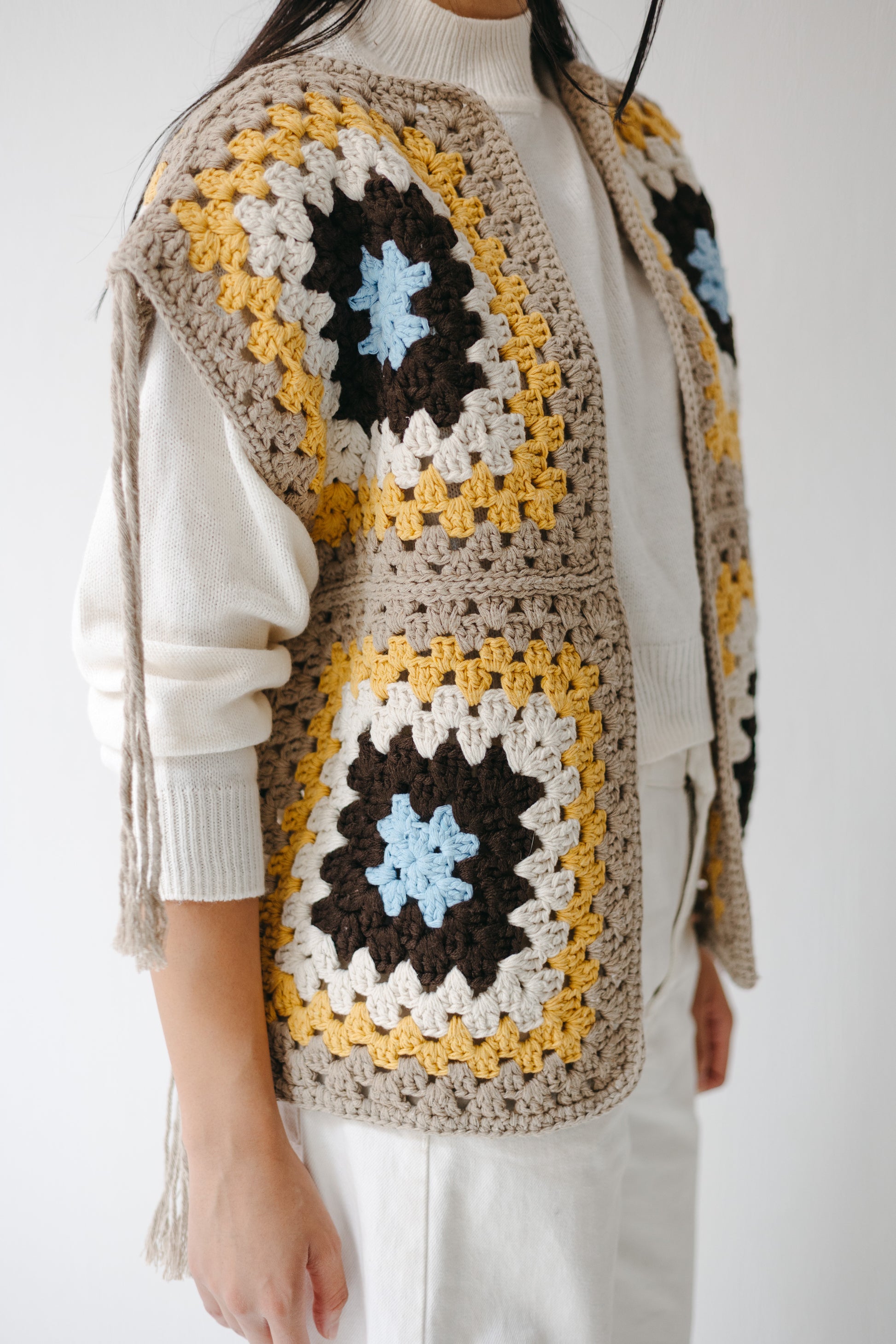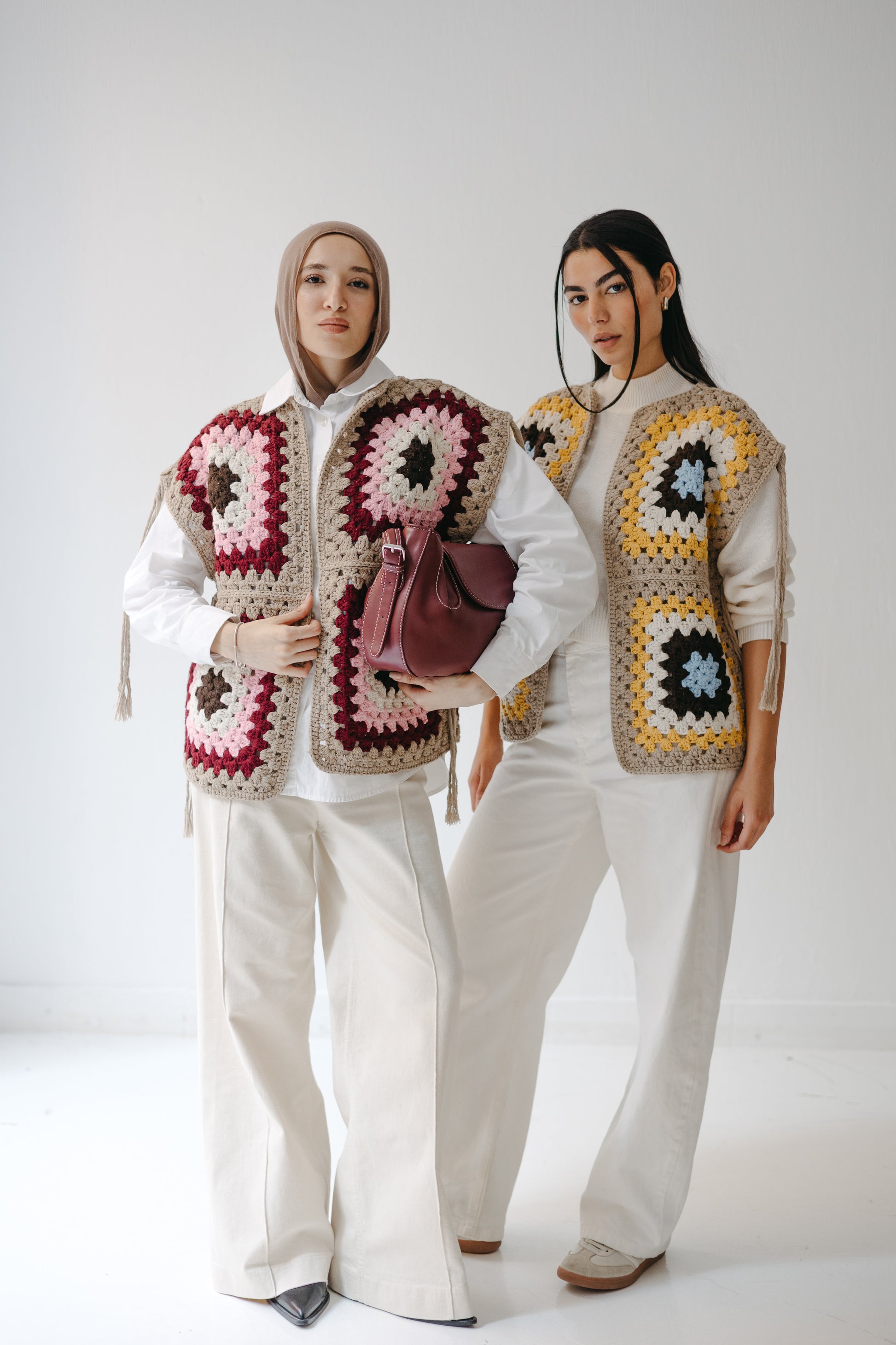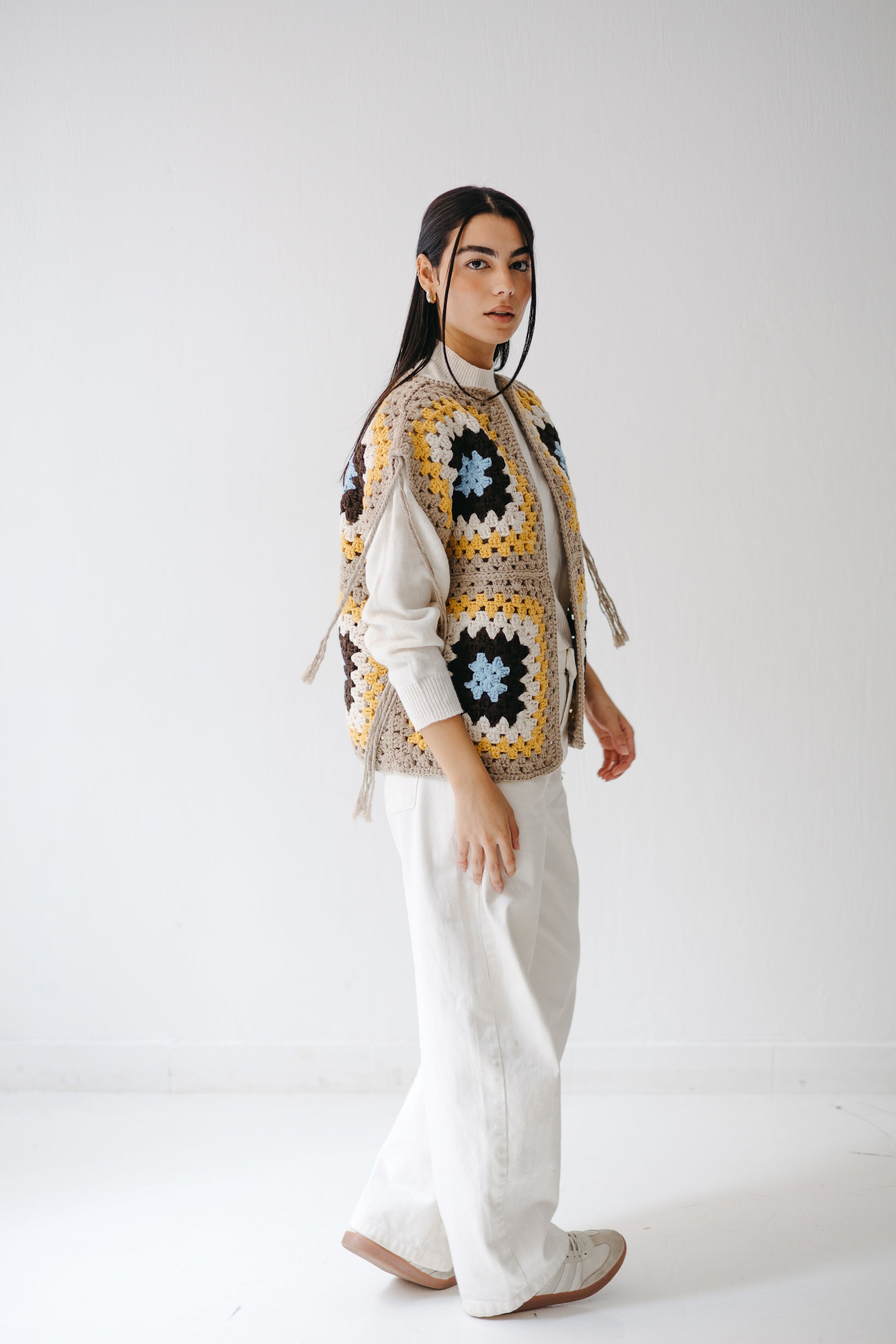 The Mosaic Vest is 100% handmade, designed from individually crocheted panels that come together in a textured patchwork of color and heritage. Its relaxed fit and open sides make it the perfect layering piece — balancing cozy nostalgia with modern ease.