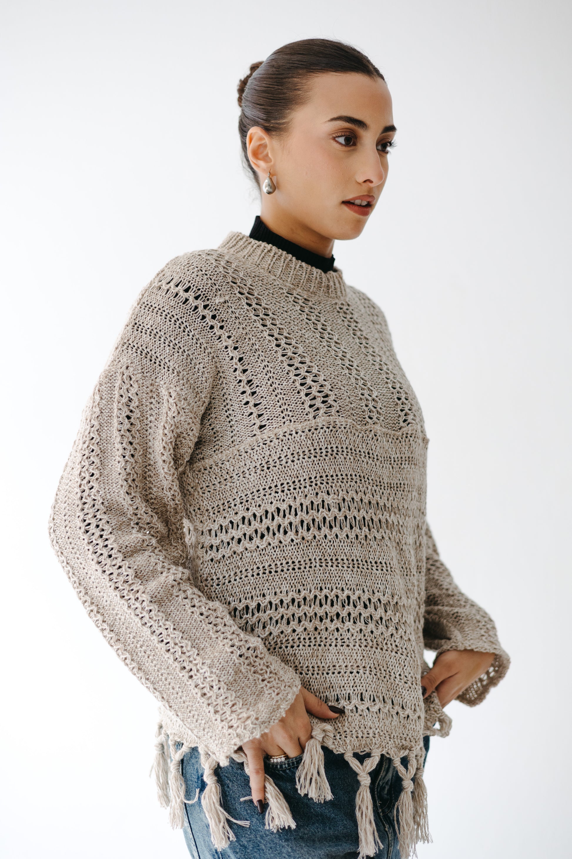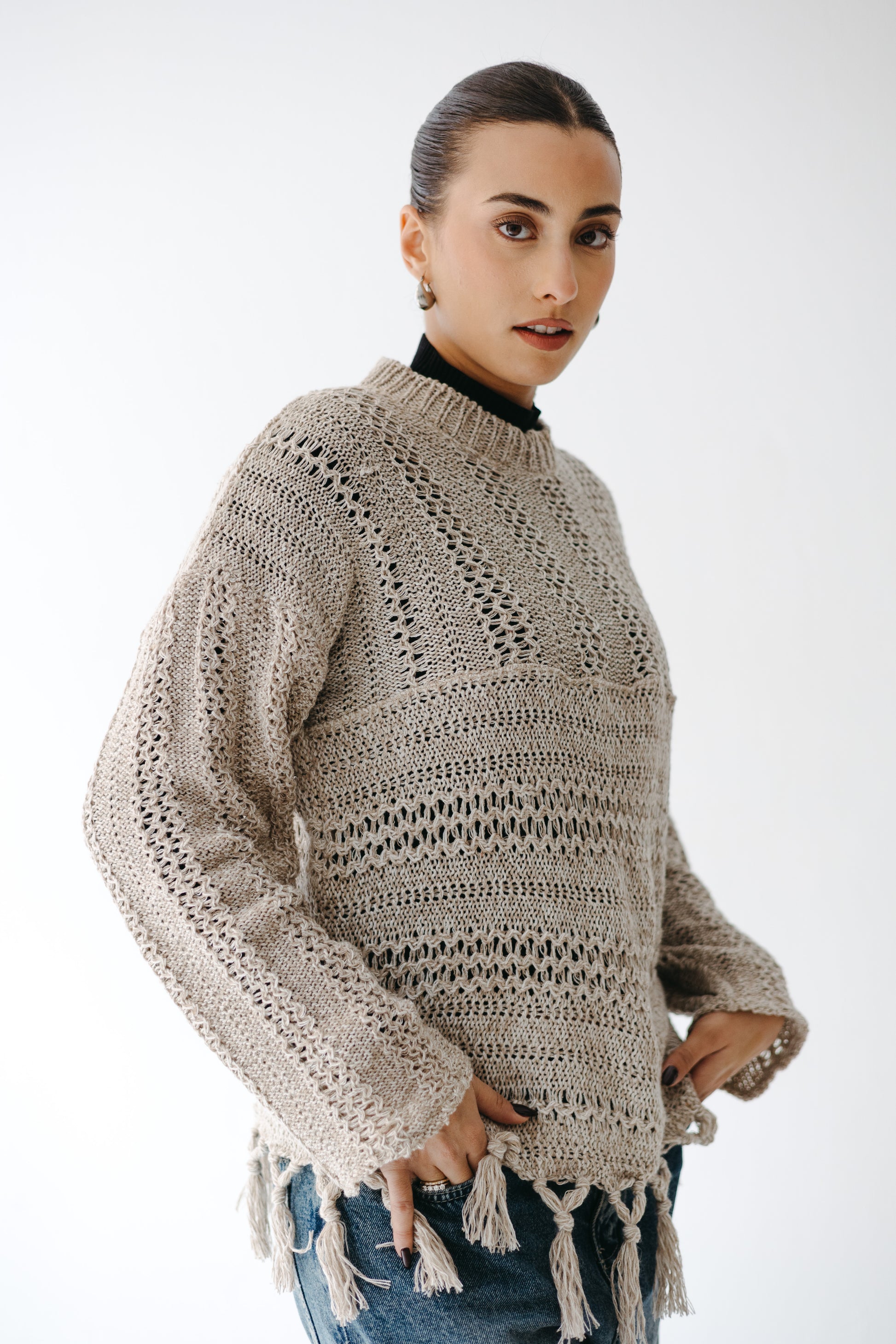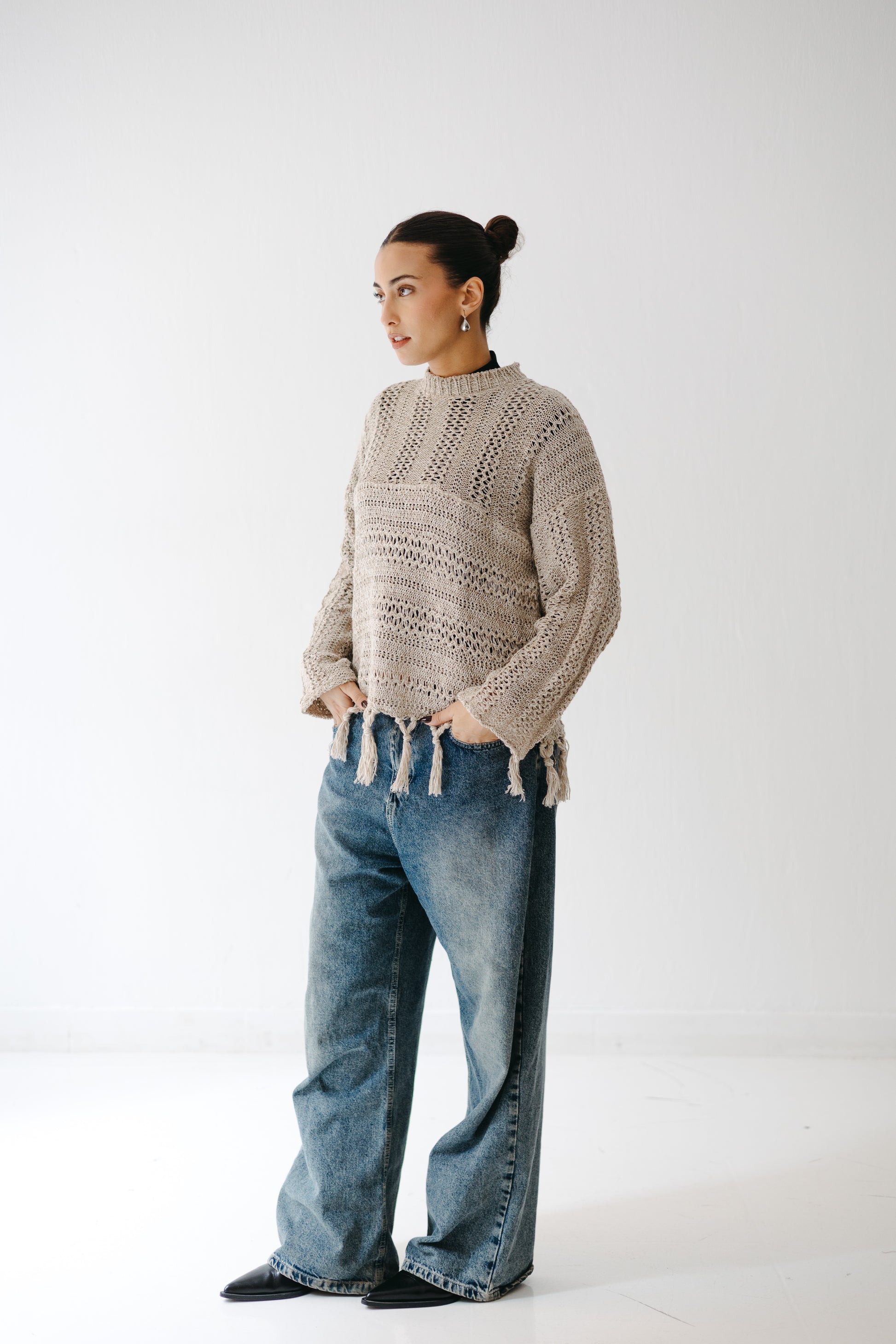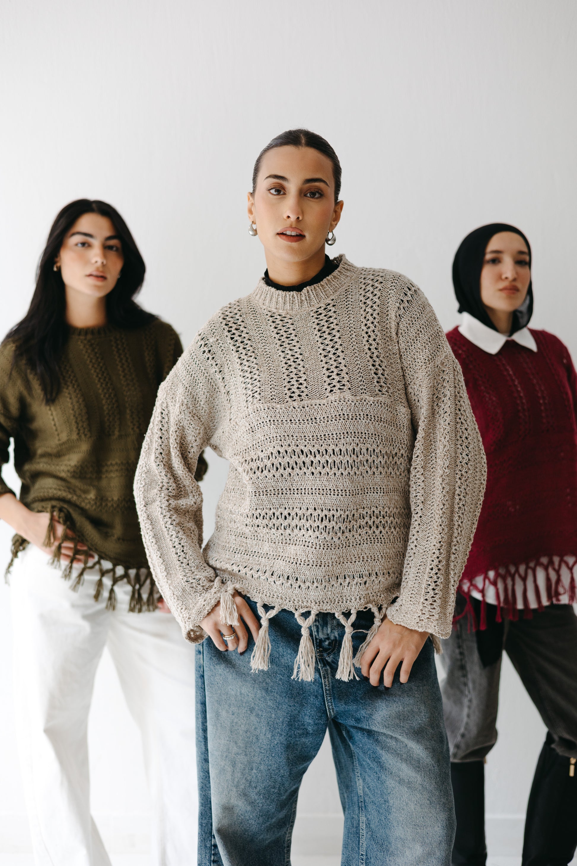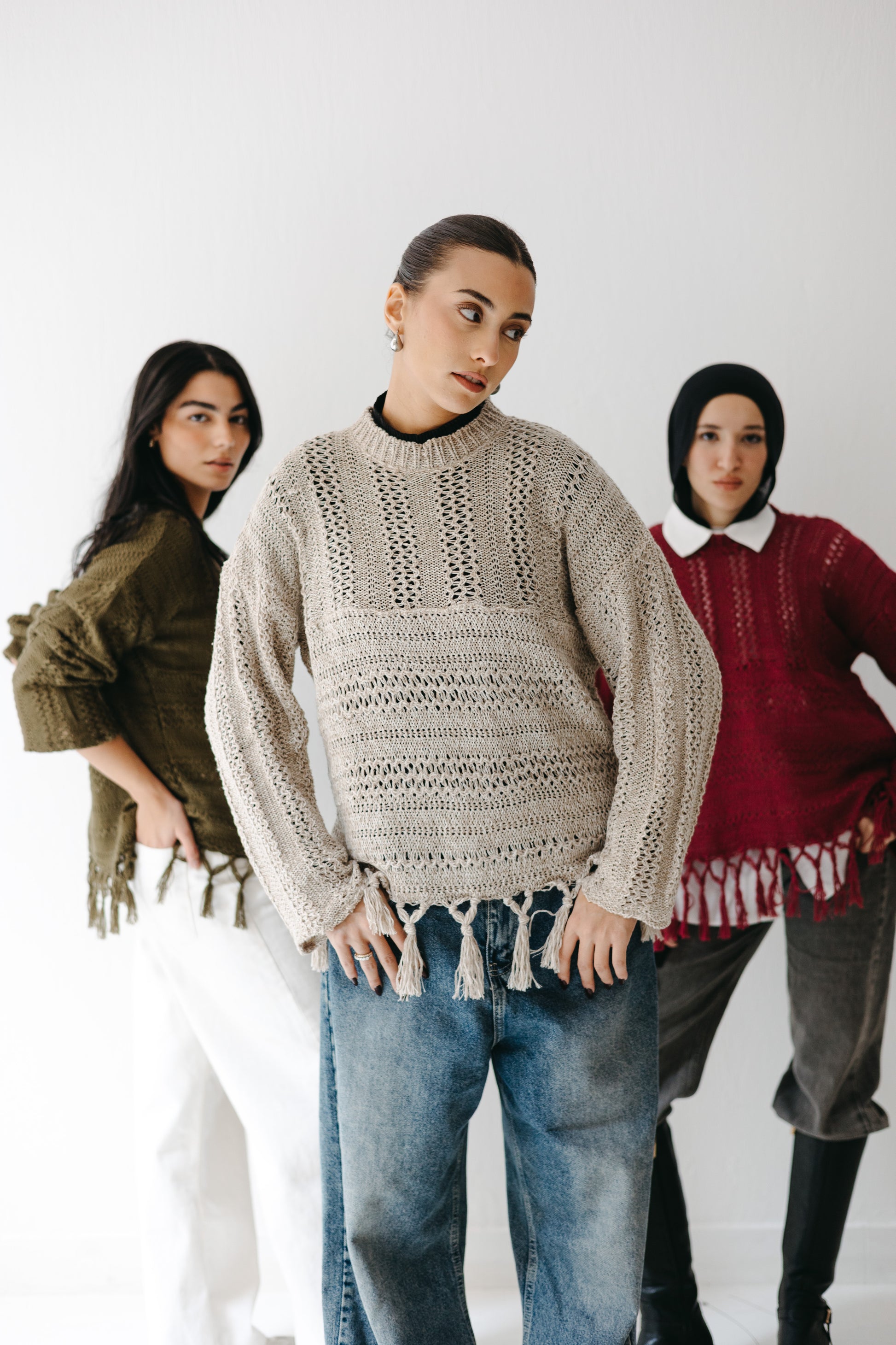 The Root Knit brings texture to simplicity — designed with open-knit patterns and soft tassel detailing that echo the quiet rhythm of nature. Its relaxed silhouette layers effortlessly, adding a touch of artisanal charm to cold-weather minimalism.