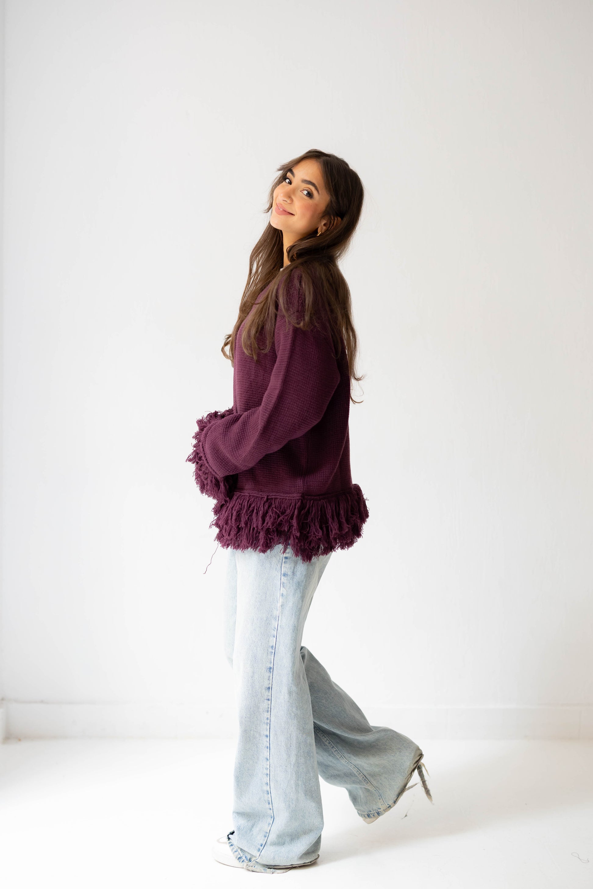 Move with playful elegance in the Twirl Fringed Jacket – a soft knitted piece with dynamic fringes cascading down and along the sleeves, adding fun, movement, and a chic boho vibe to any outfit